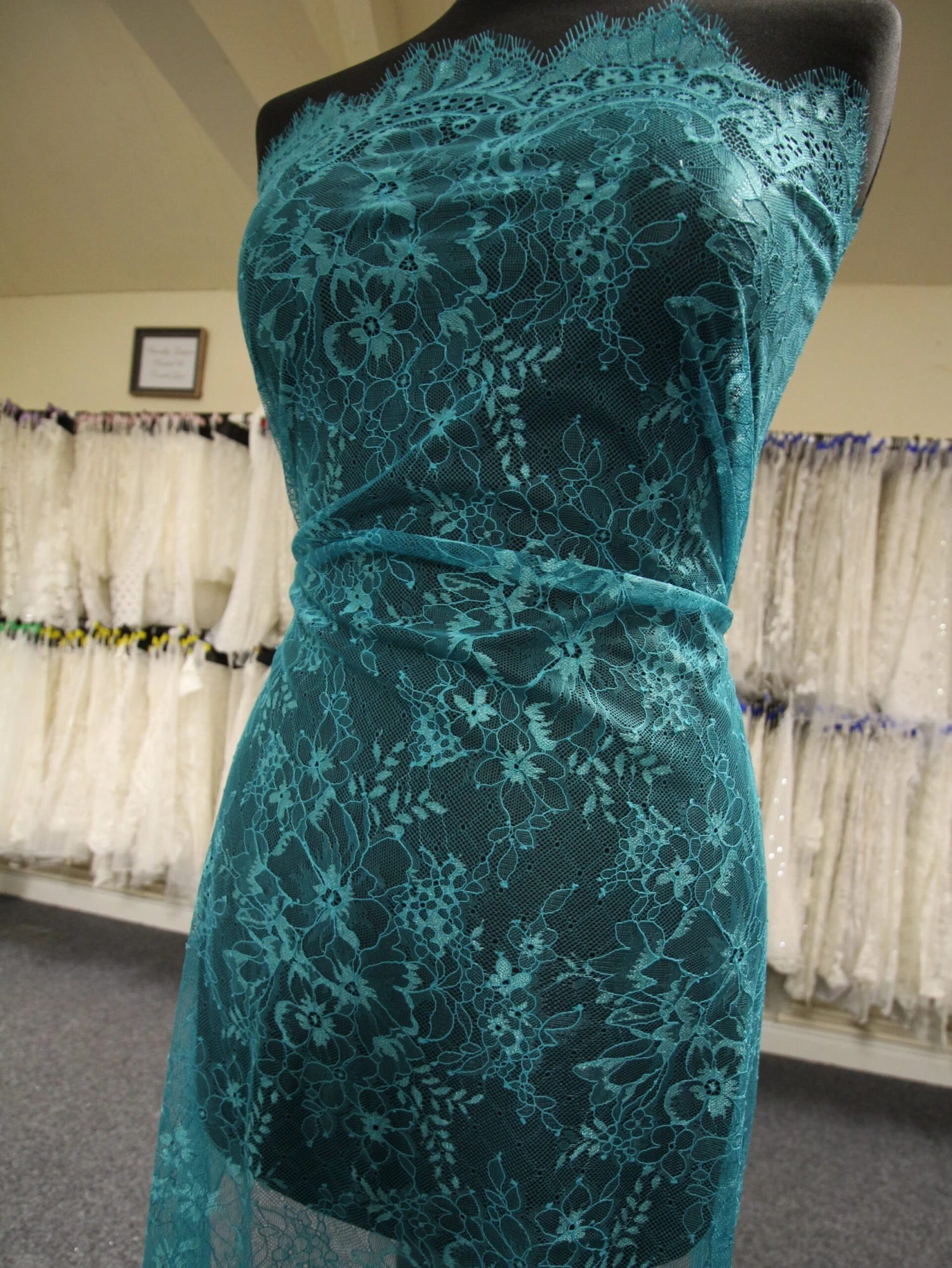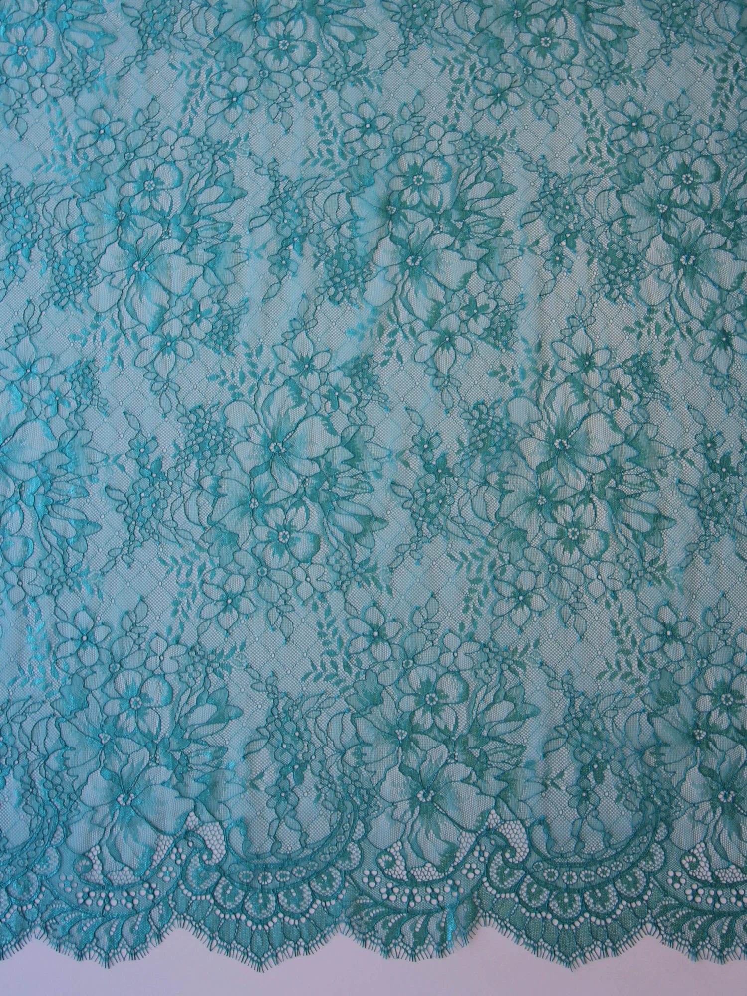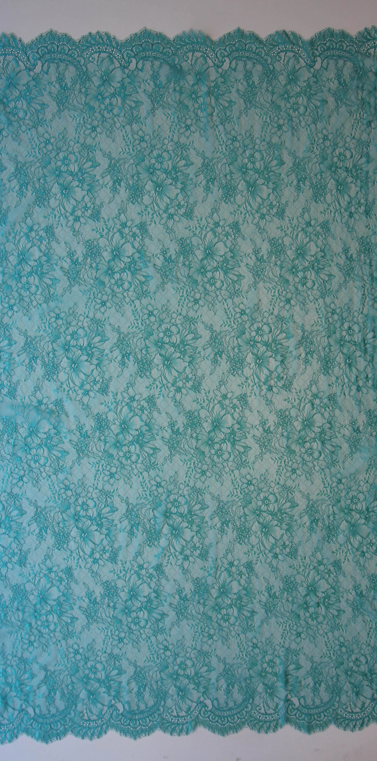 AÂ lightweight aqua blue lace with an all over floral design, that measures 142 cm (56″) from edge to edge across the width.