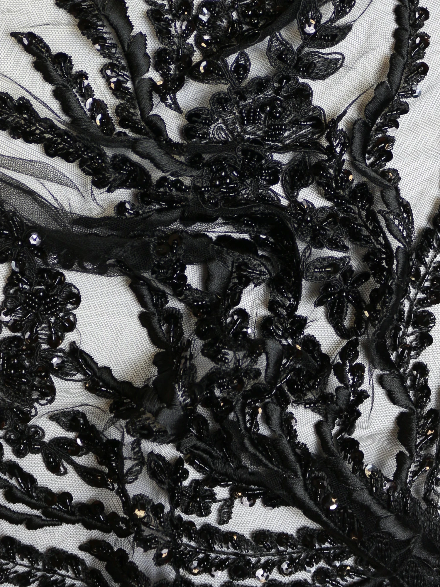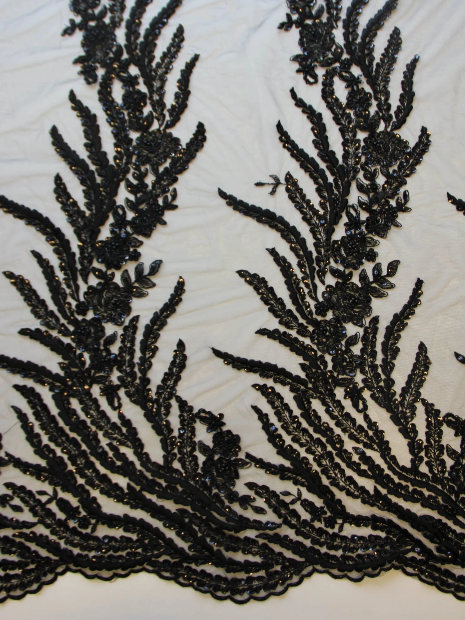 A striking lace composed of a Black tulle base, which has been embroidered with an eye-catching design that extends from one edge within 10 cm (4″) of the other.