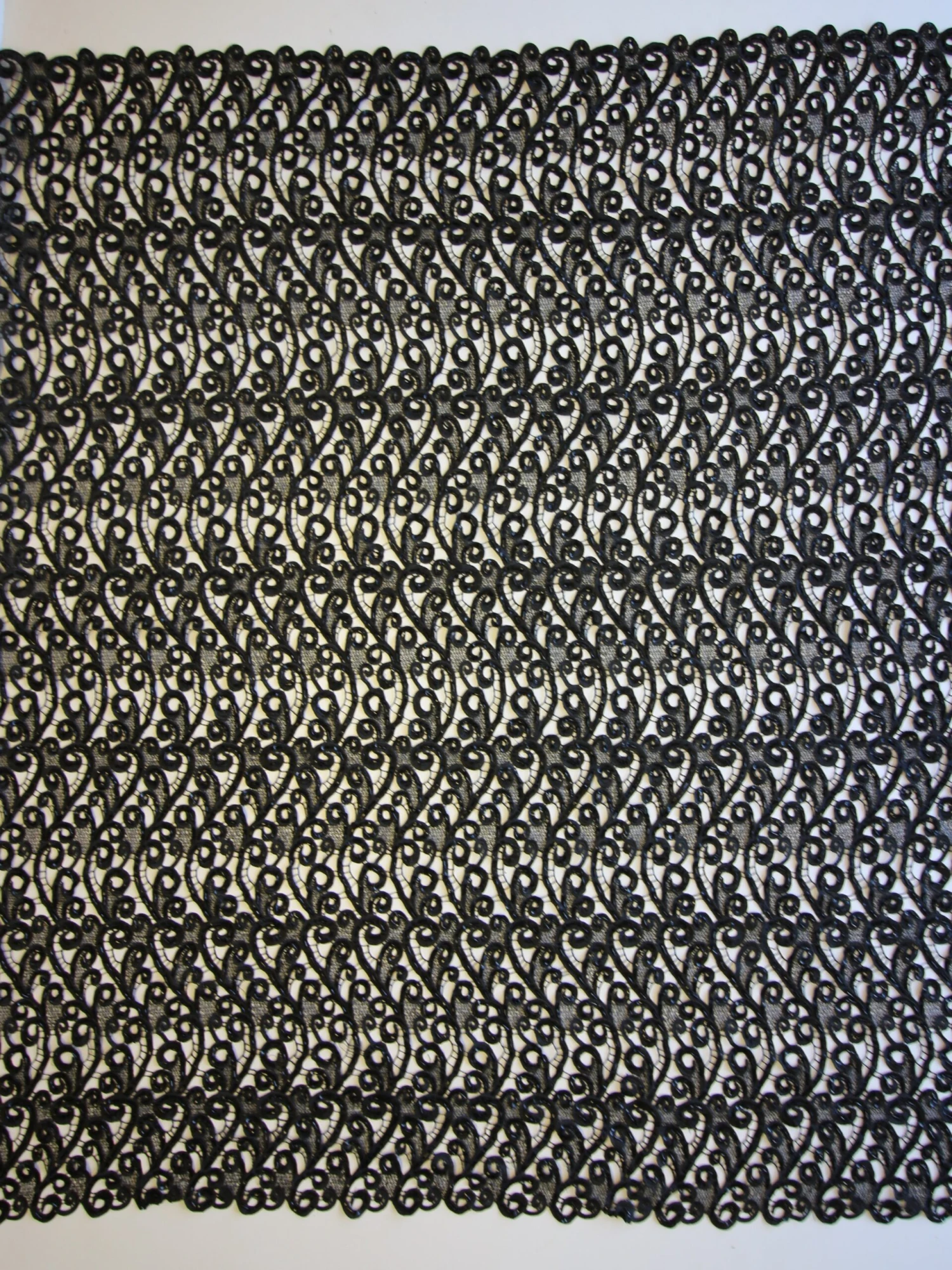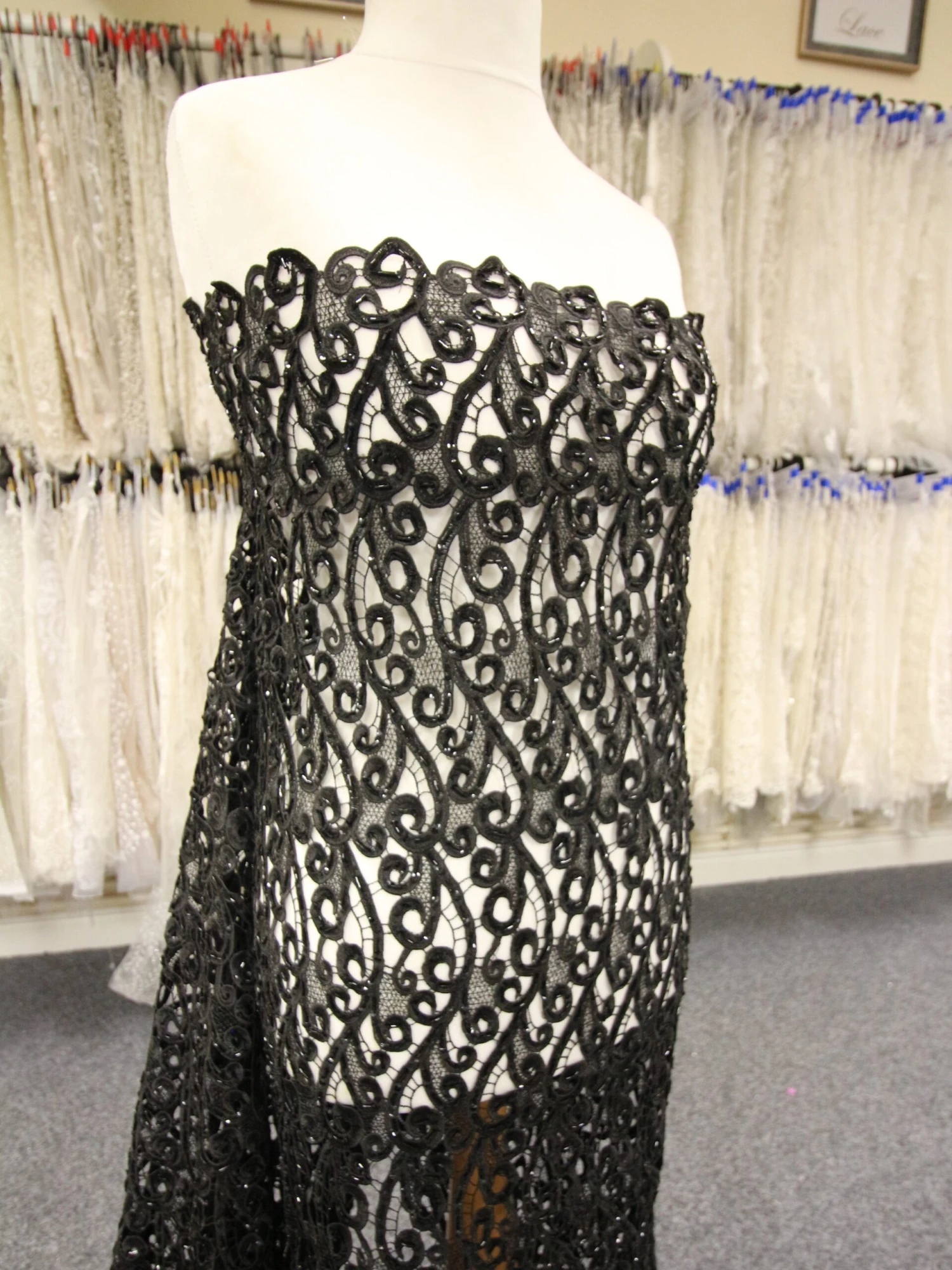 A chic, modern black lace with an adornment of beads and sequins to add sparkle. The non-floral contemporary design features swirls and has an open weave as opposed to a tulle base. An attractive design for evening wear and special occasion wear this lace is available from stock with no minimums and international delivery. It measures 132 cm (52″) wide.
