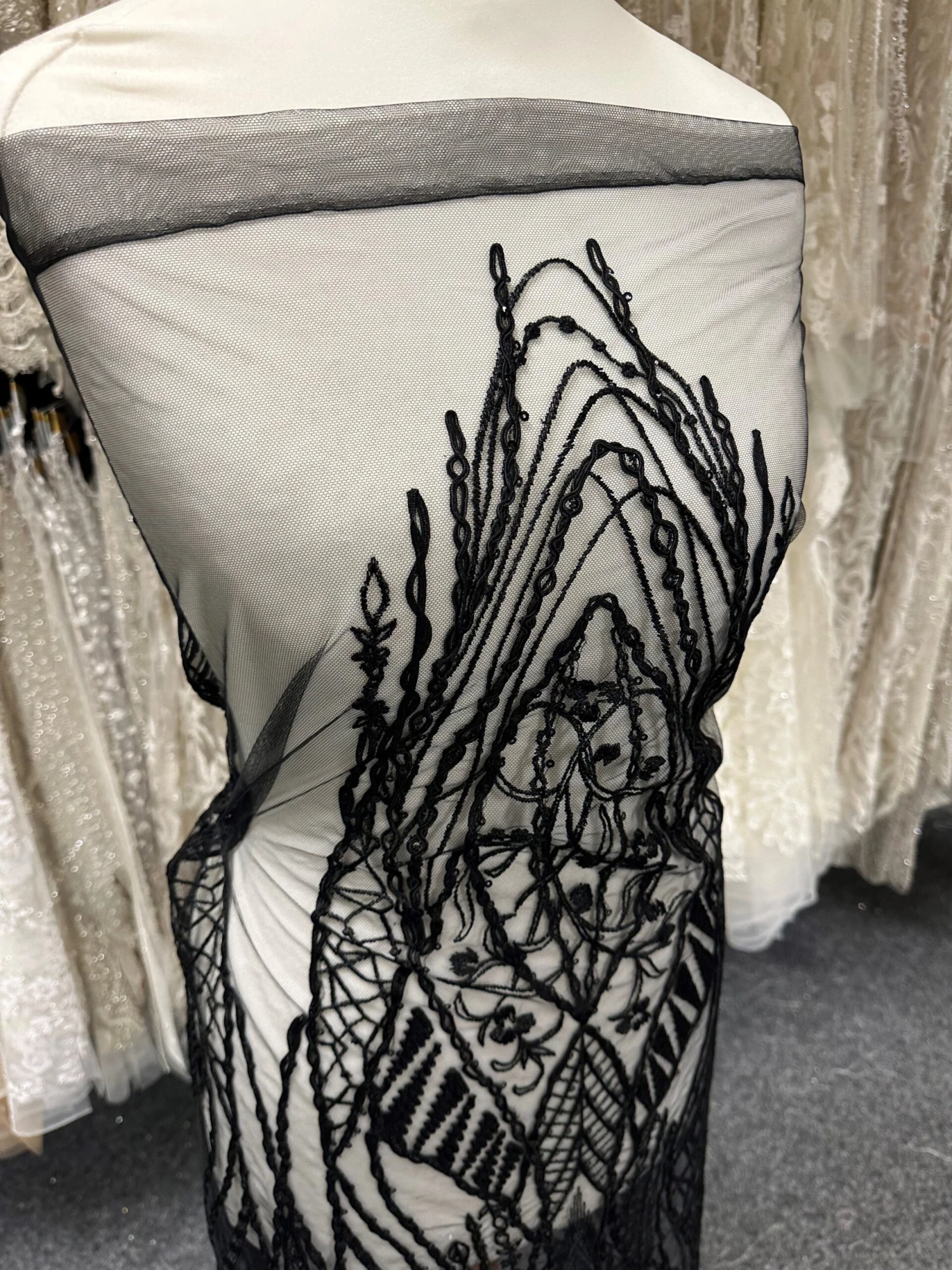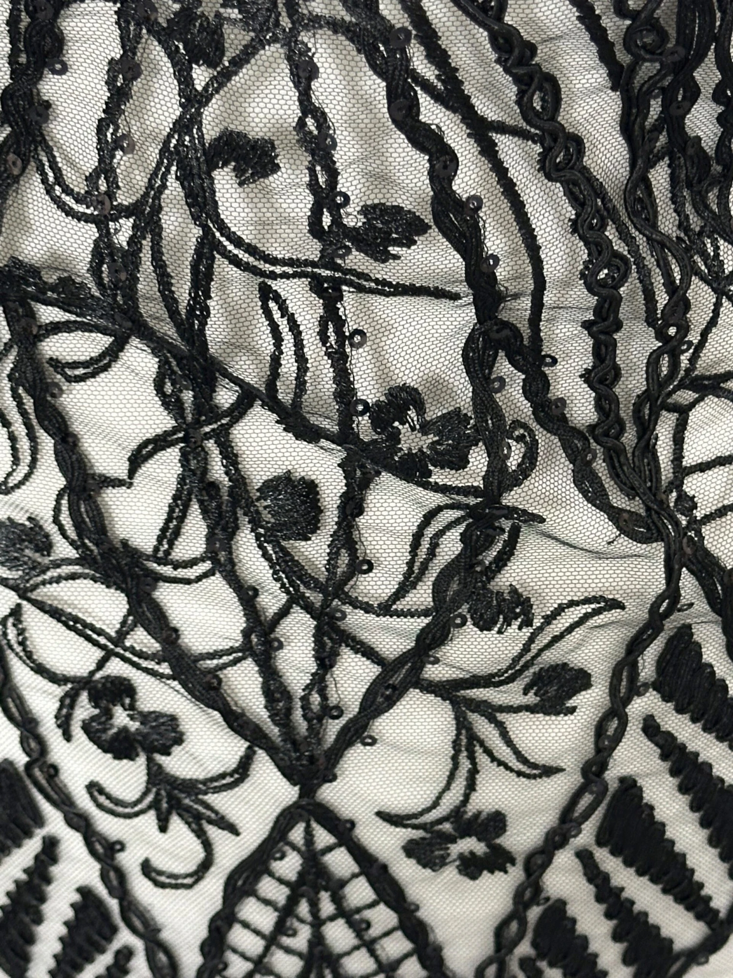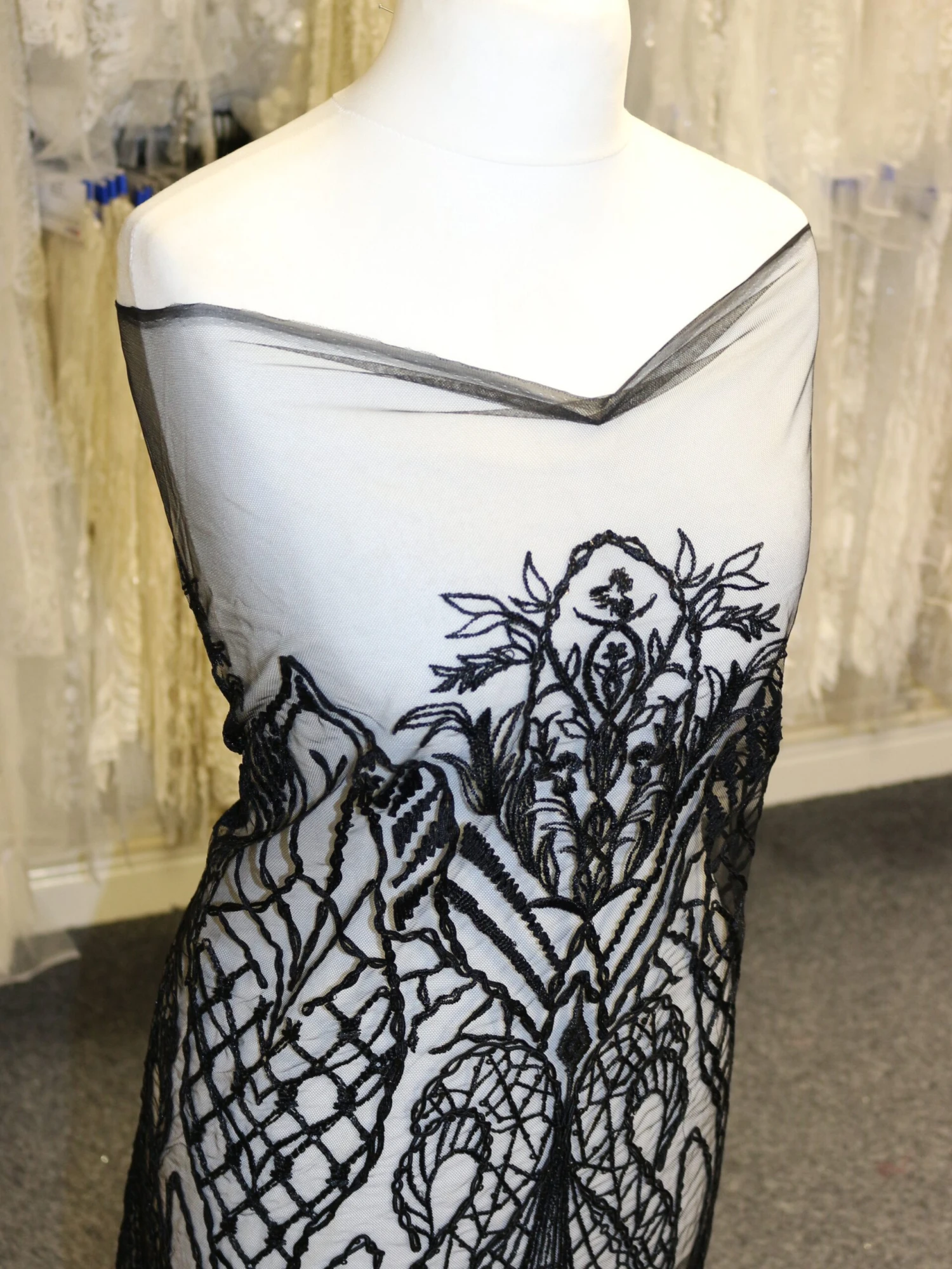 A decadent black lace with sequinned details on top of corded embroidery, this lace is a top selling lace for alternative bridal and evening wear. Its eye-catching design represents a non-floral option and is genuinely stunning! This lace measures 132 cm (52″) wide and is well worth ordering a free sample so evaluate the quality of this lace for yourself.