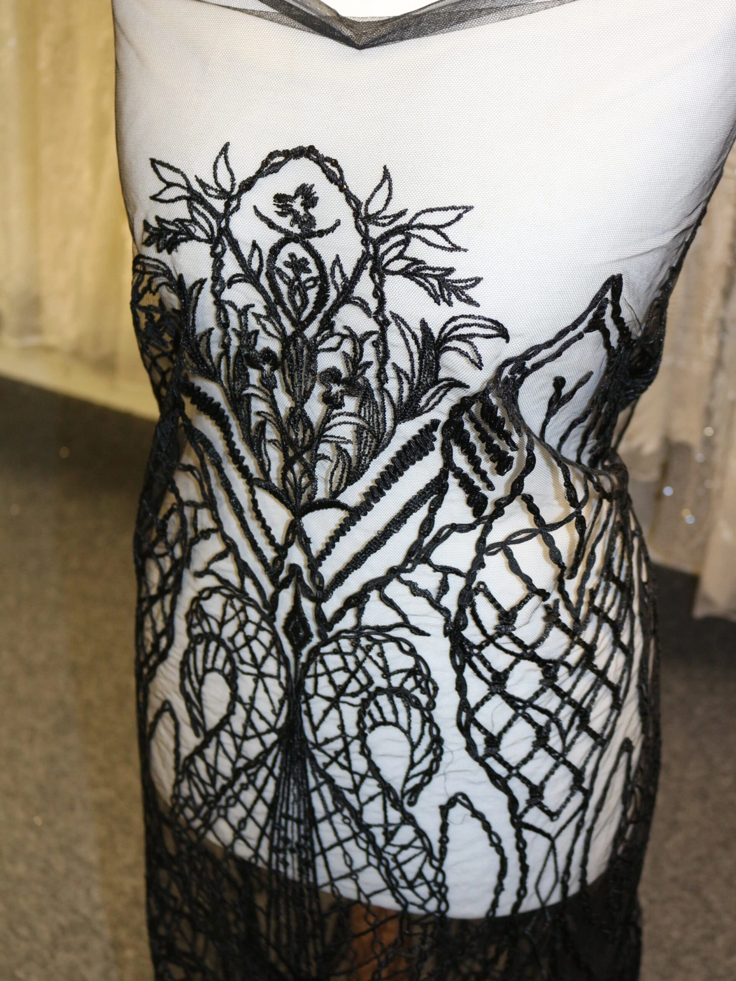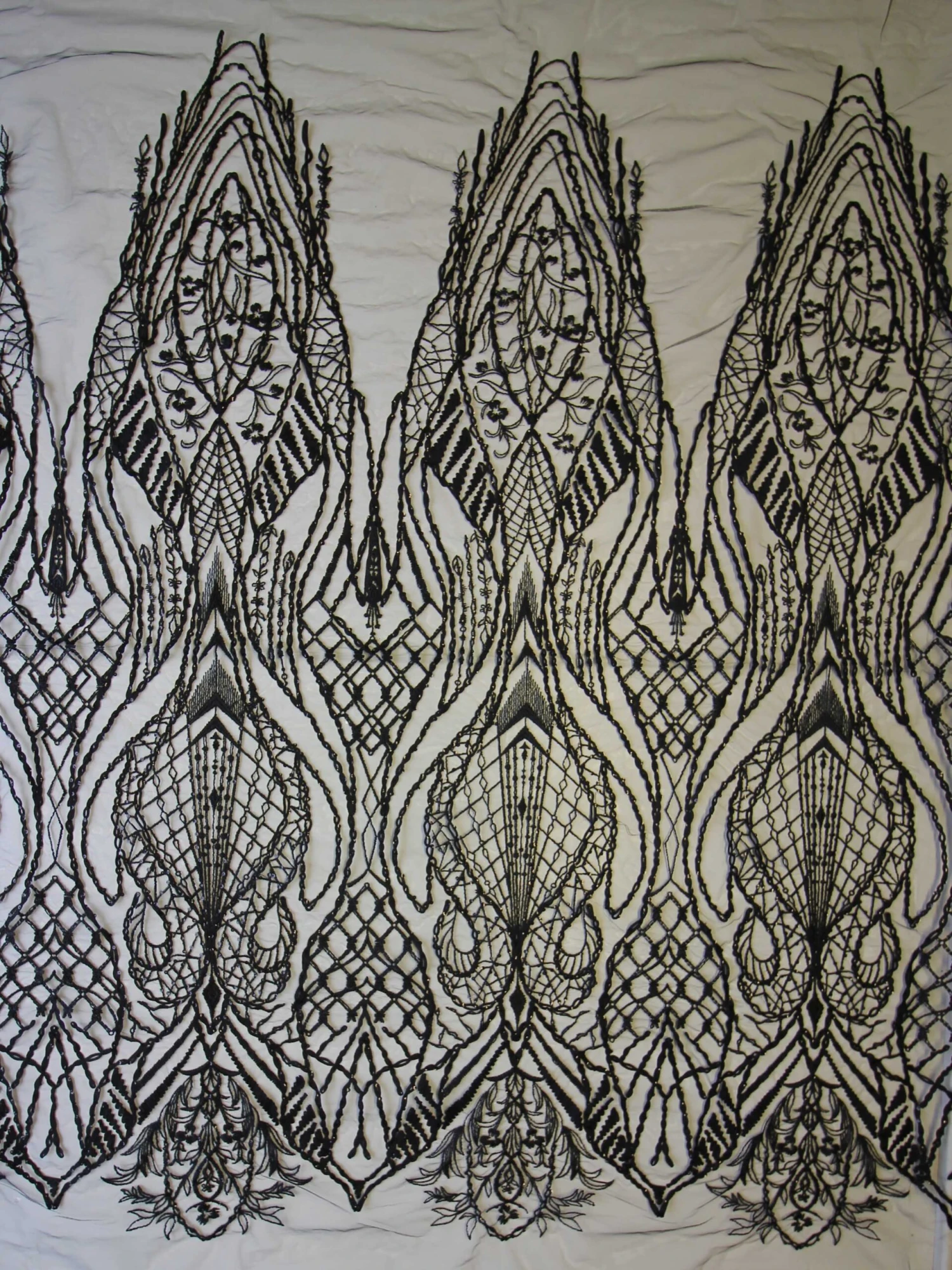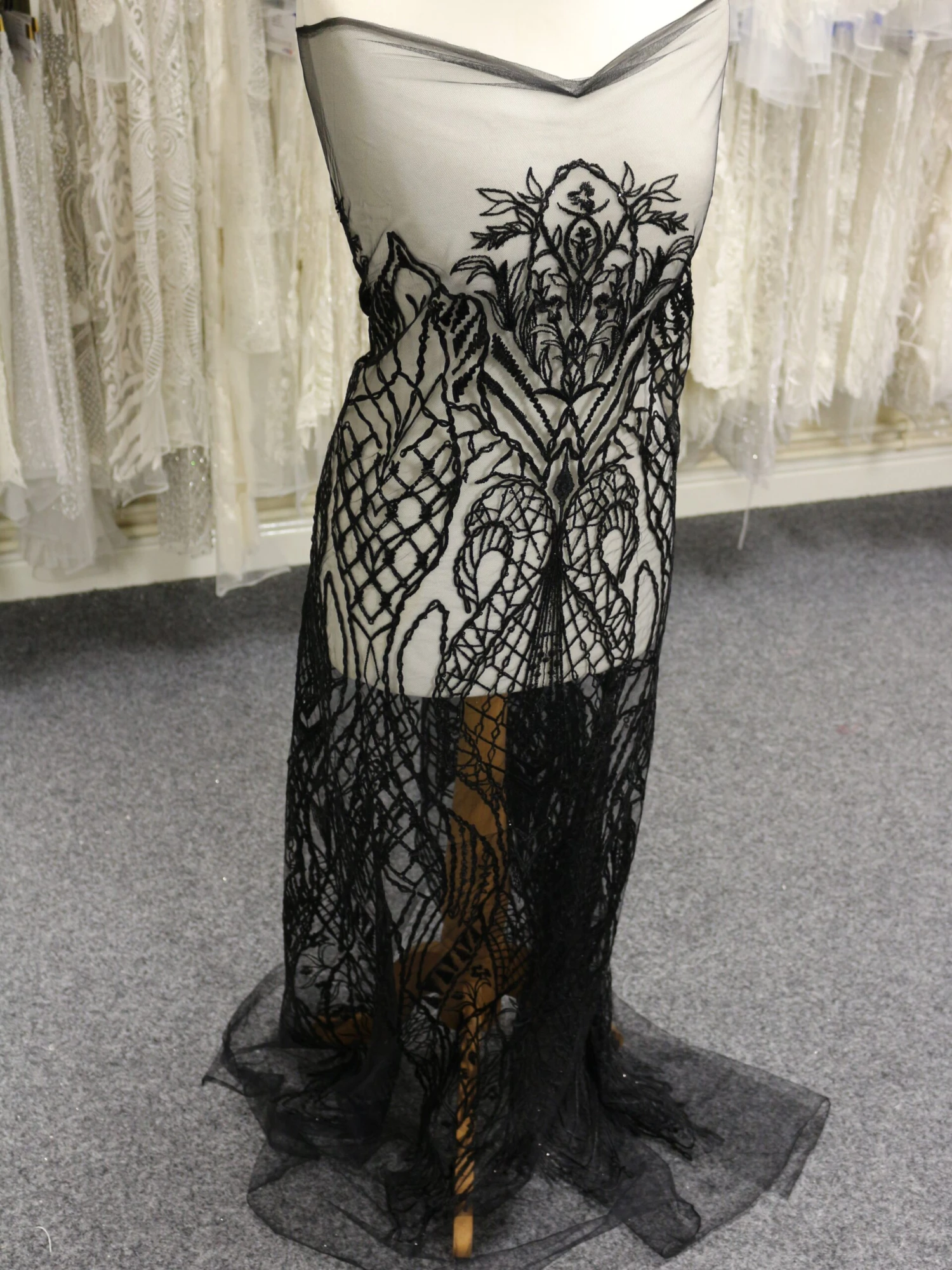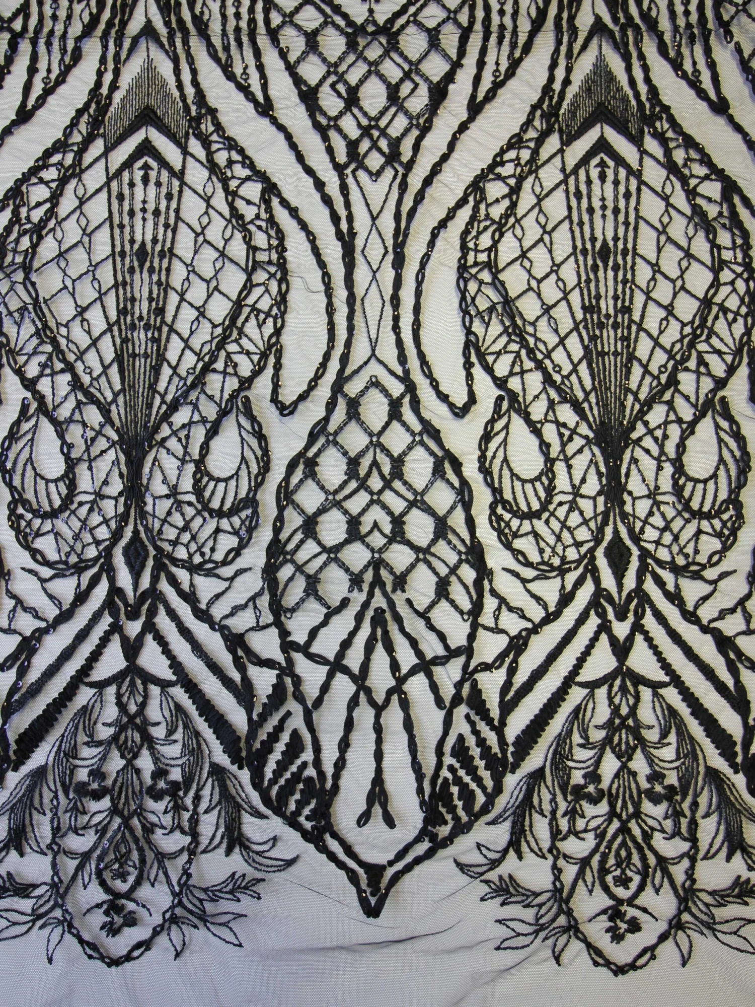 A decadent black lace with sequinned details on top of corded embroidery, this lace is a top selling lace for alternative bridal and evening wear. Its eye-catching design represents a non-floral option and is genuinely stunning! This lace measures 132 cm (52″) wide and is well worth ordering a free sample so evaluate the quality of this lace for yourself.