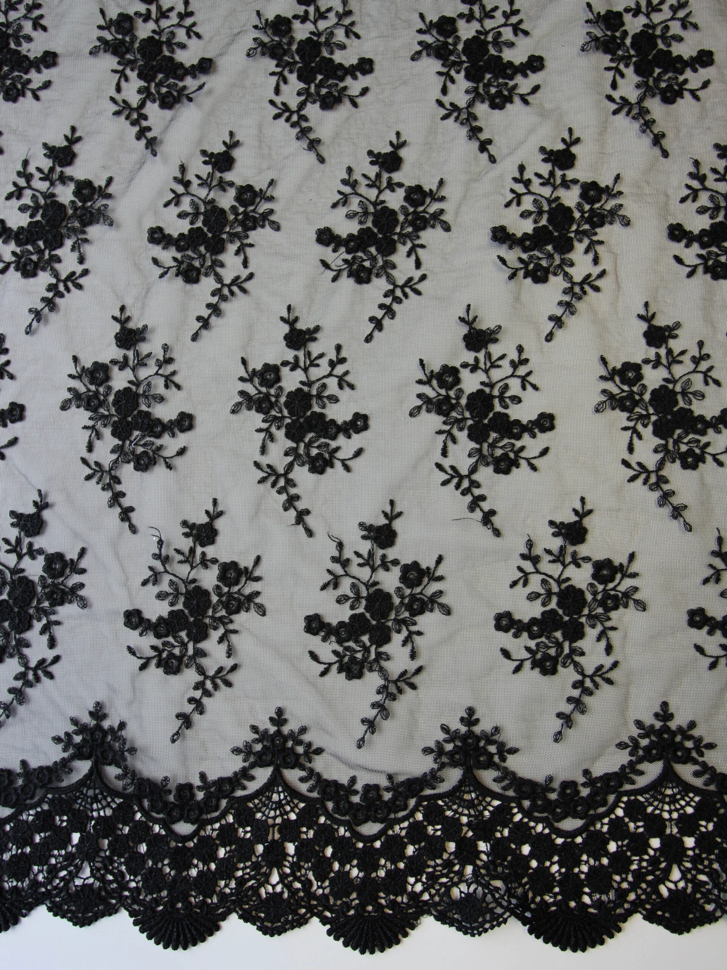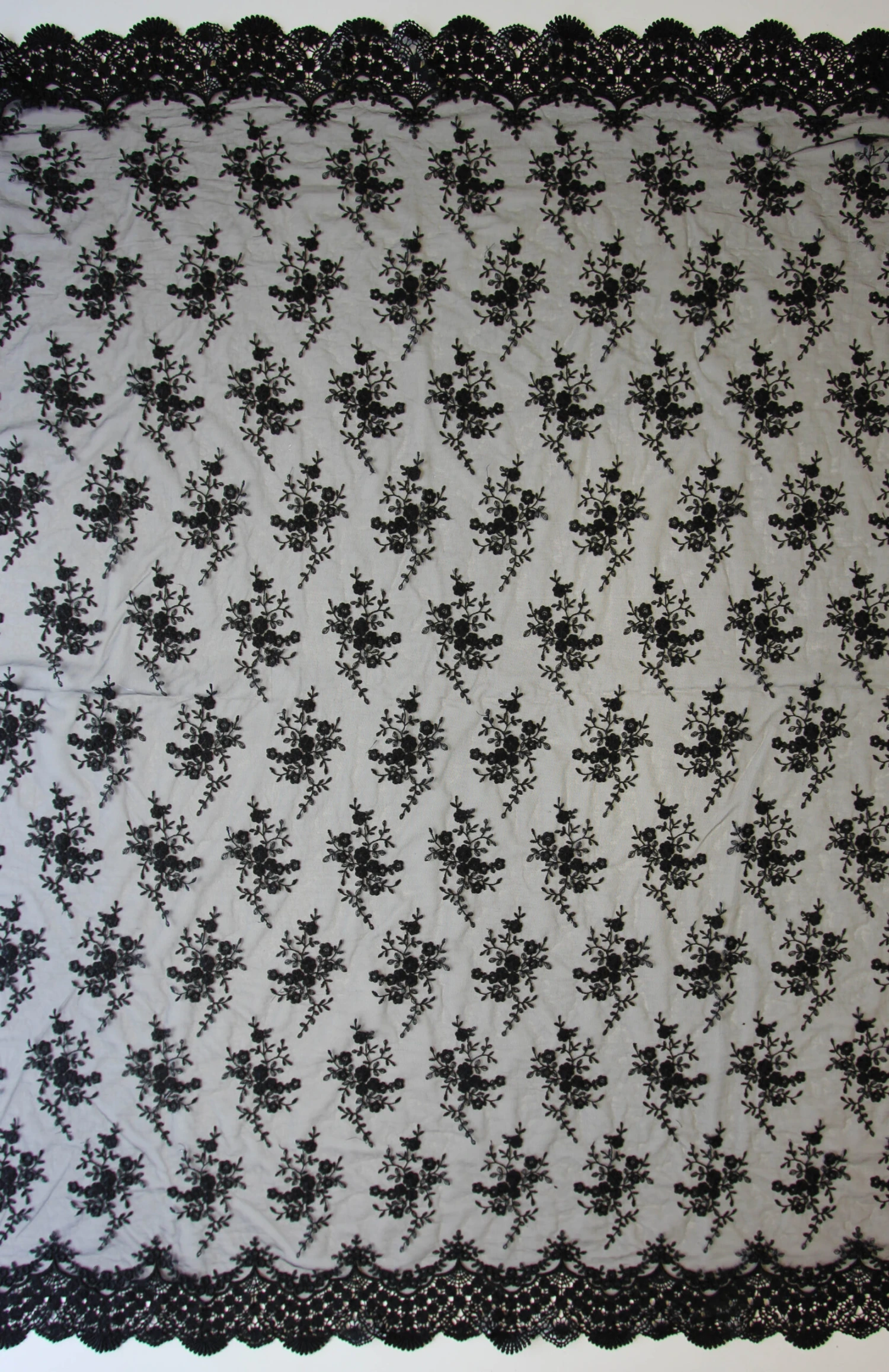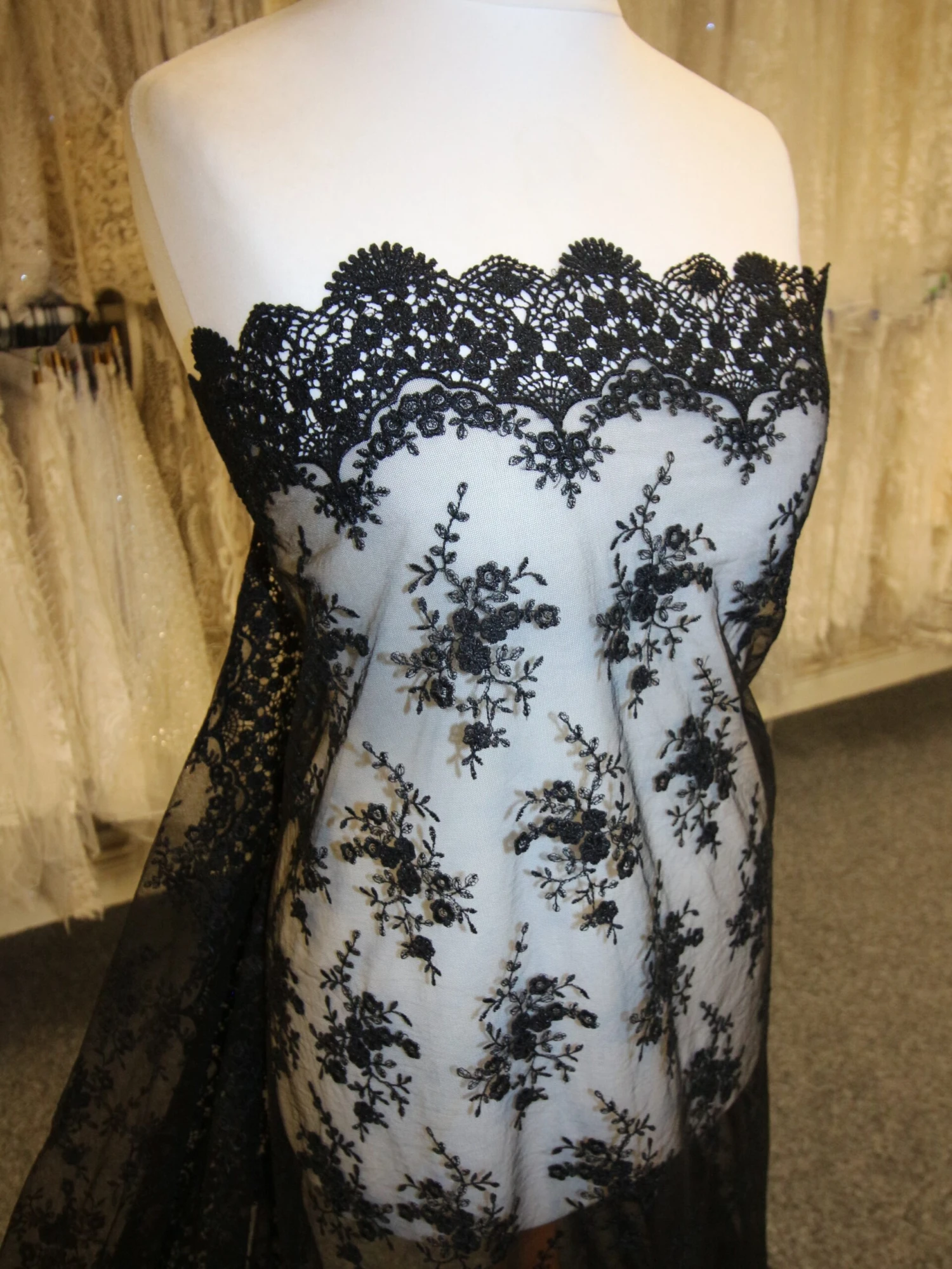 The borders of this lace are symmetrical and measure around 7.5 cm (3″) deep and are in a Guipure style adding depth and further detail to this beautiful lace. Kirsty Lace measures 134.5 cm (53″) wide and is available in a range of colours.