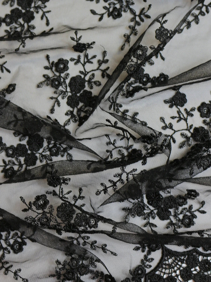 Kirsty Lace is a lovely delicate embroidered lace featuring small floral motifs framed by leaves across the tulle base.