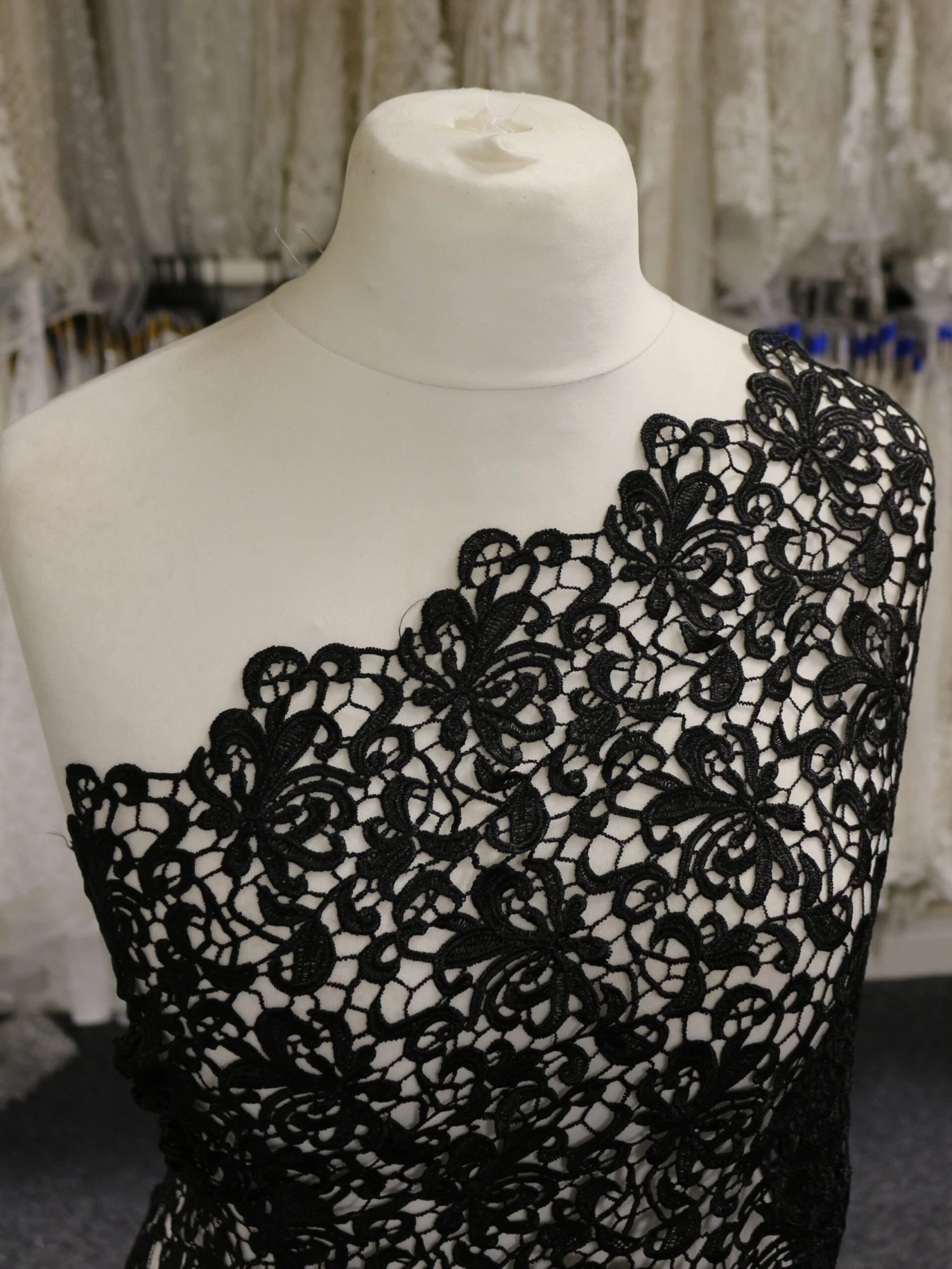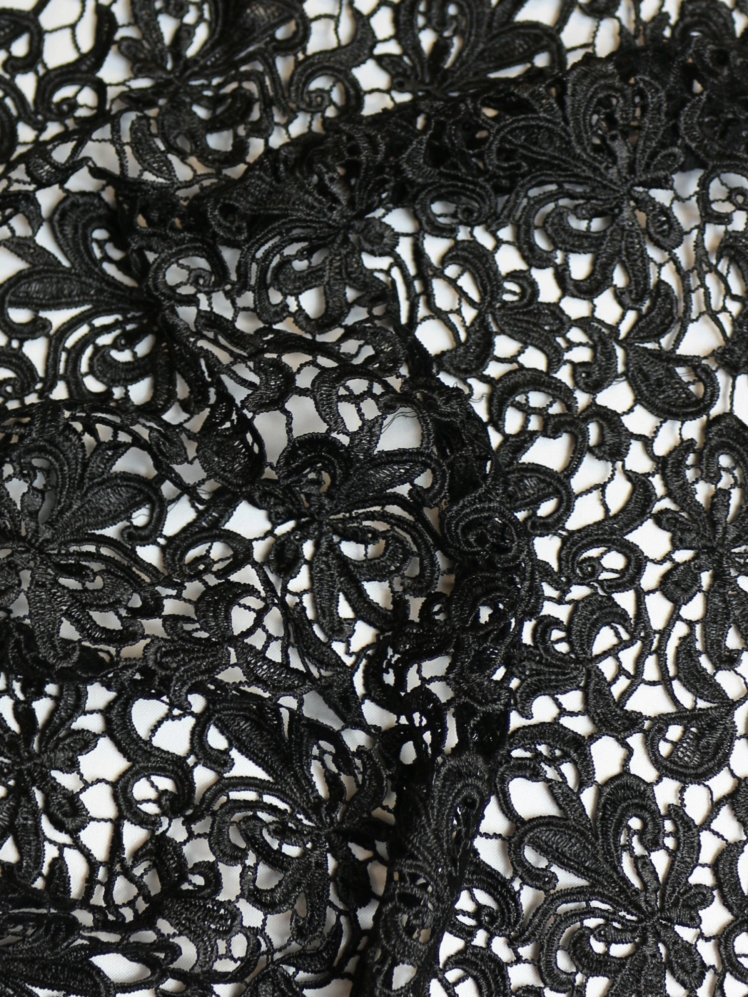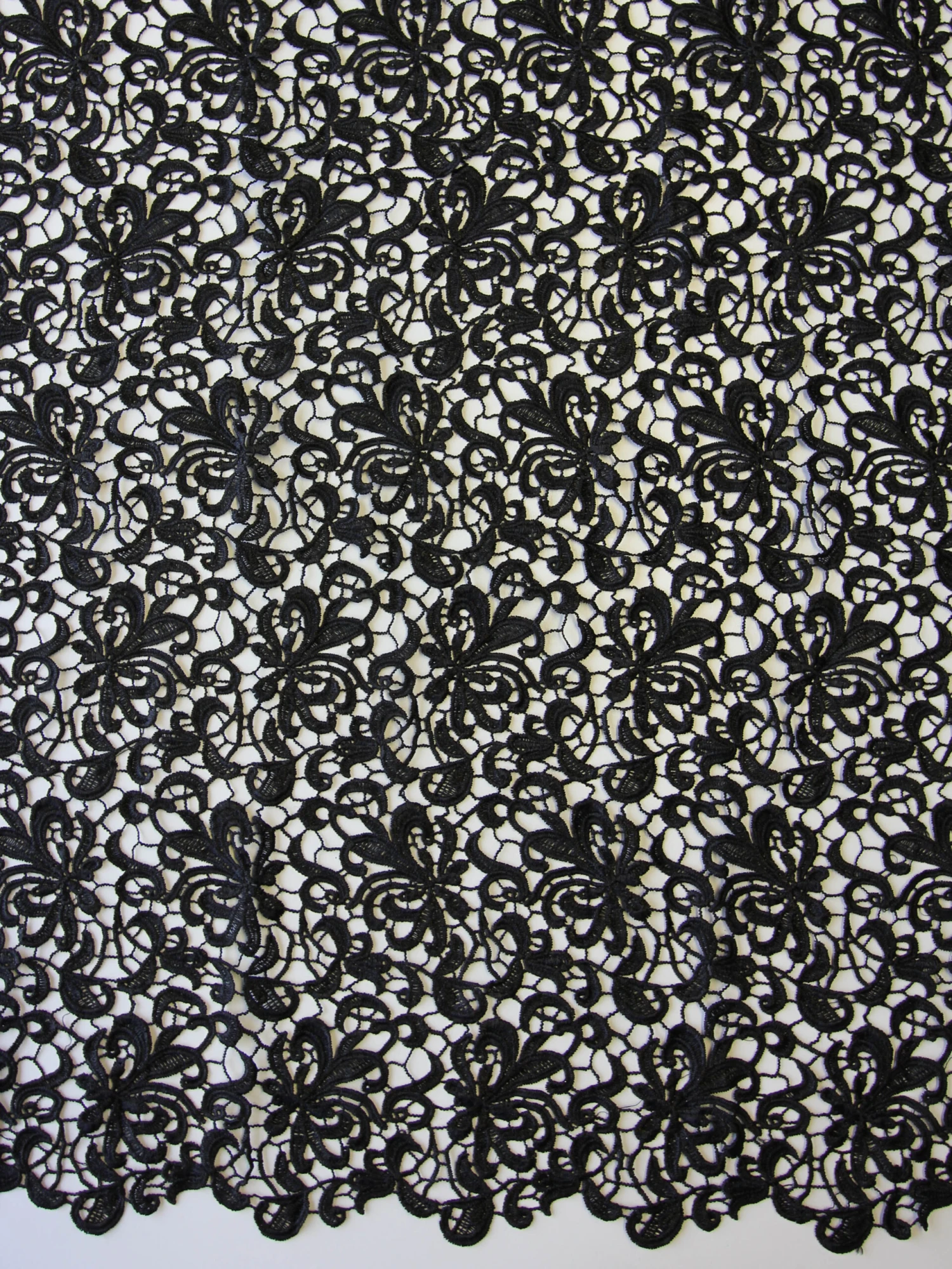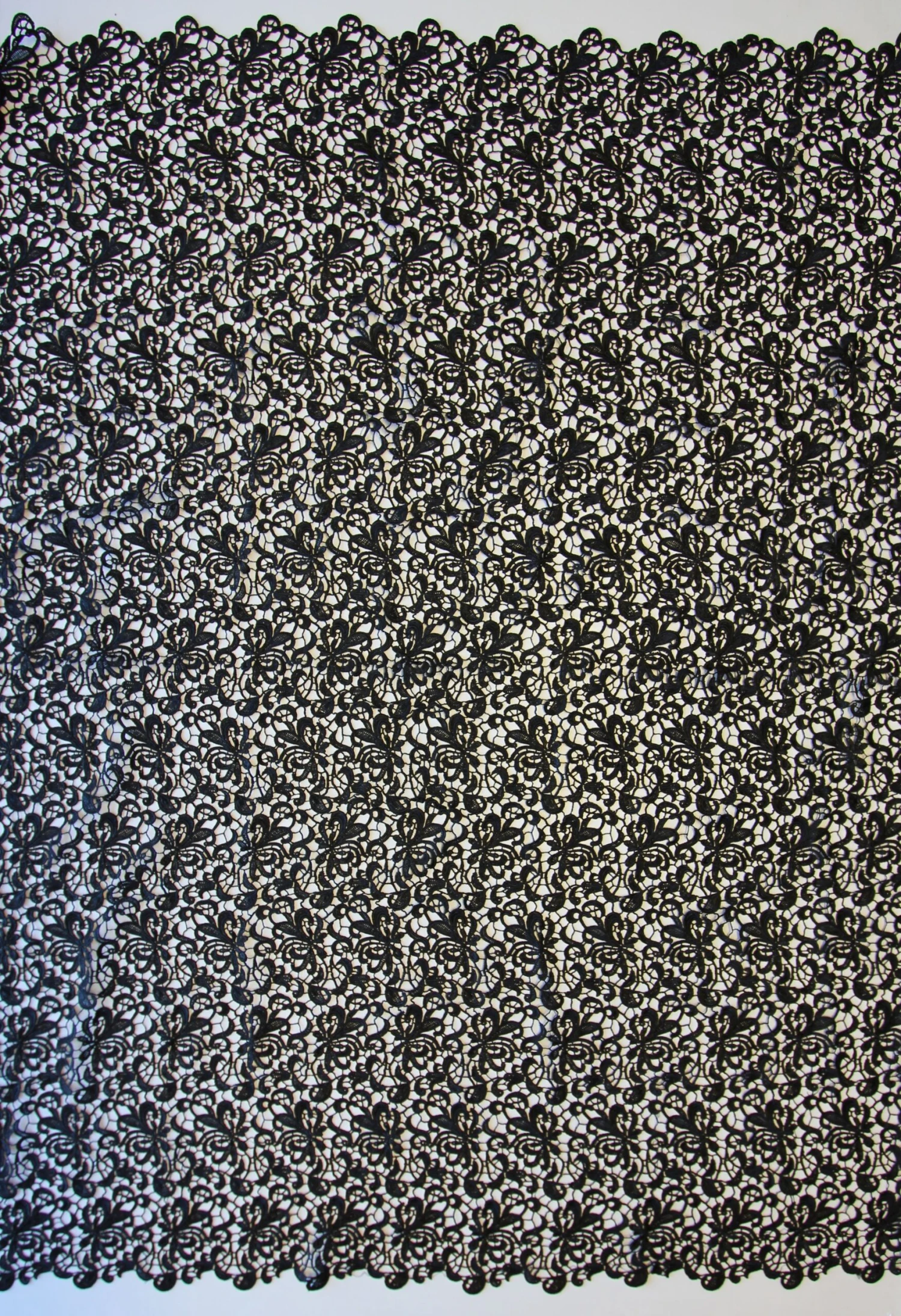 An elegant Black Guipure lace, which is available in a range of colours. This lace measures 130cm (51″) across the width.