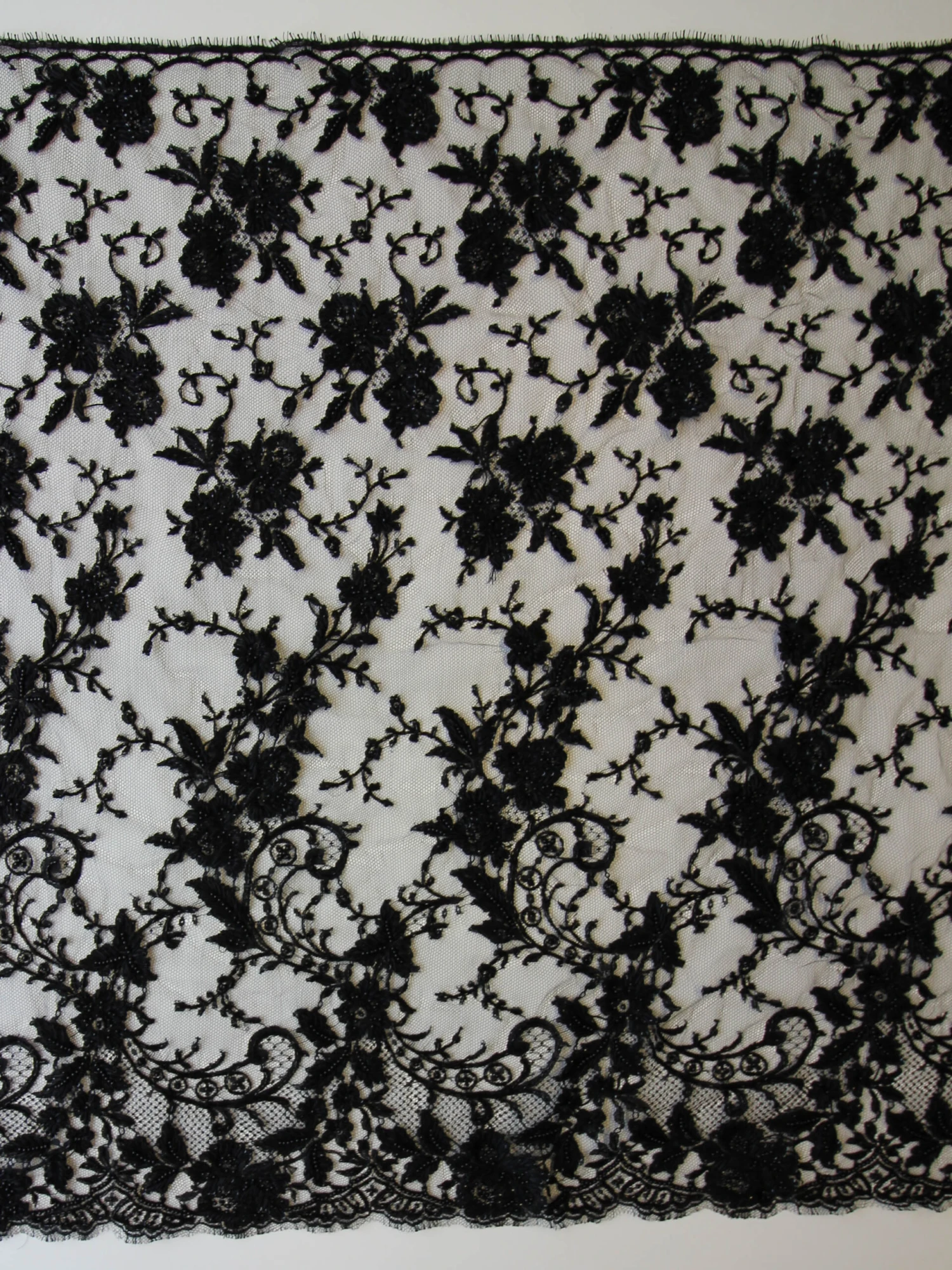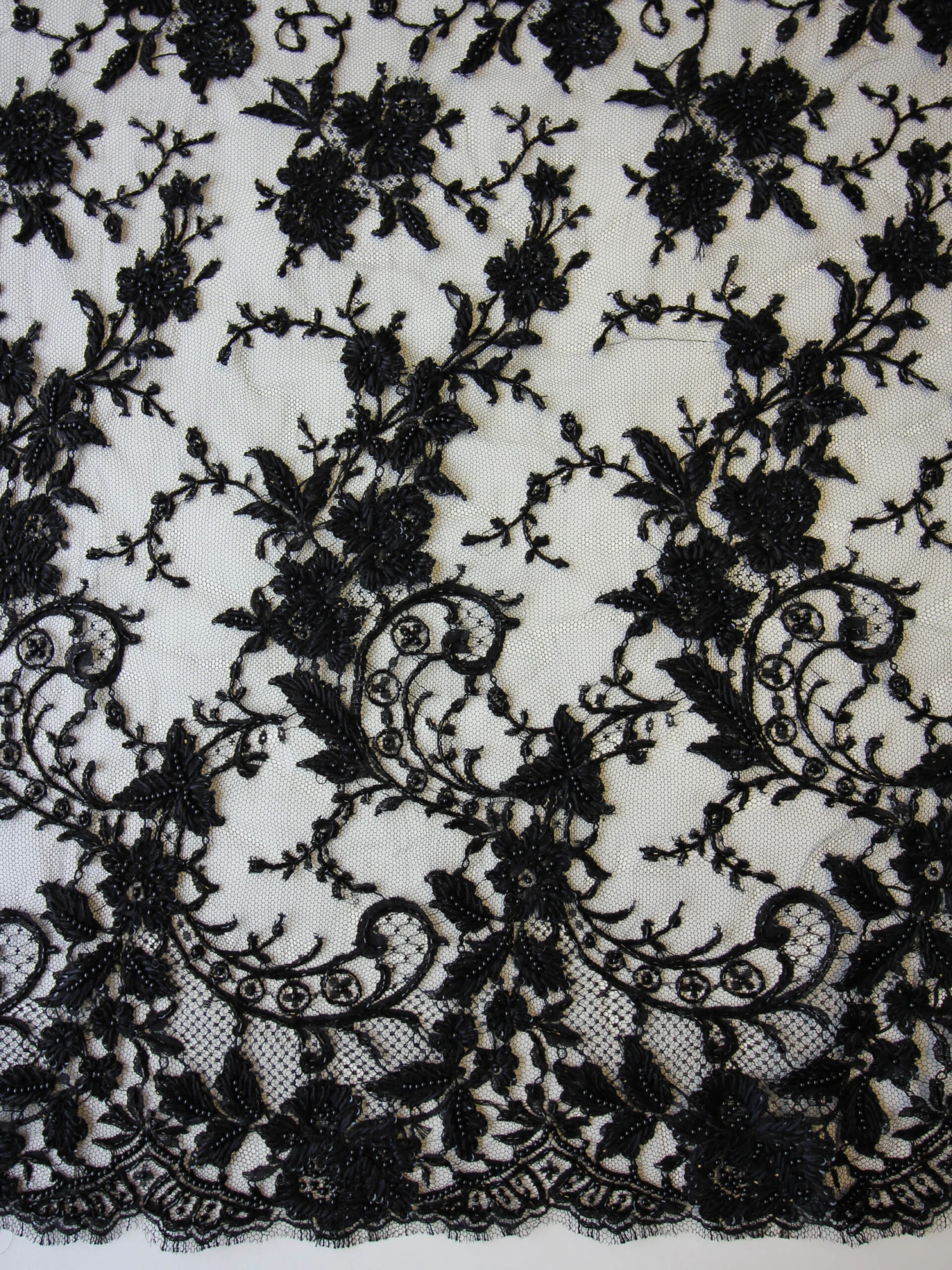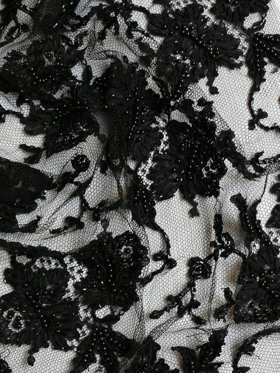 A black Chantilly lace that has been hand beaded to create a great looking fabric for evening wear