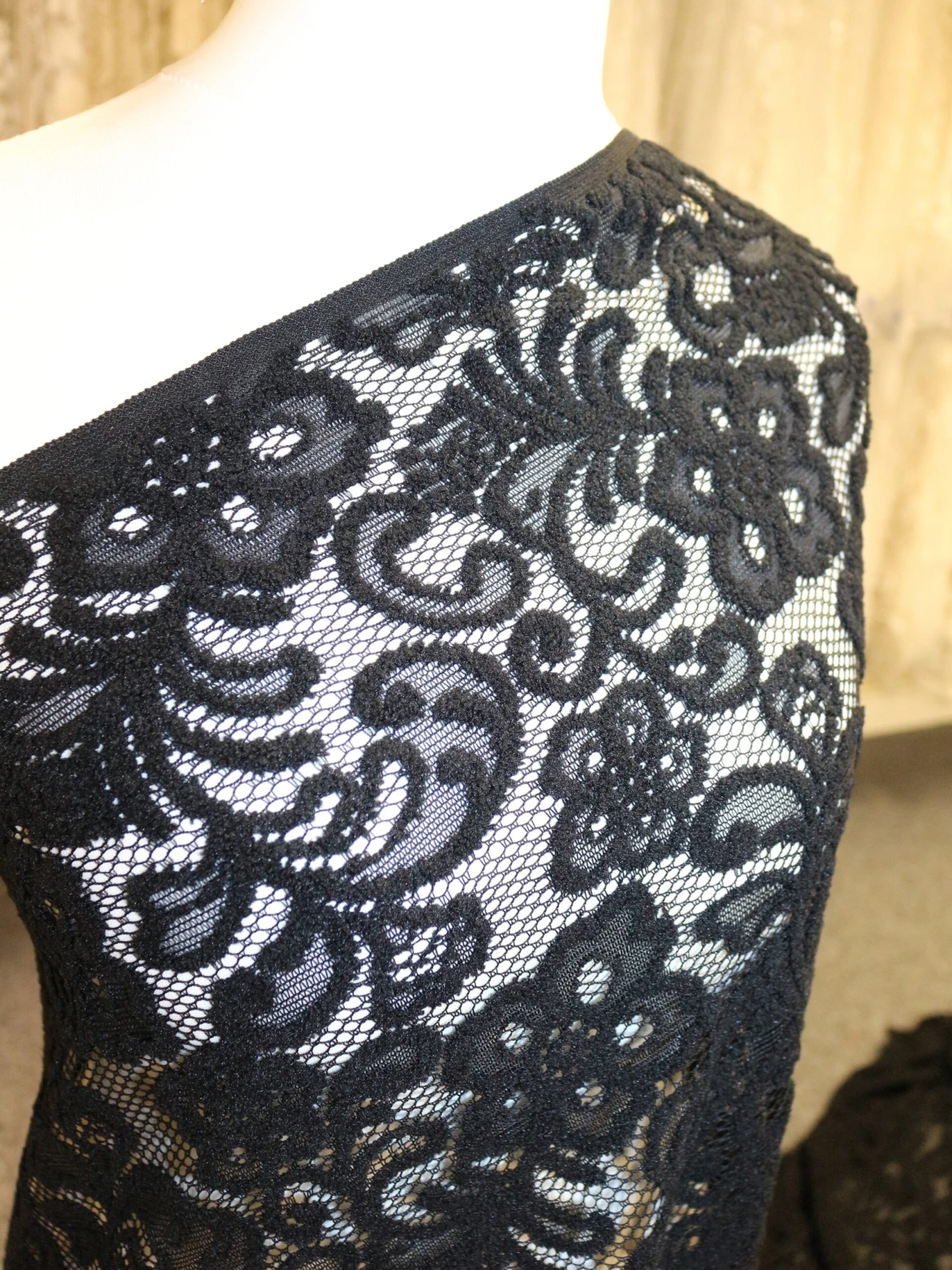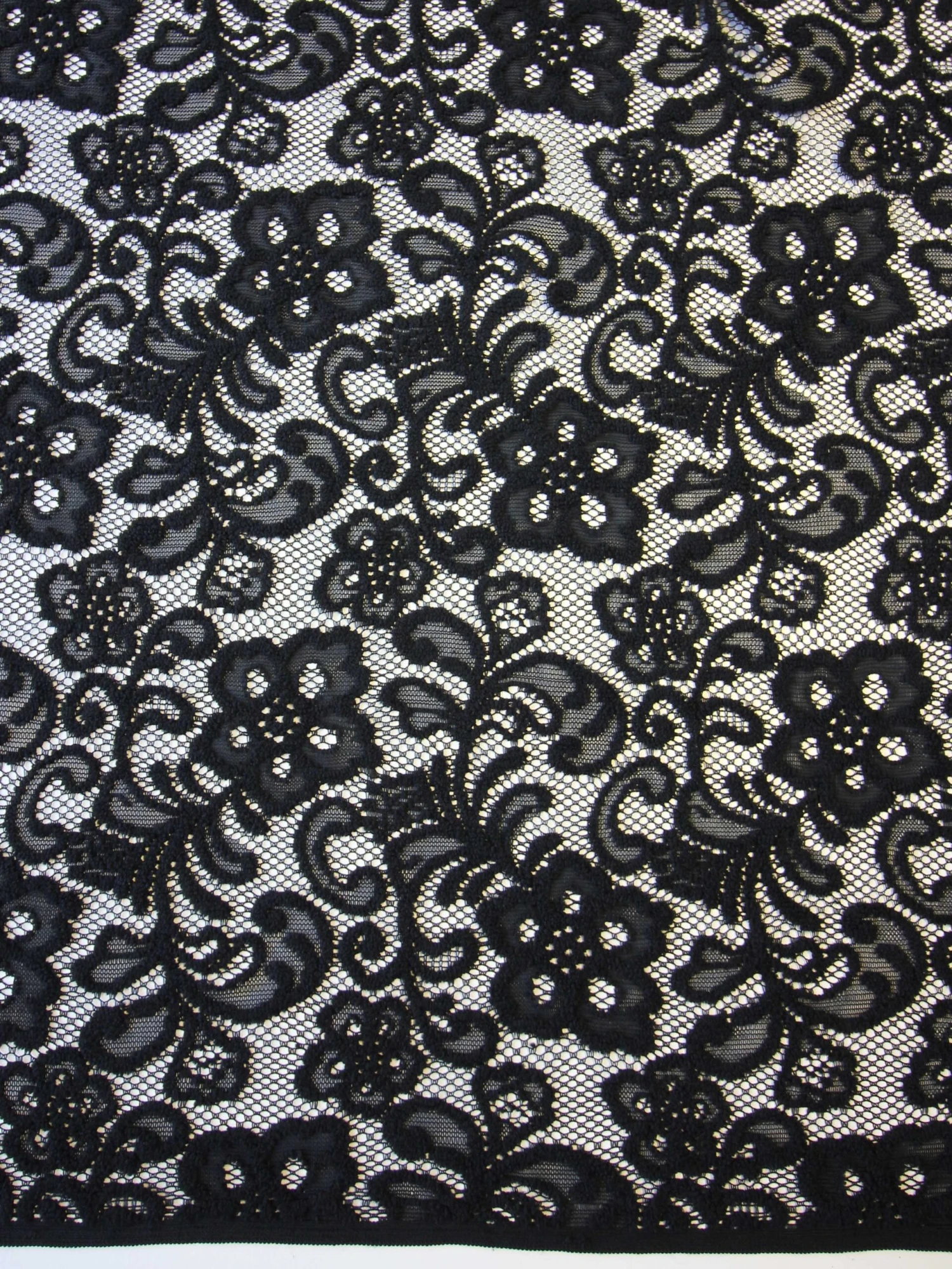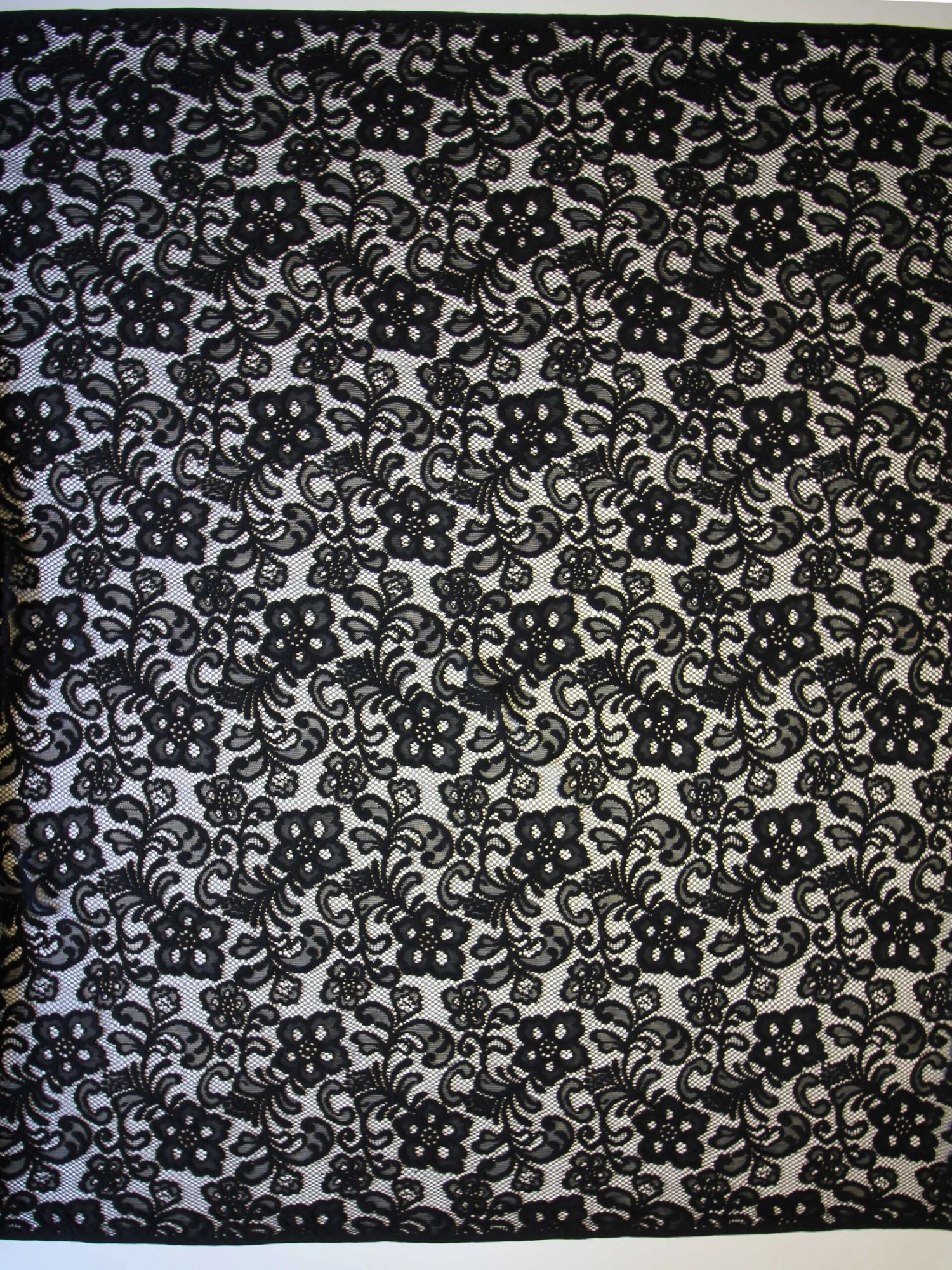Edwina has is a woven black lace with plain edges and is a heavy quality and is perfect for winter dresses. Measuring 144 cm (56″) wide, this is one of our more eye-catching and dramatic laces.
