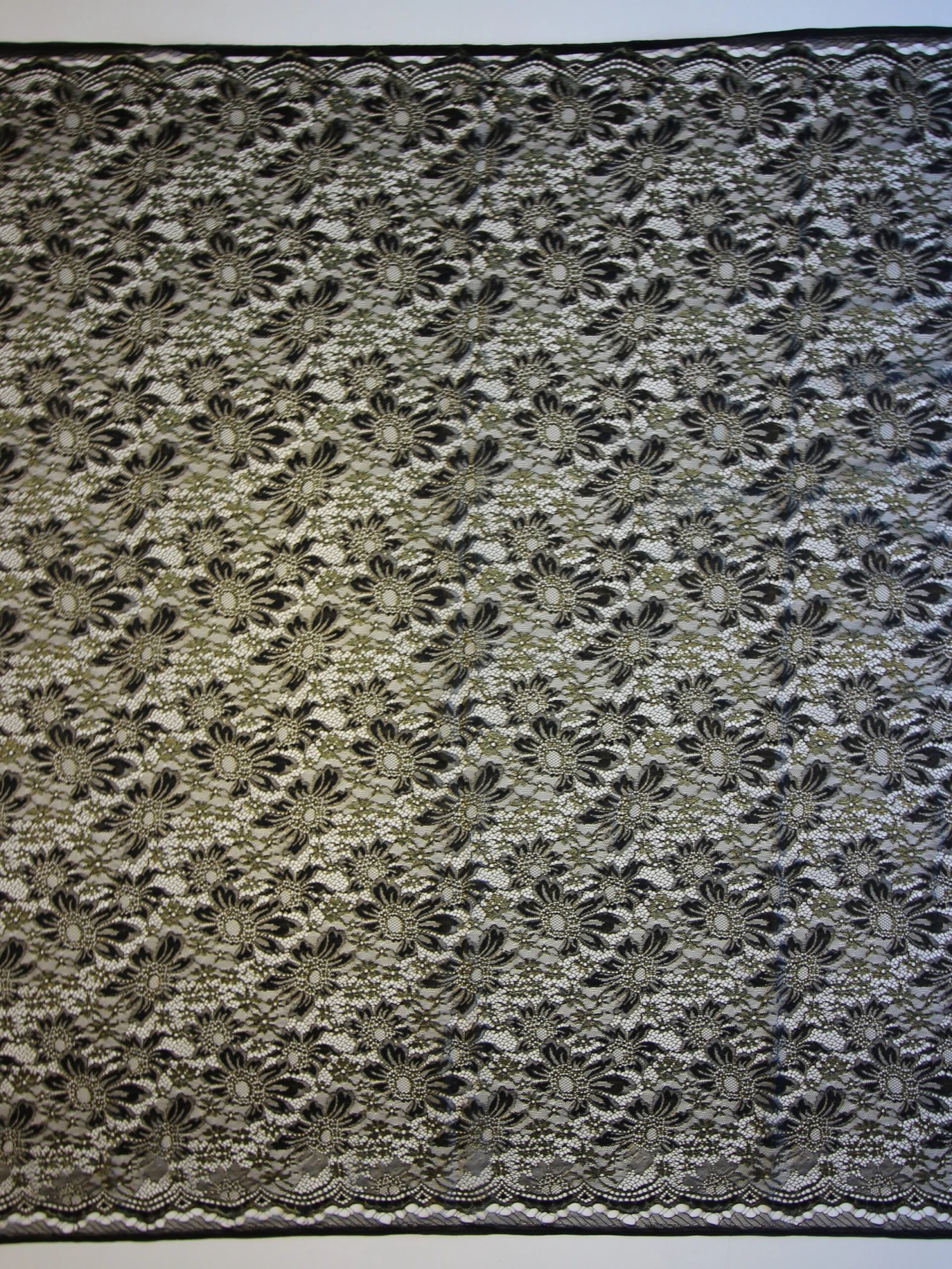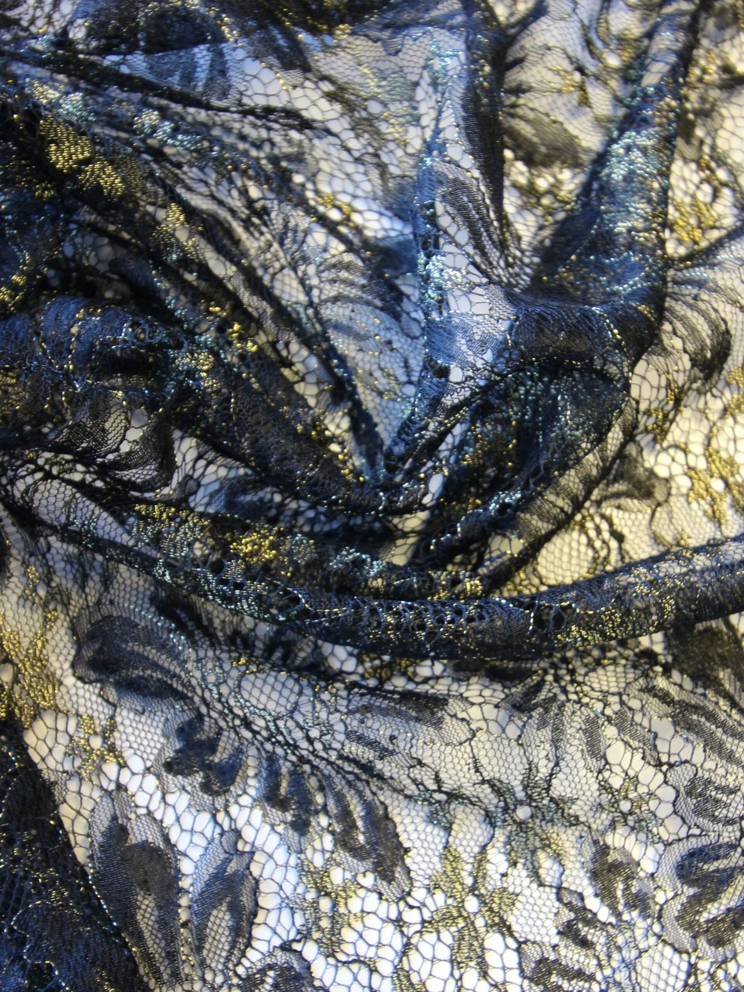 A delicate and lightweight lace that combines gold metallic thread with black to create an alluring aesthetic. Though these lace designs are supplied with evening wear and mother of the bride or groom in mind they can be used for any garment as they offer great value. The matching edges of this lace are very gently scalloped and the design features floral motifs. The openness or density of the weave creates the design and it has a soft handle and wonderful, light drape. This lace measure 110cm (41.3″) cm wide and is available from stock for speedy international delivery.