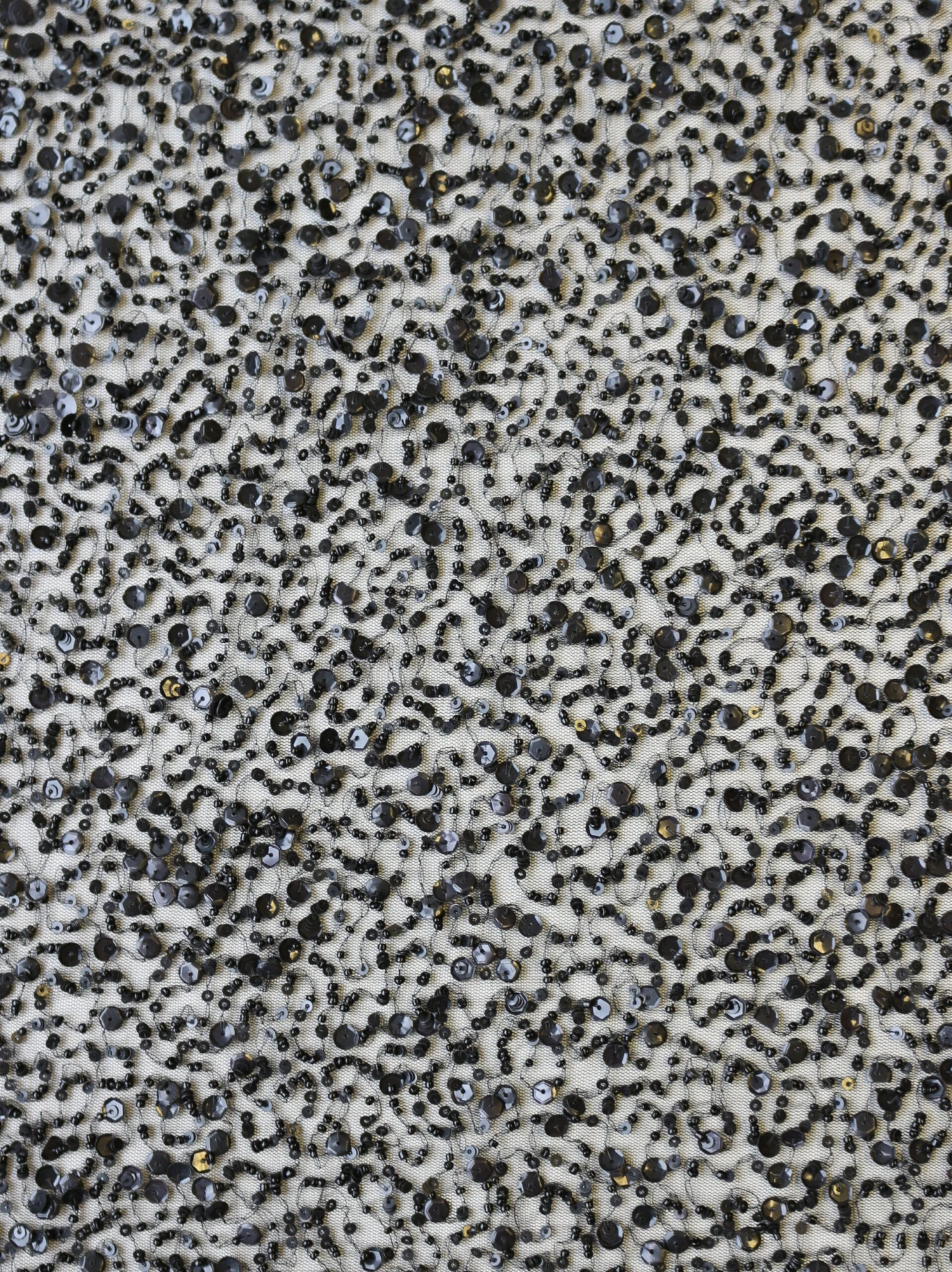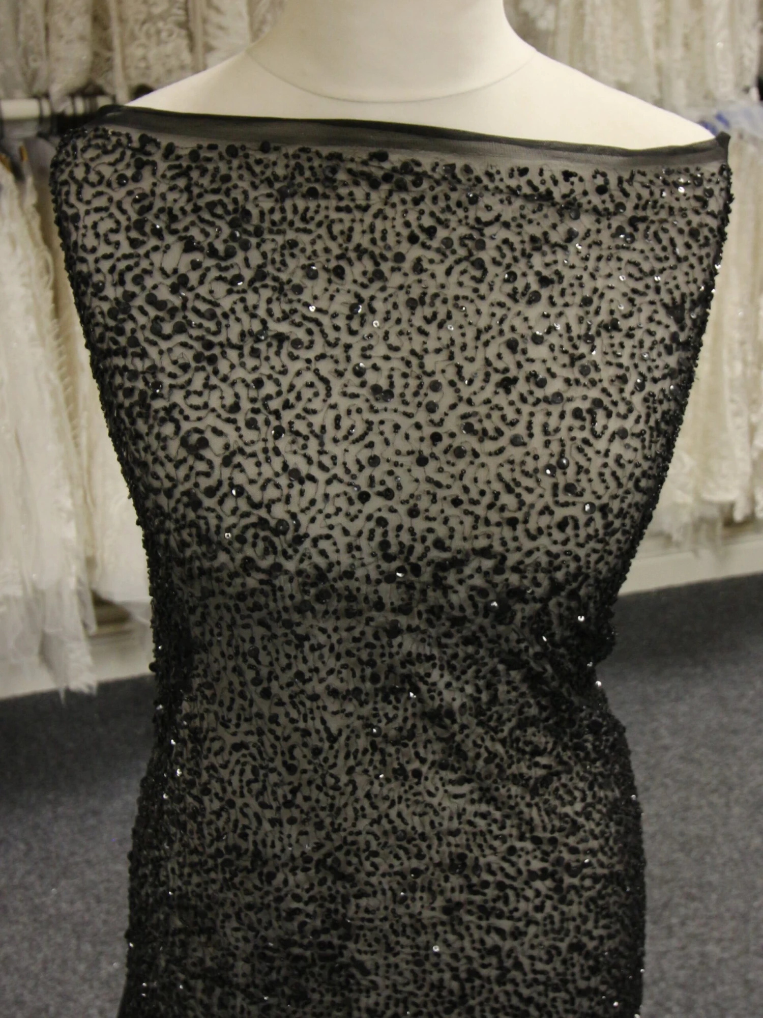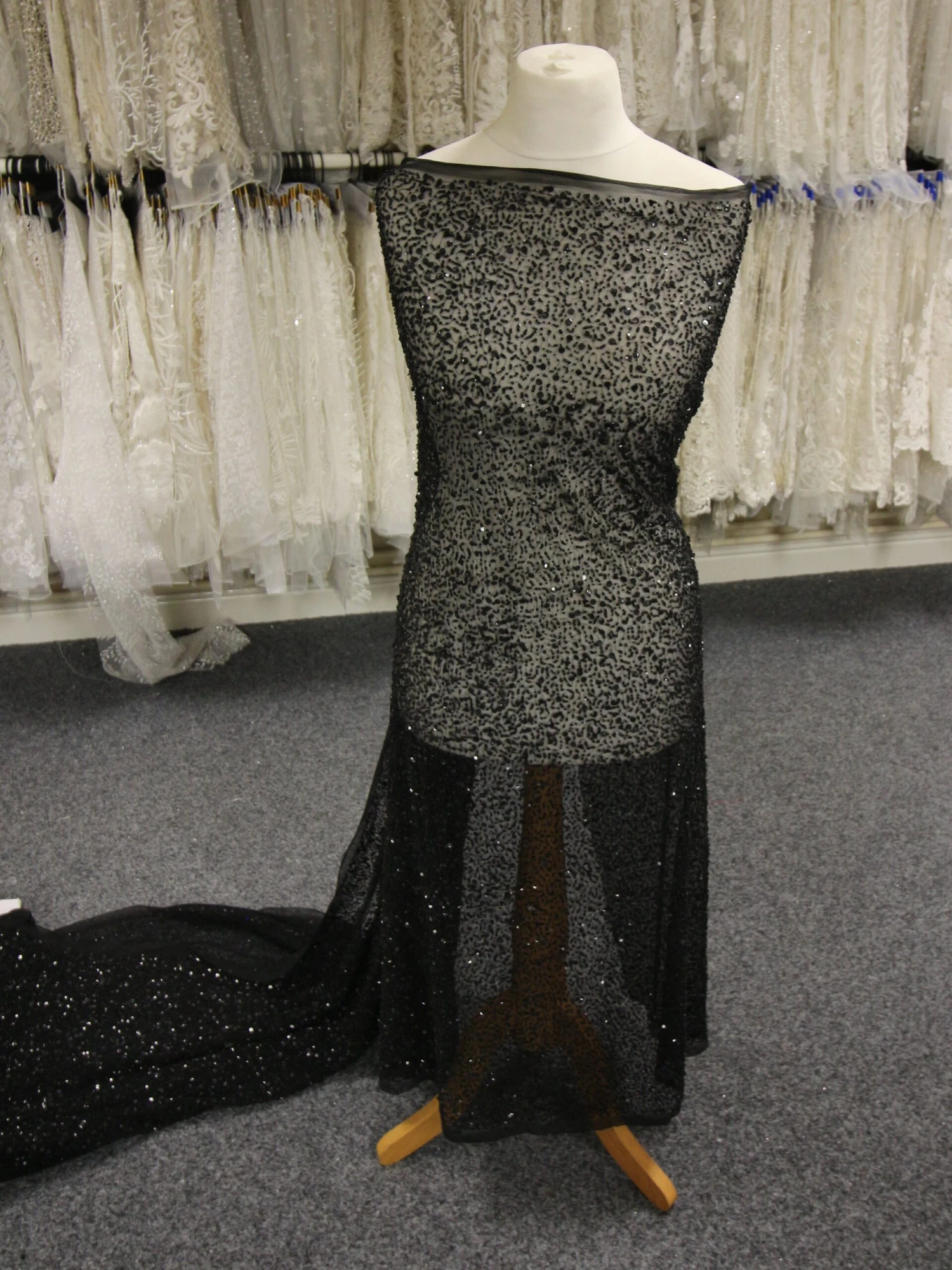 A superb, sparkling black lace that has global appeal. Perfect for an evening gown or for the alternative bride, this black lace has an black tulle base which has been embellished with a range of beads and sequins across the full width of the lace.