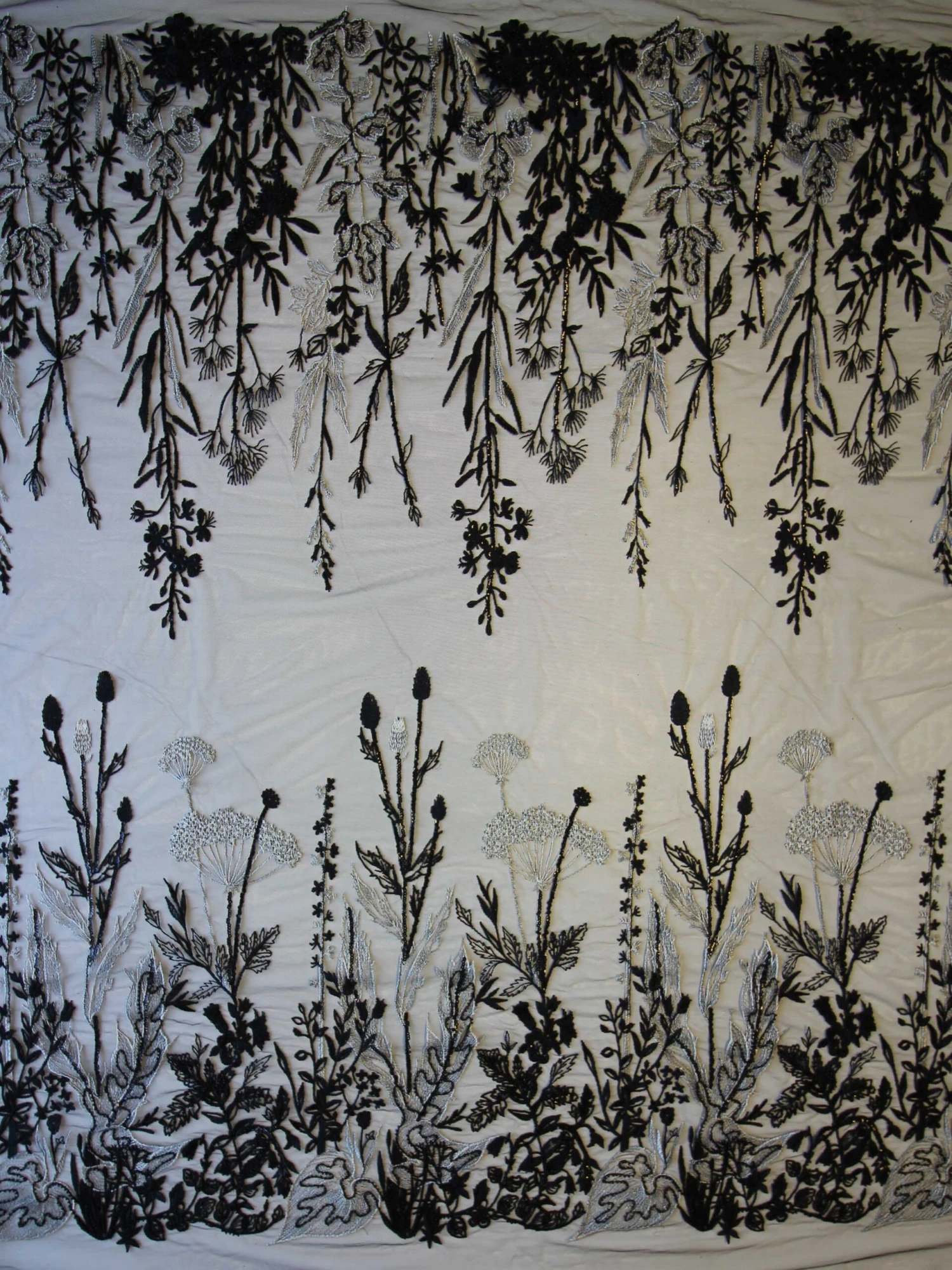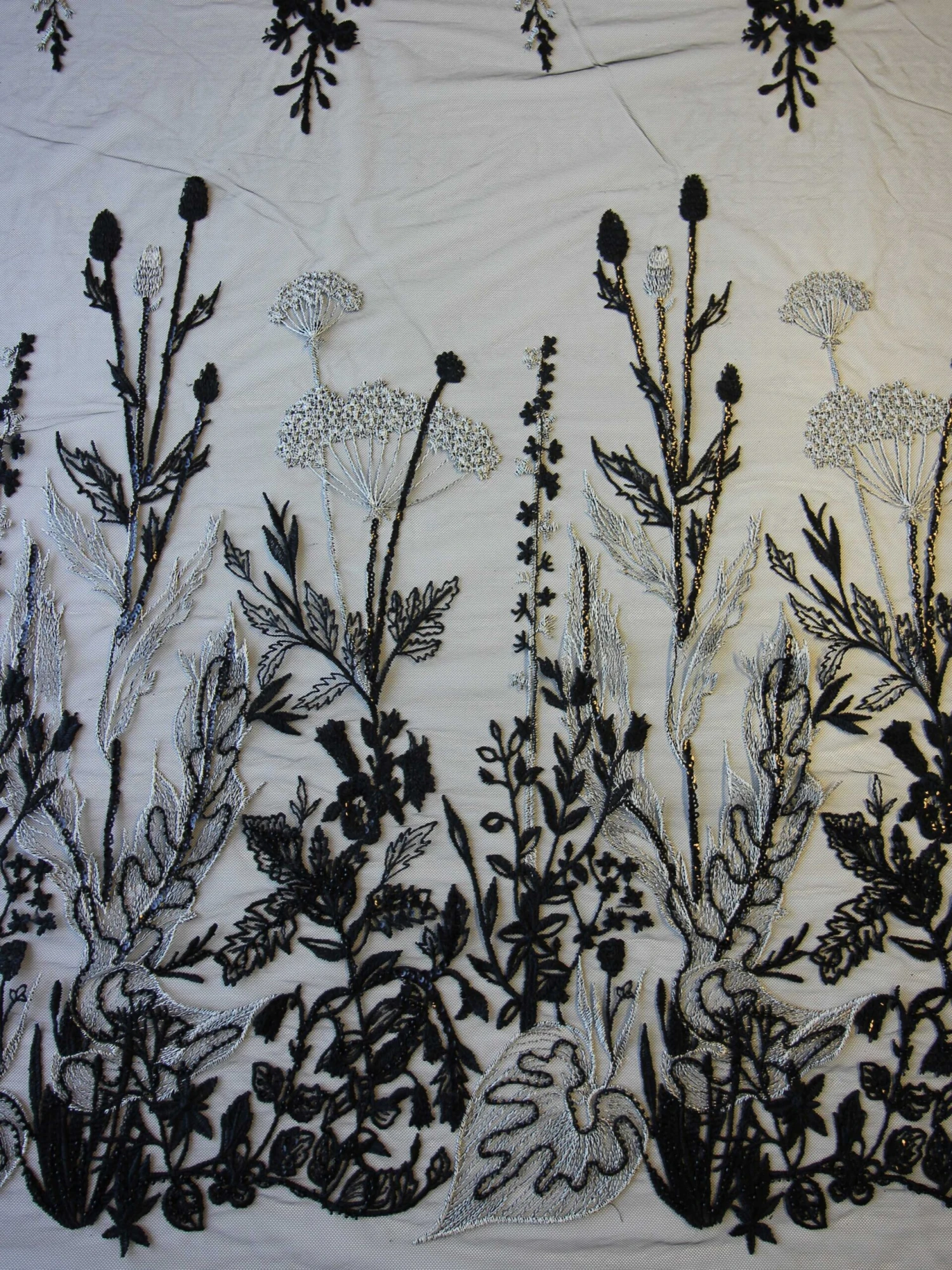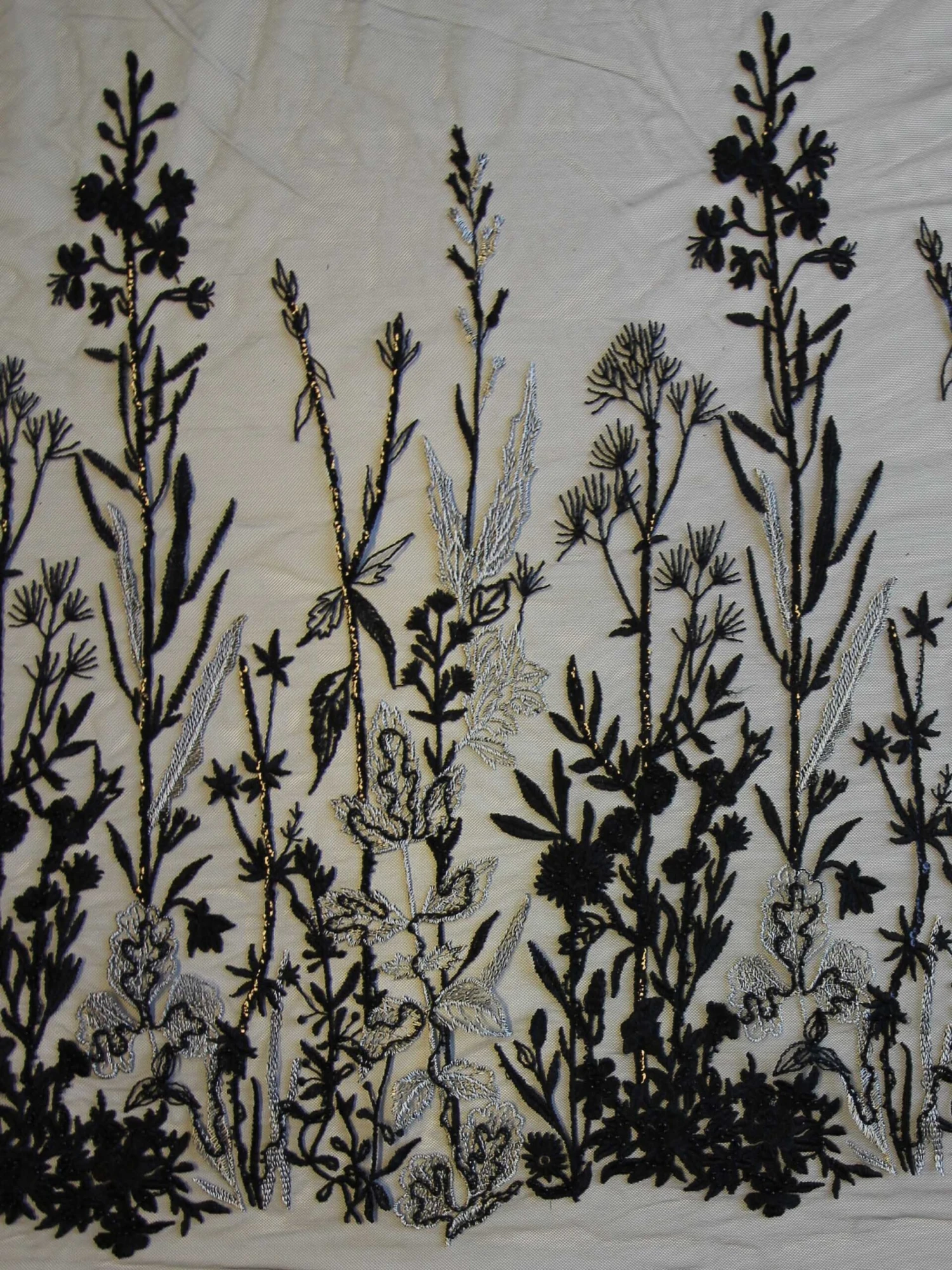 This is a contemporary and elegant floral design featuring a myriad of different summer flowers. This lace measures 132 cm (52″) wide and is composed of an black tulle base with black and silver embroidery together with a variety of different beads and sequins.Â