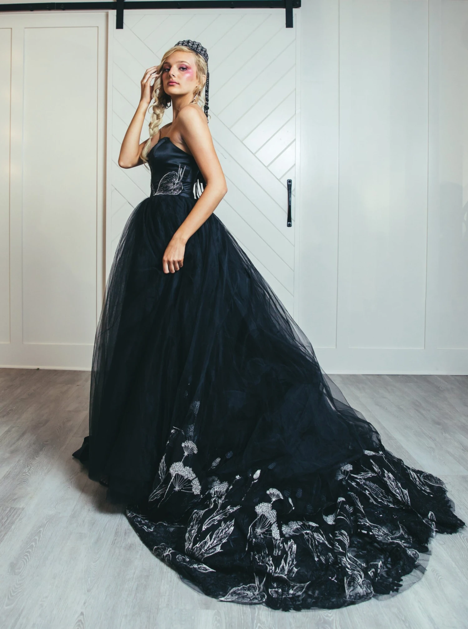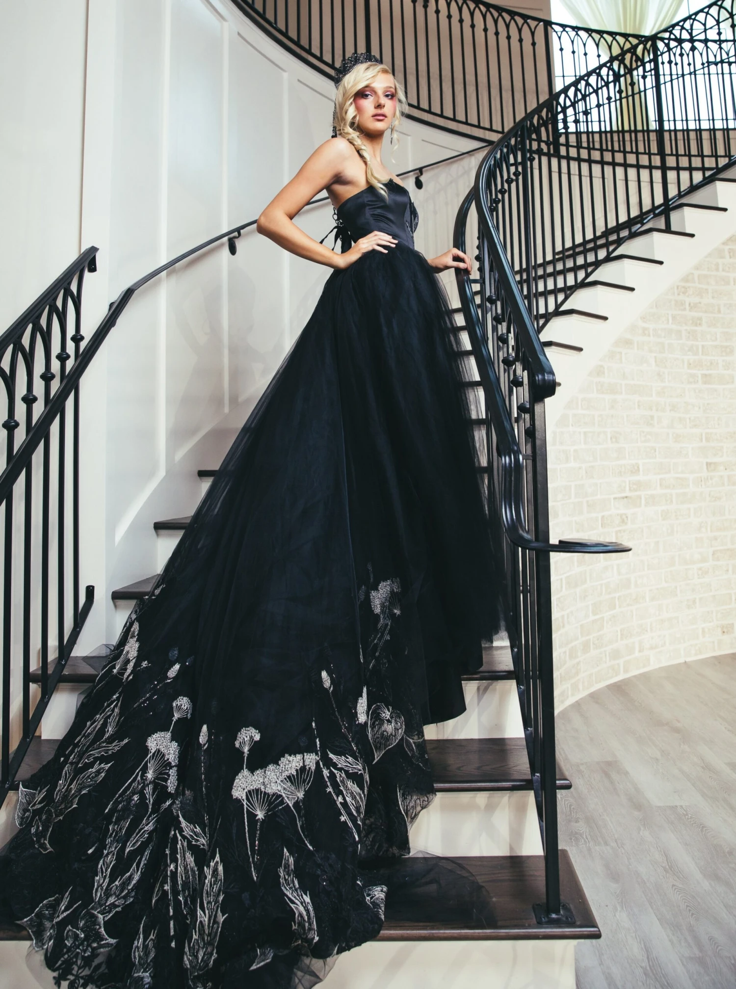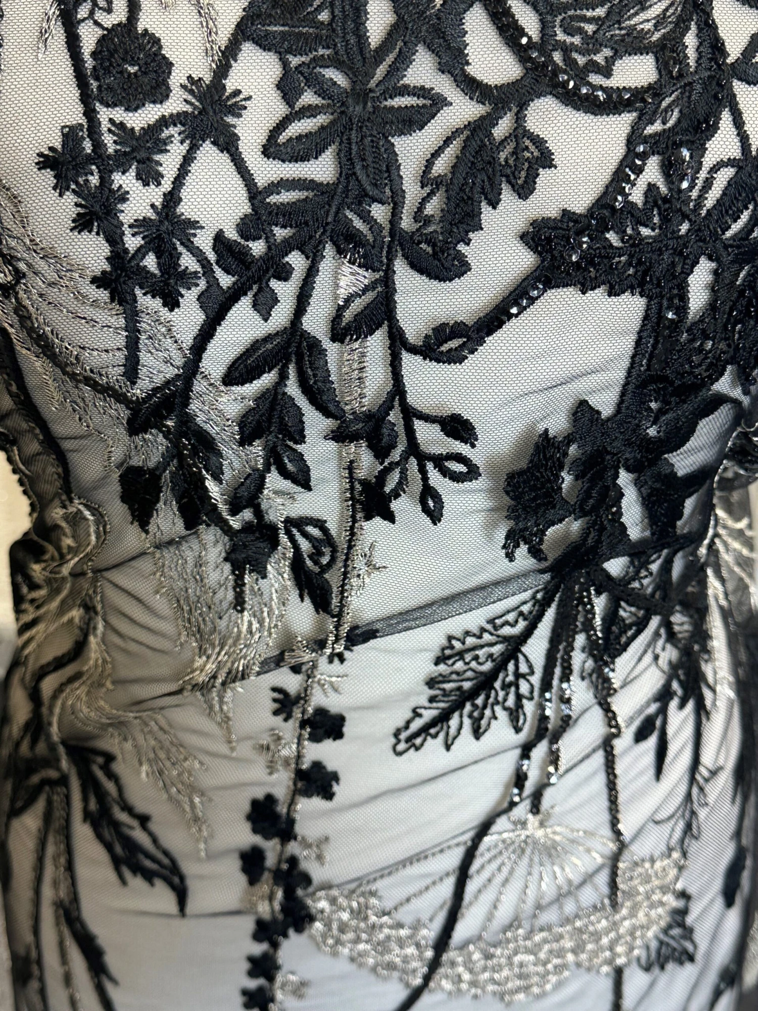 This is a contemporary and elegant floral design featuring a myriad of different summer flowers. This lace measures 132 cm (52″) wide and is composed of an black tulle base with black and silver embroidery together with a variety of different beads and sequins.Â