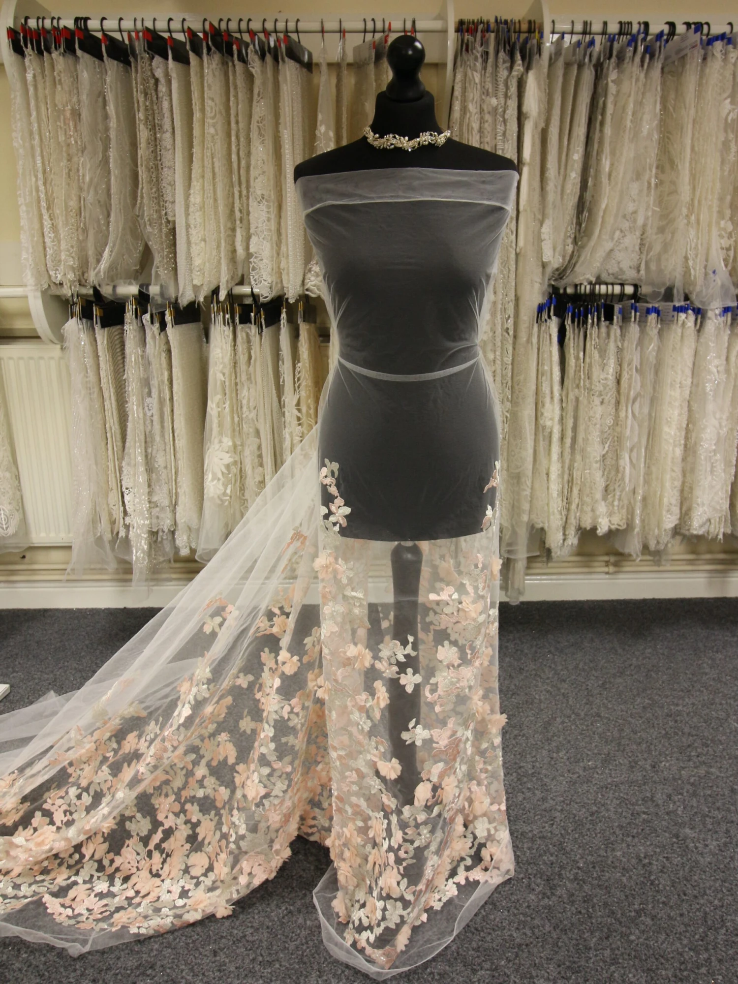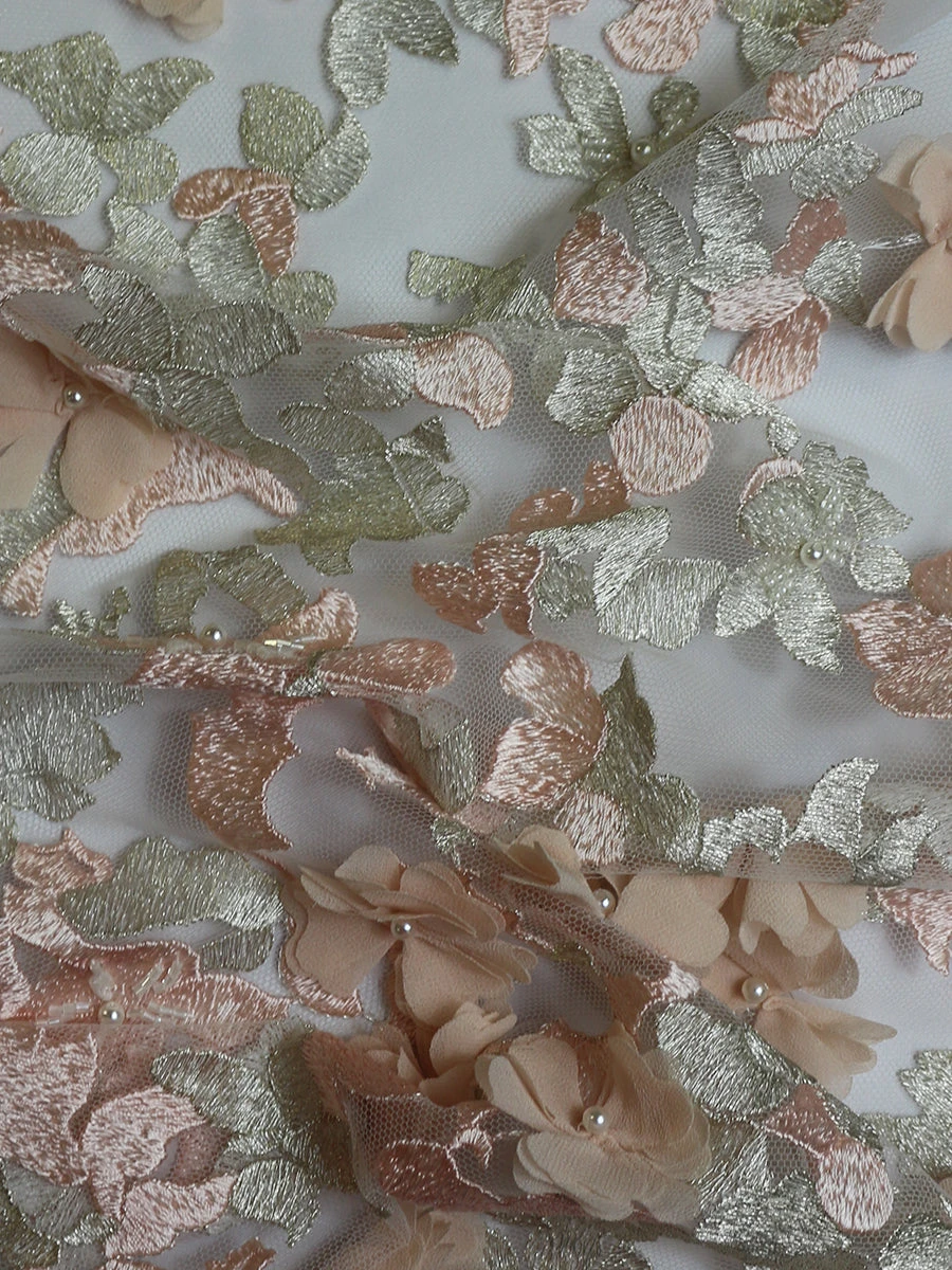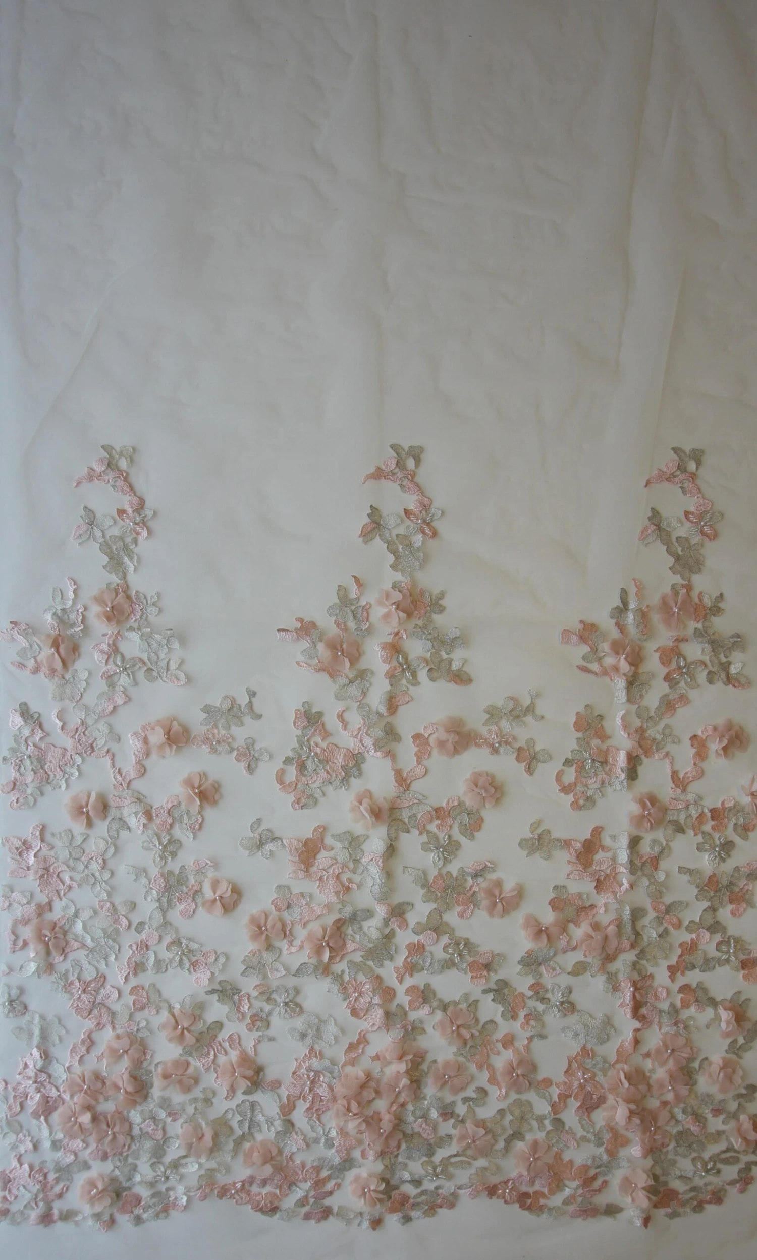 An elegantly embroidered pale pink Lace, this has an ivory tulle base with pink and silver/champagne detailing, this lace measures 132 cm ( 52″).
