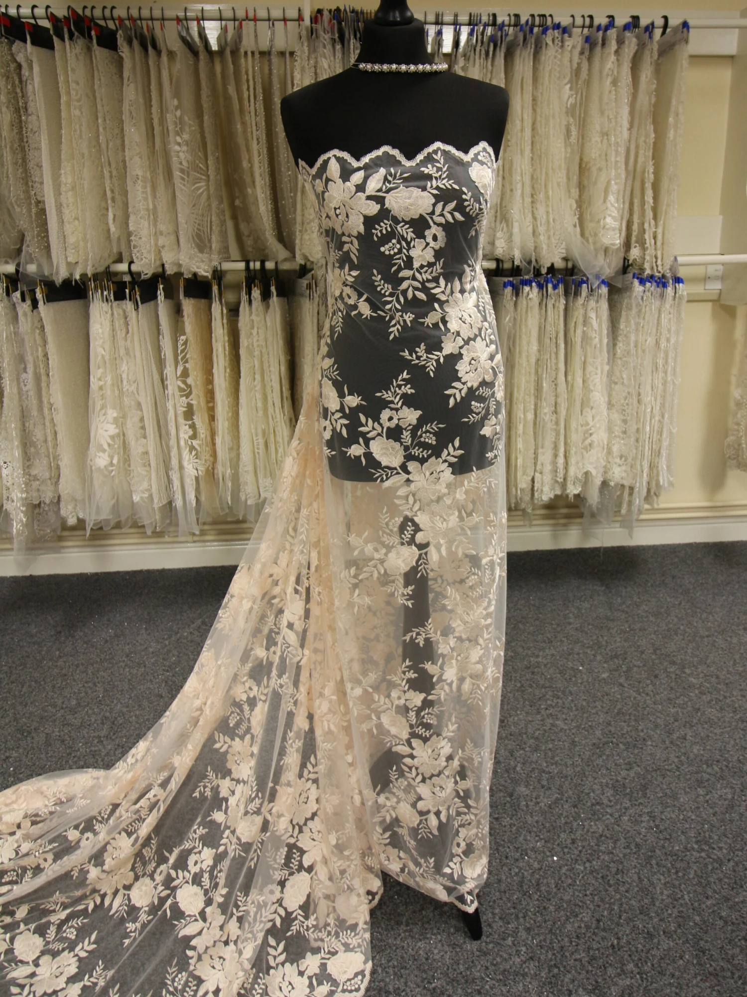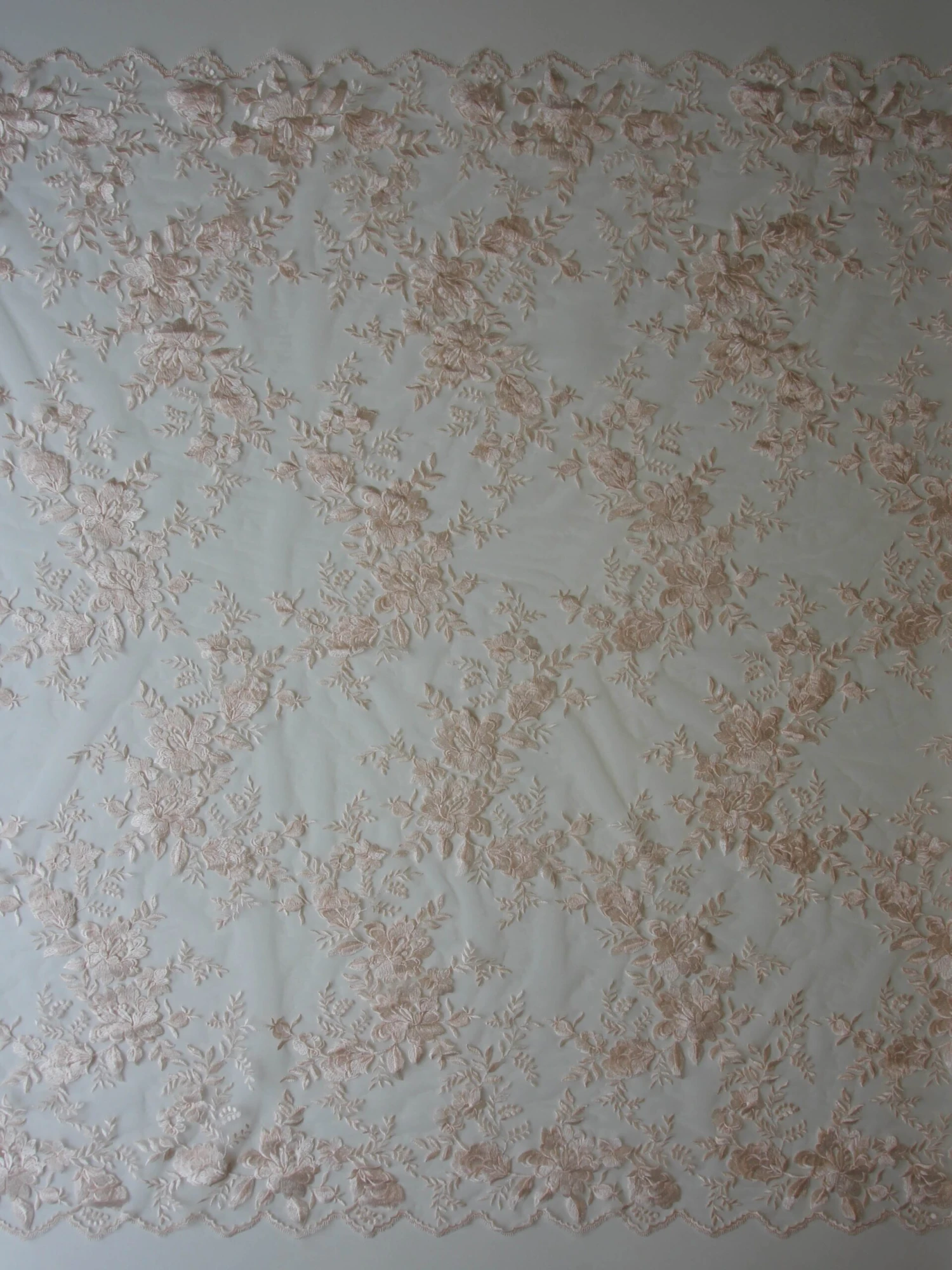 A blush pink embroidered lace which has matching scalloped borders and measures 132 cm (52″) wide. The design is a very attractive floral pattern, the largest flower in which measures approx 8 cm (3″) across.