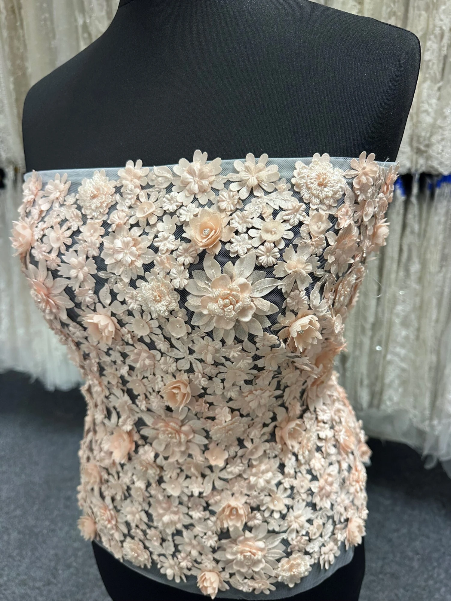 On a tulle base, Mackenna is a lace that is adorned with perfect pink buds and delicate flowers in 3D, the lace is extravagantly floral and flirtatious.