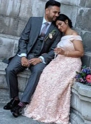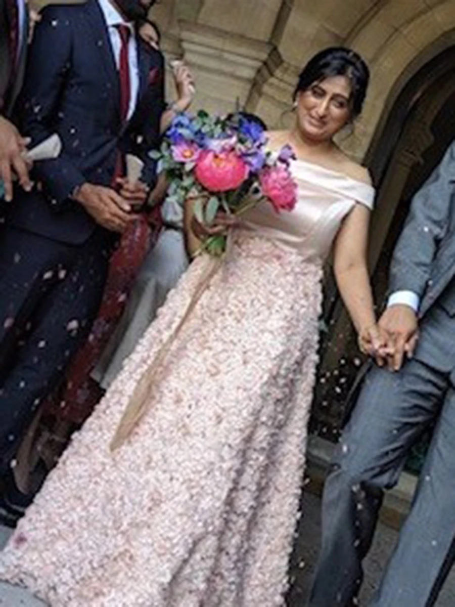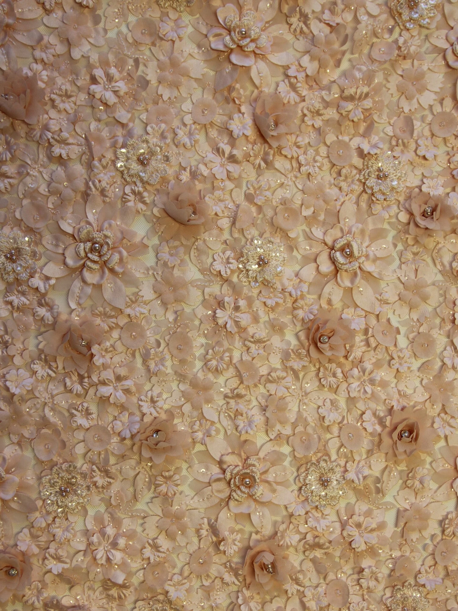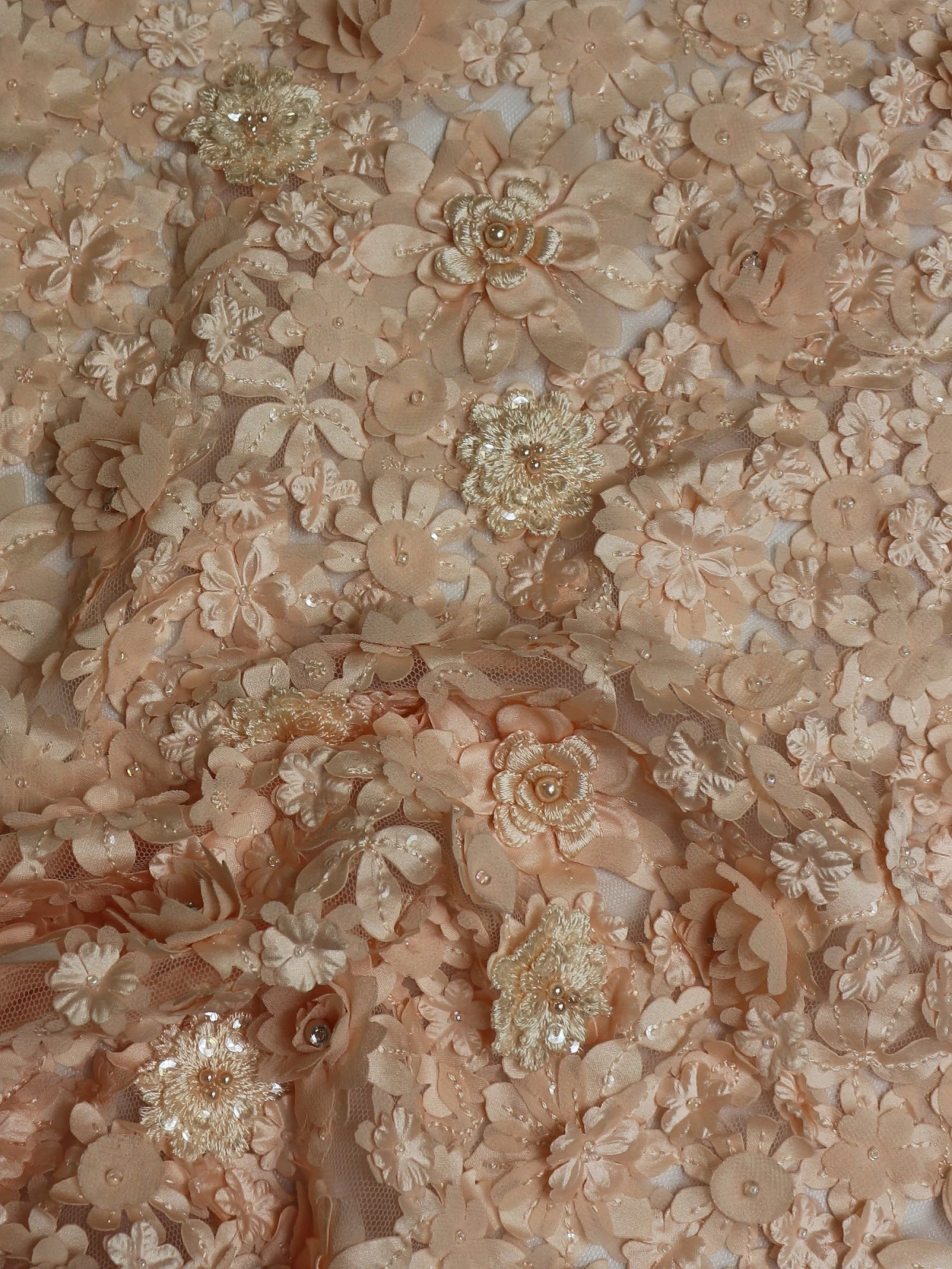 The flowers are a combination of satin, chiffon and embroidered and feature small pearls and beads in the centre of some of the flowers.
