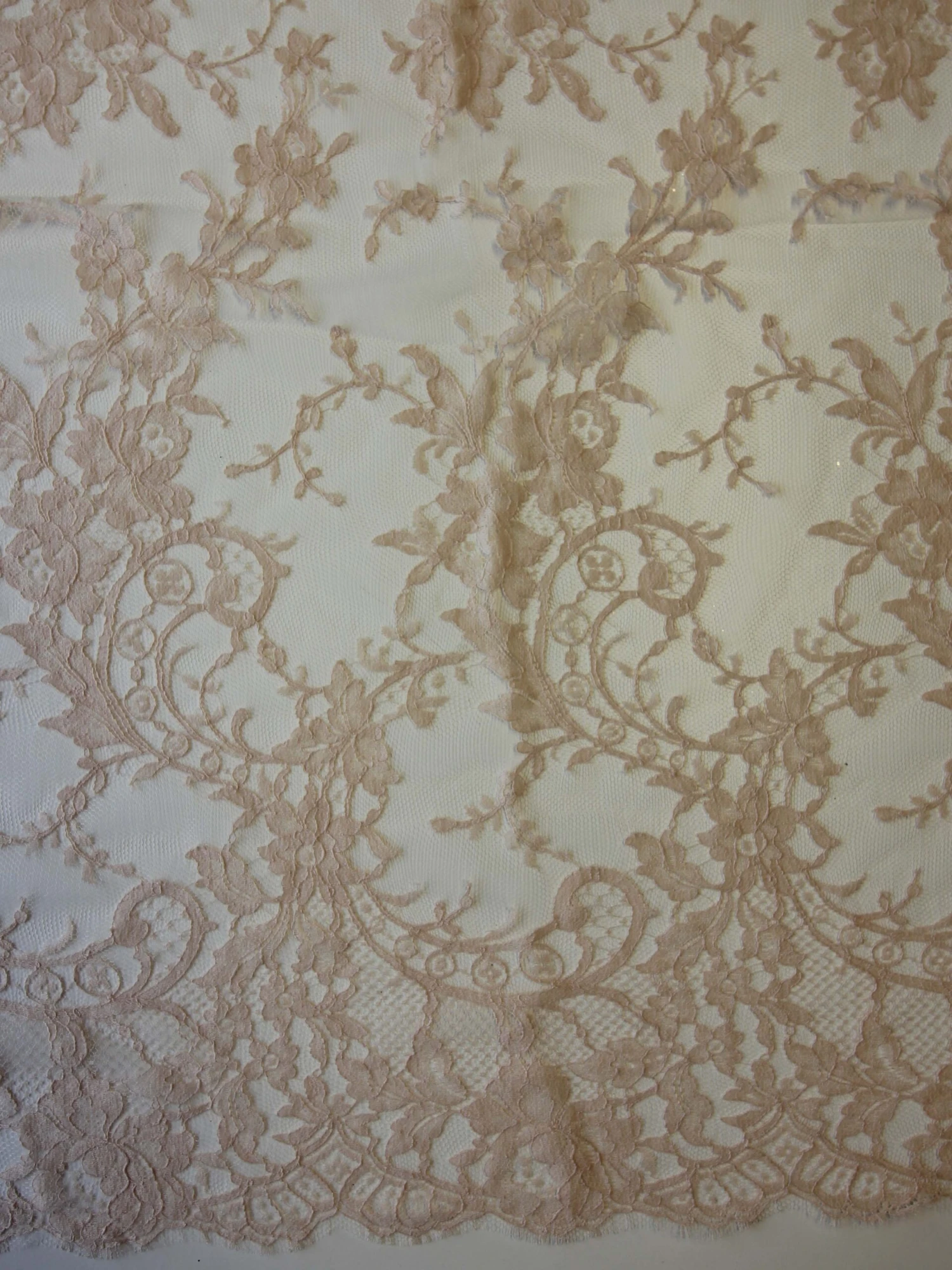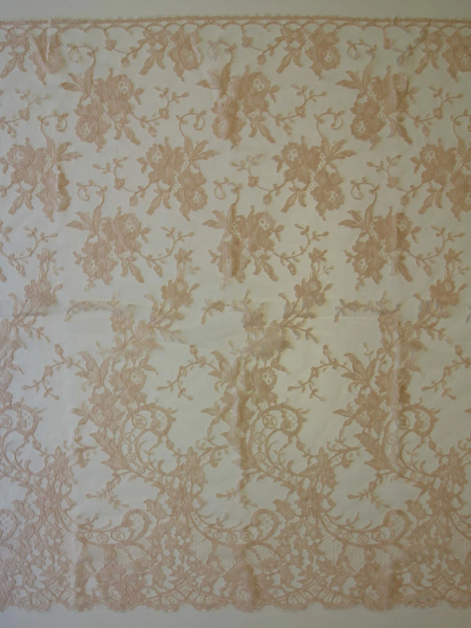This a pale pink Chantilly lace design and is one that has a single scalloped edge and floral bouquets running throughout the ground. These feature elegant leaver lace shading at its very best. The width is 91 cm (36″)