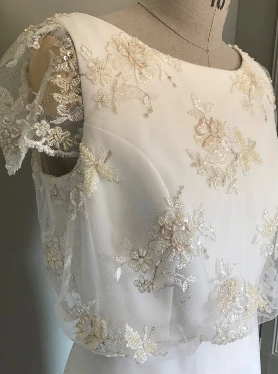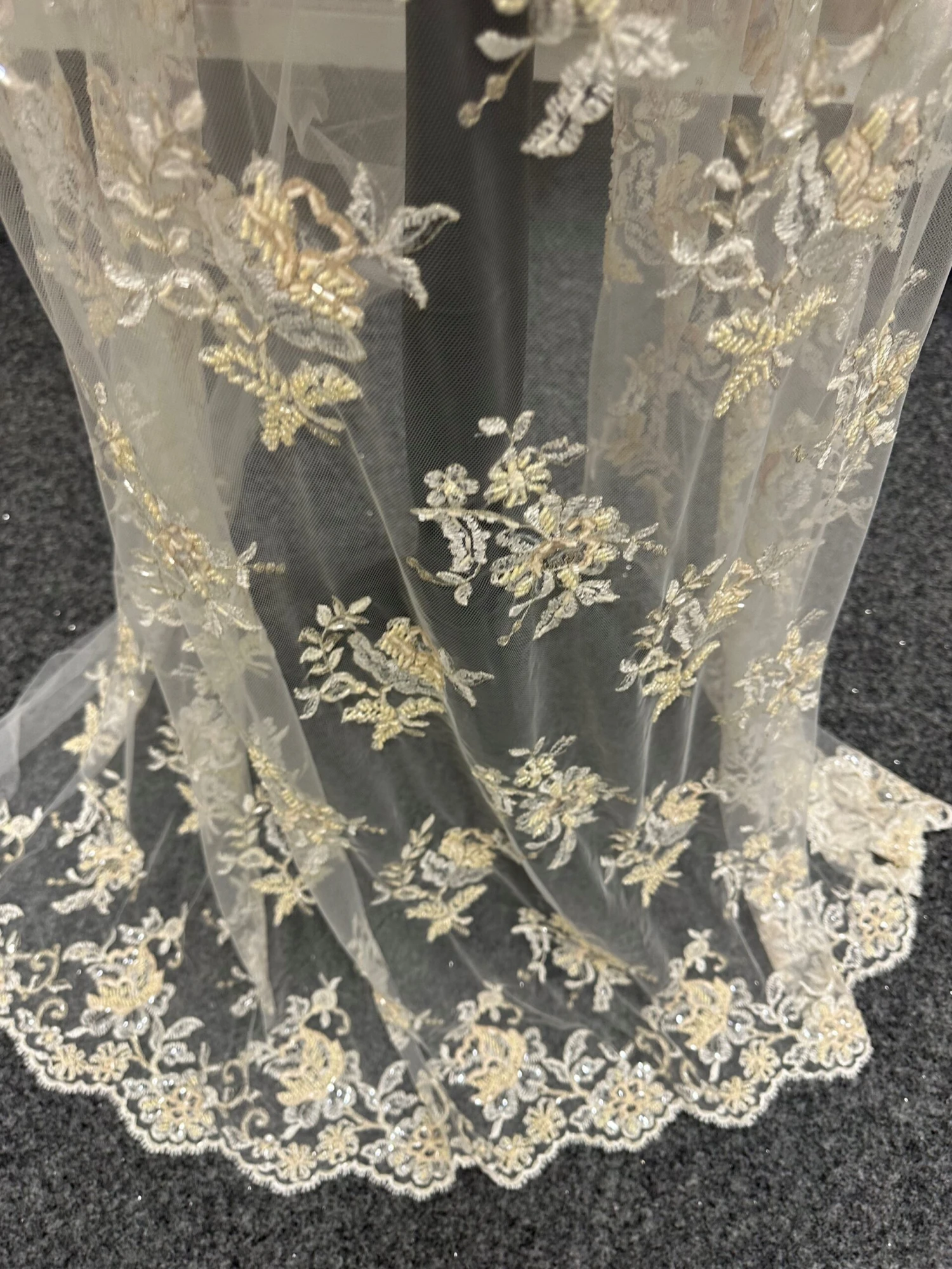 Chloe is a beaded embroidery lace on a fine tulle ground, incorporating 2 single flower motifs which are quite distinct. Both motifs have an embroidered ground of champagne and ivory, overlaid with sequins and beads and are outlined with a fine filigree metal thread, making a stunning combination.