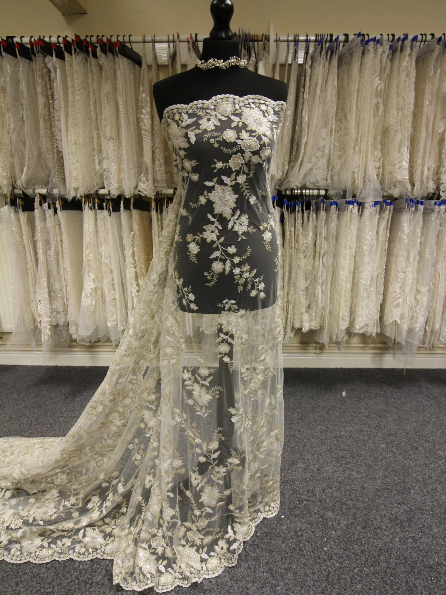 Kendall is a beautiful lace with a floral theme that has been delicately embroidered across the width of 132 cm (52″) with a metallic champagne/gold lurex thread.