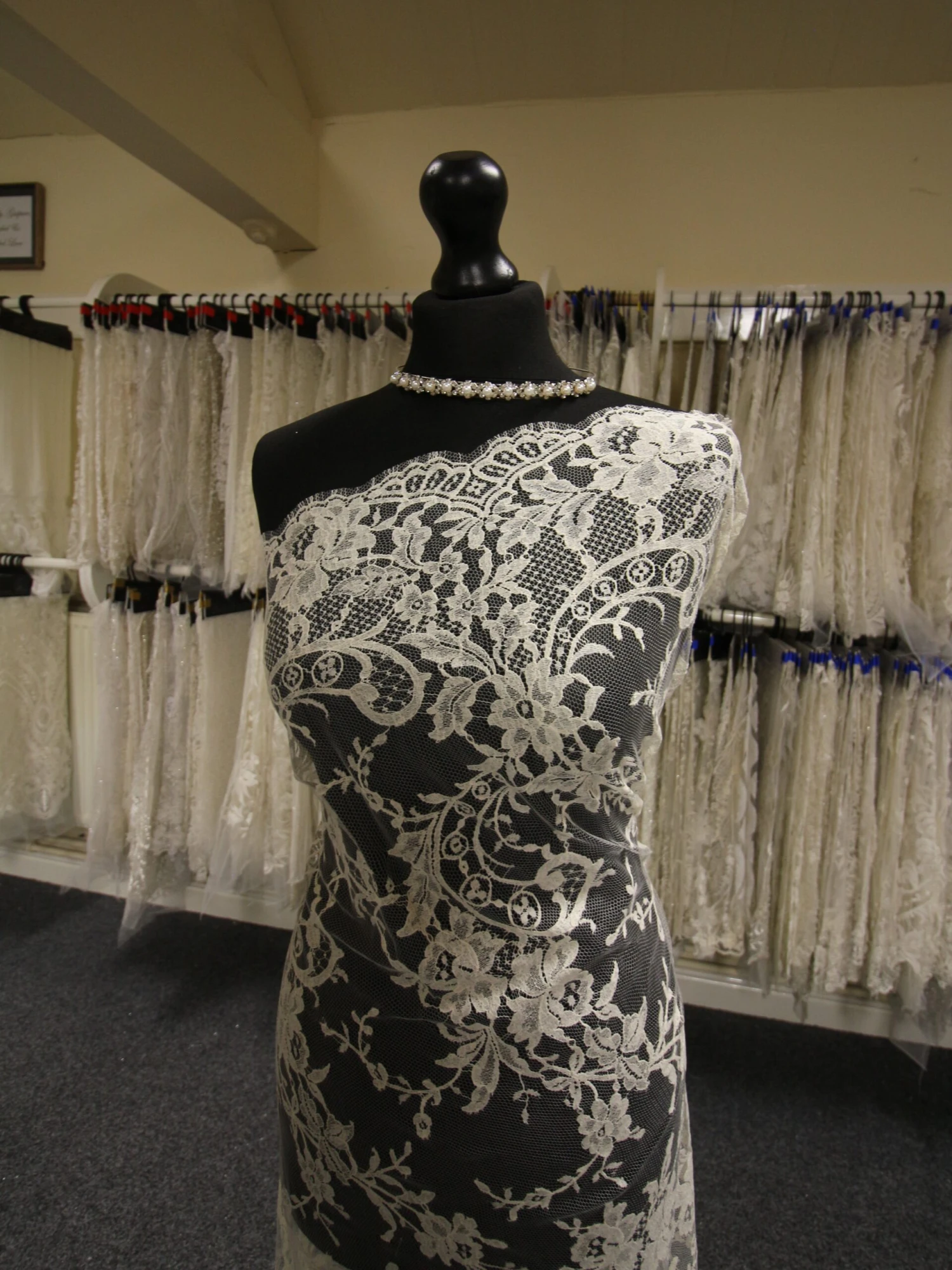 This bridal lace is also available in white and ivory  at a narrower width as Kate.Â