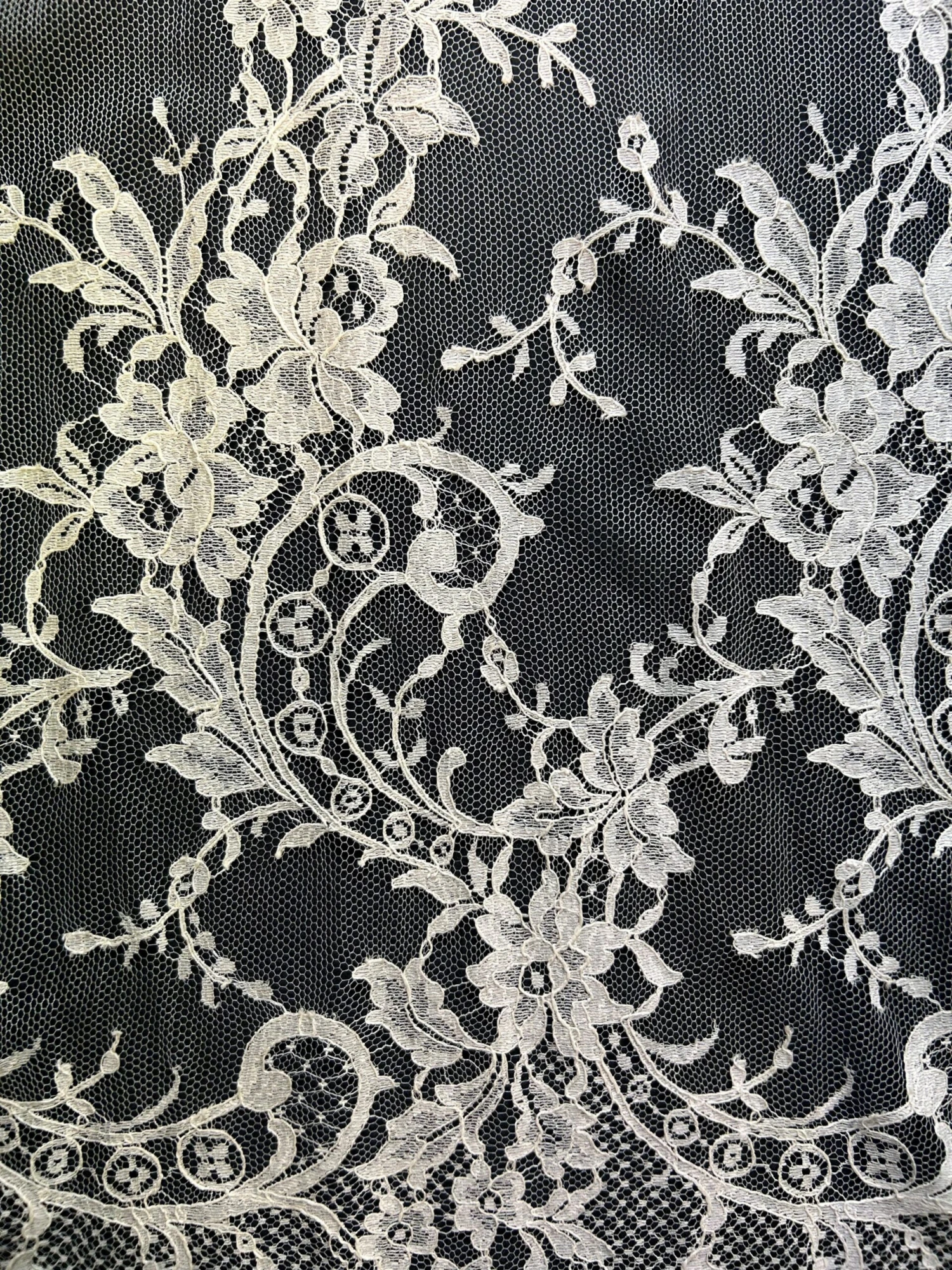 The motif is a floral Bouquet, which features elegant Chantilly shading at its very best. From the border of the lace, a magnificent floral and foliage decoration rises 56 cm/22″. Â