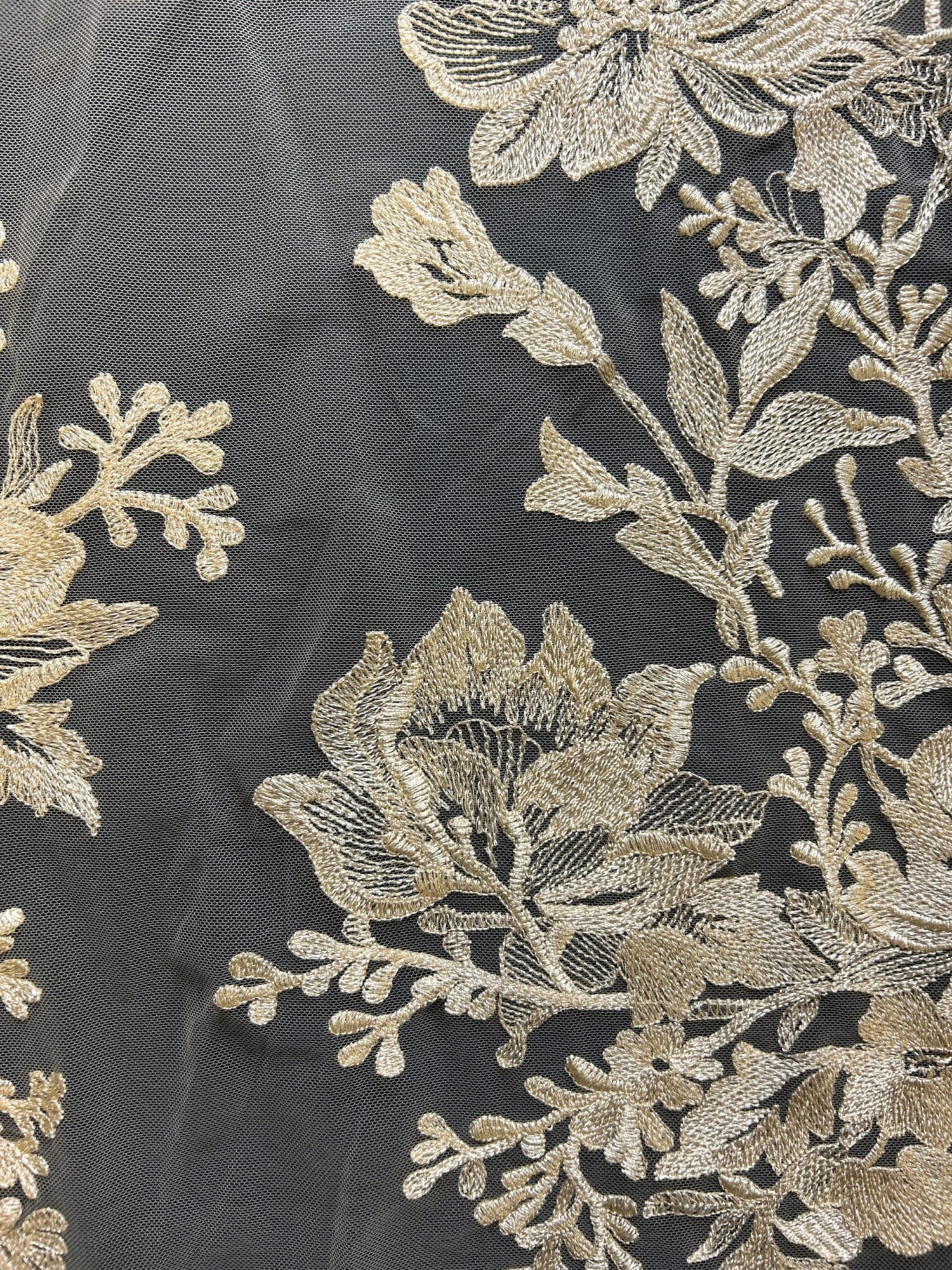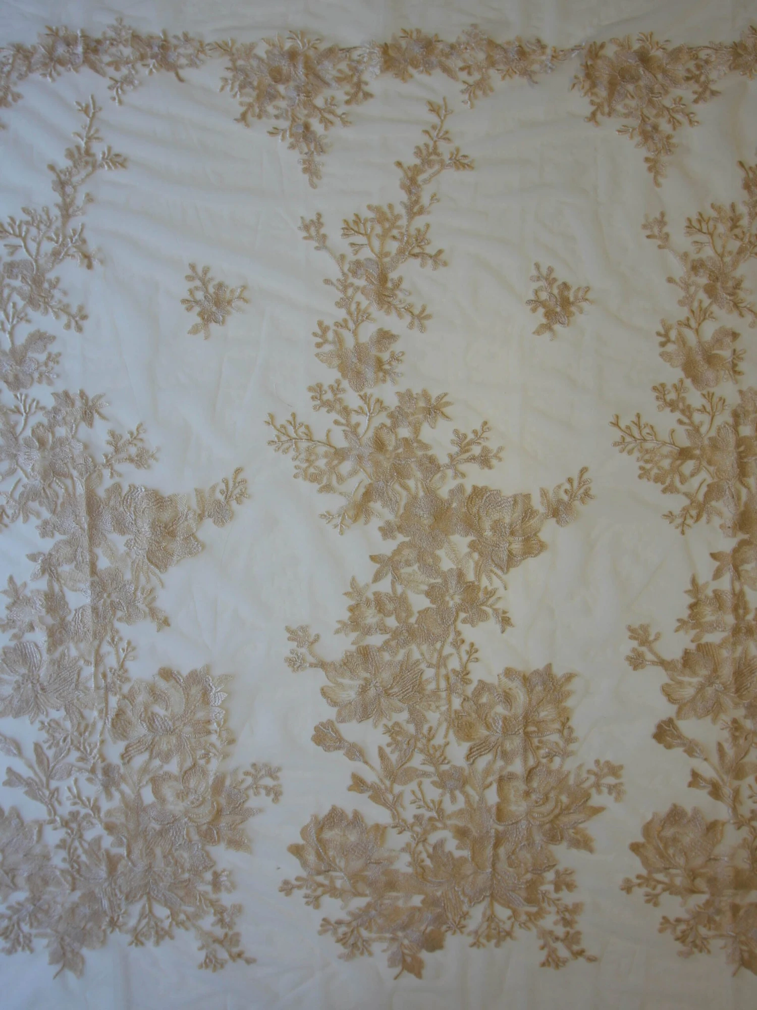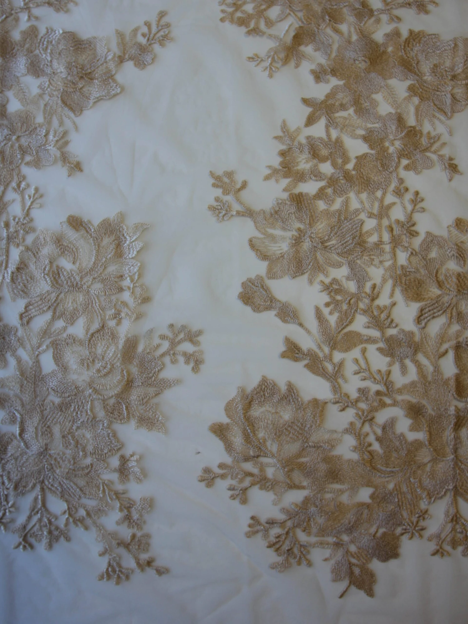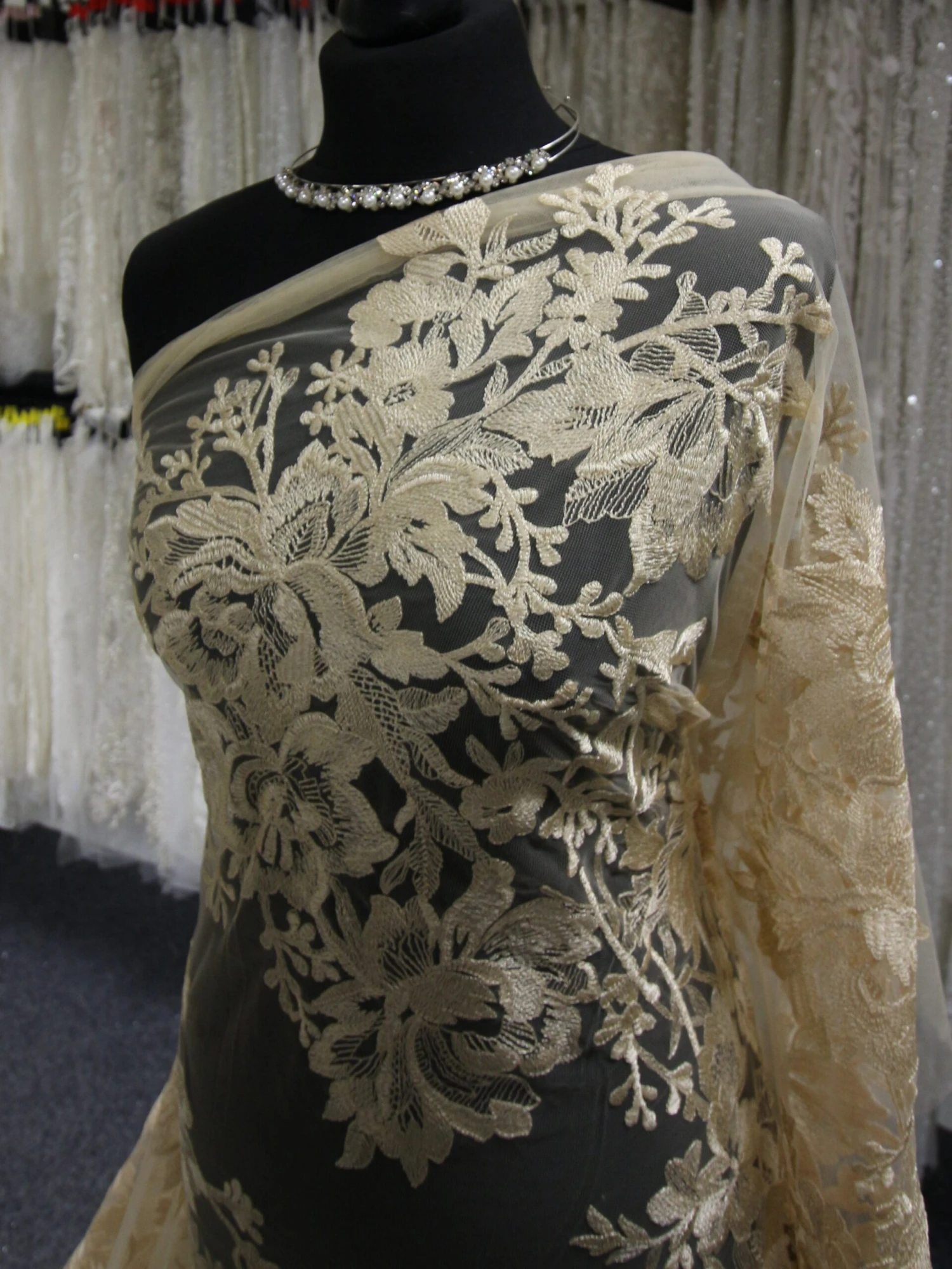 A dramatically embroidered champagne coloured lace on a champagne tulle base that offers drama and beauty. This lace measures 130cms (51″) wide. A variety of different embroidered techniques have been used to give this design wonderful detail with floral bouquets emblazoned across the tulle. This lace would make a stunning wedding dress and is also suitable for mother of the bride too. We also offer this lace in ivory and silver and ivory.
