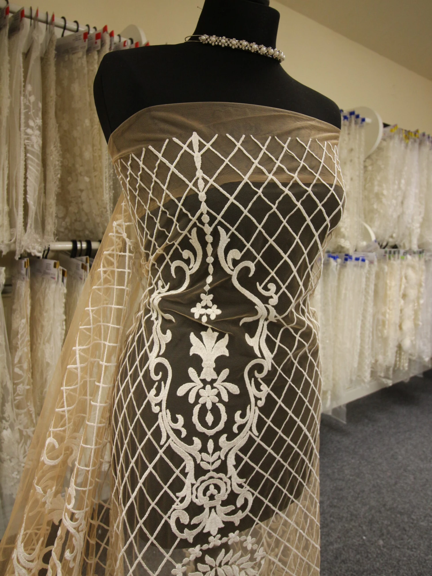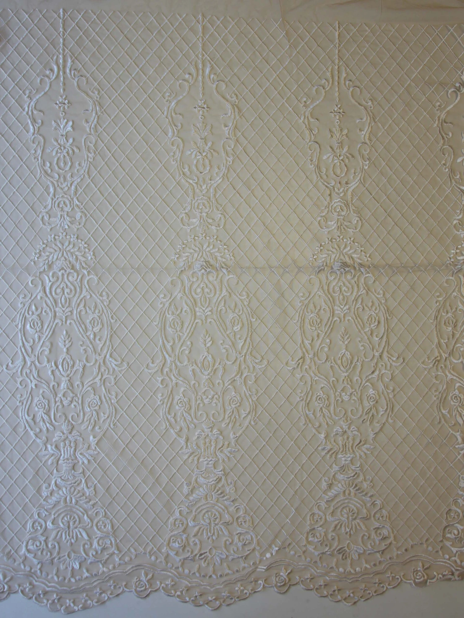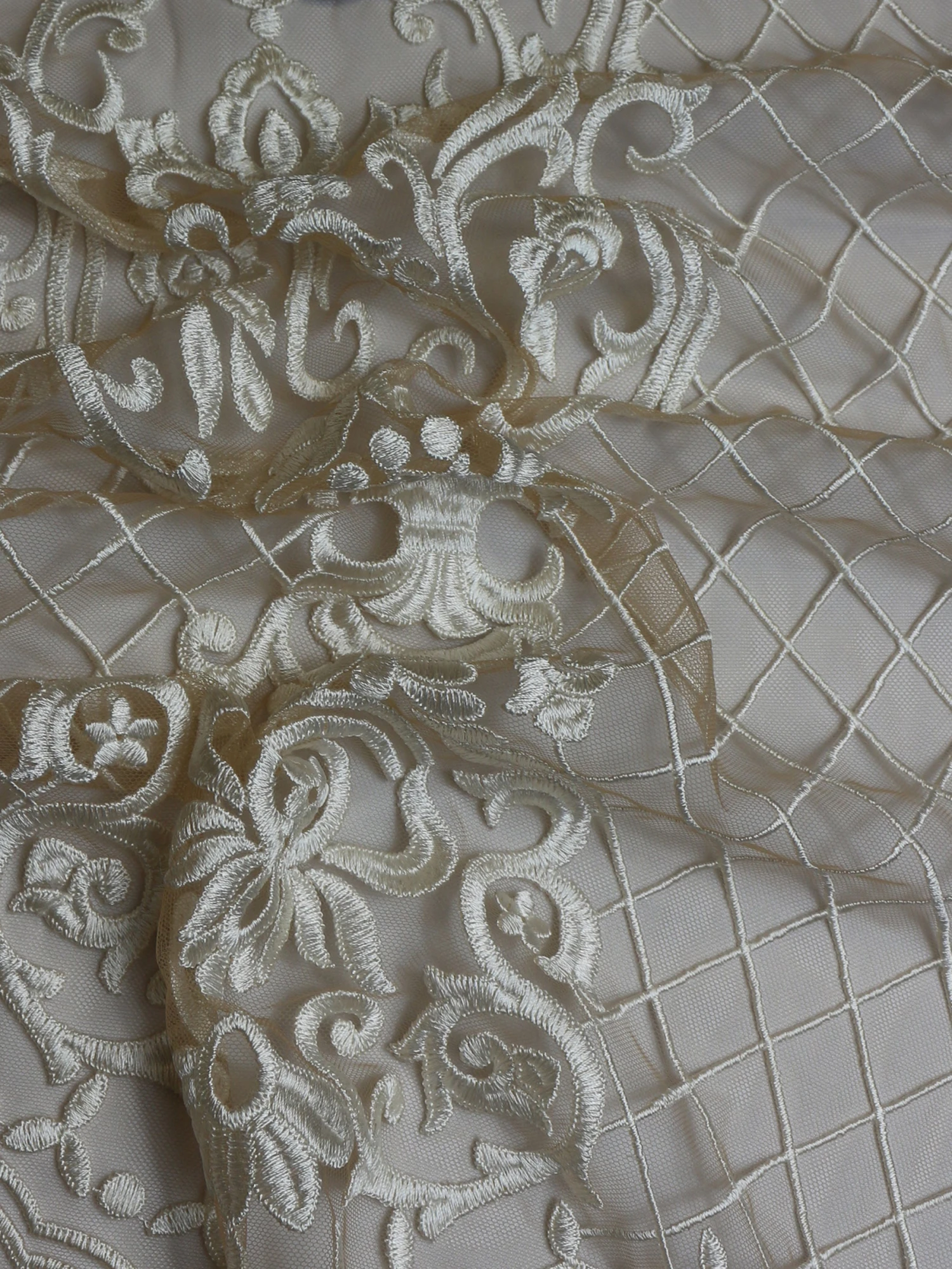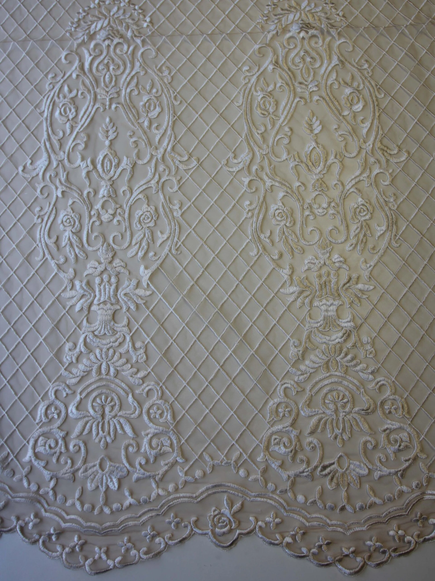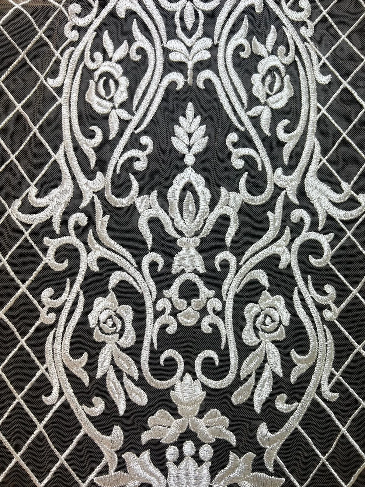 A stunning embroidered champagne tulle using dark ivory thread. The embroidery measures 132 cm/52″ from edge to edge and forms a scalloped border on just one side. The pattern repeats on 30 cm (12″) and features a glamorous lattice and contemporary, non floral design.