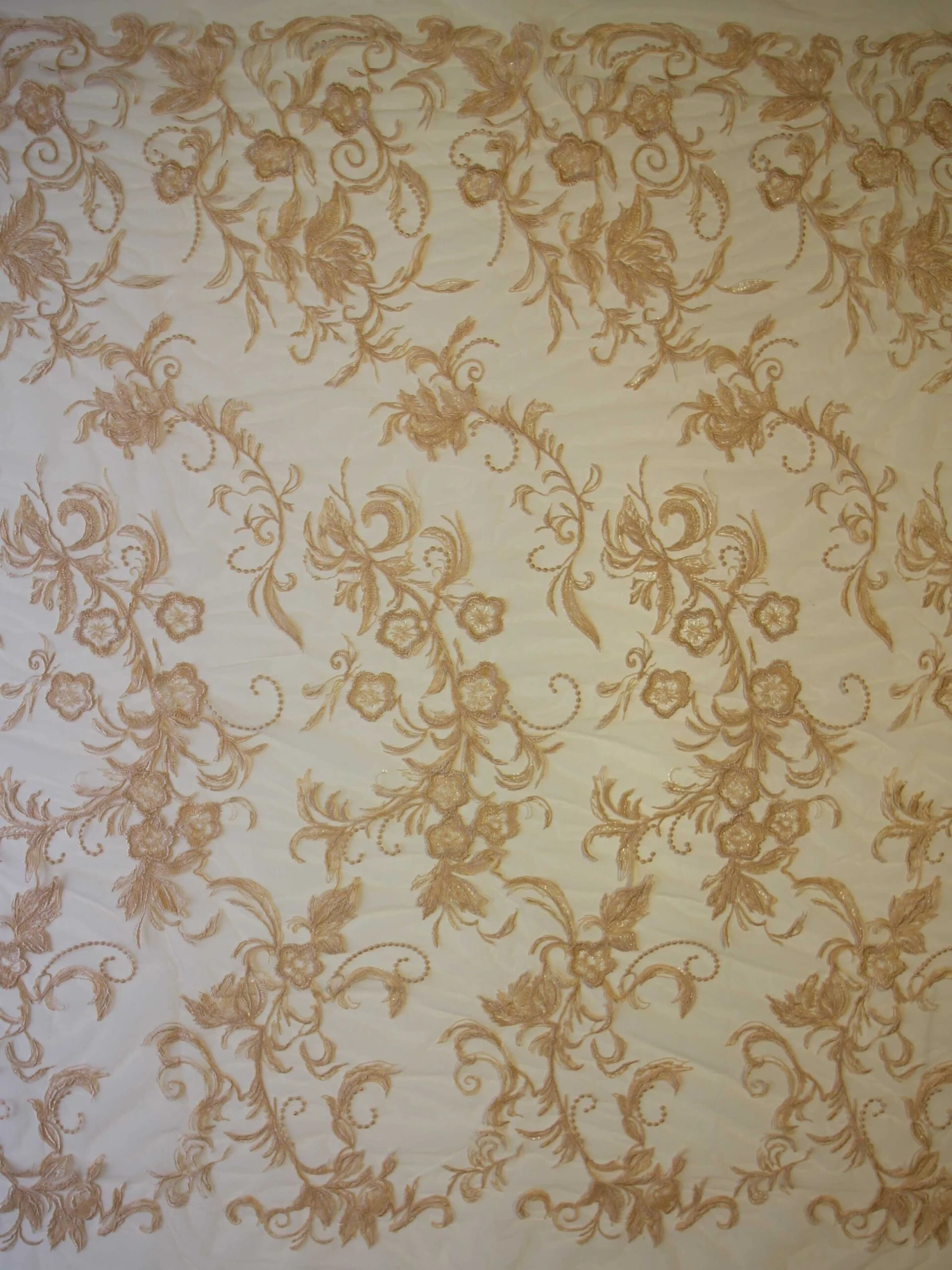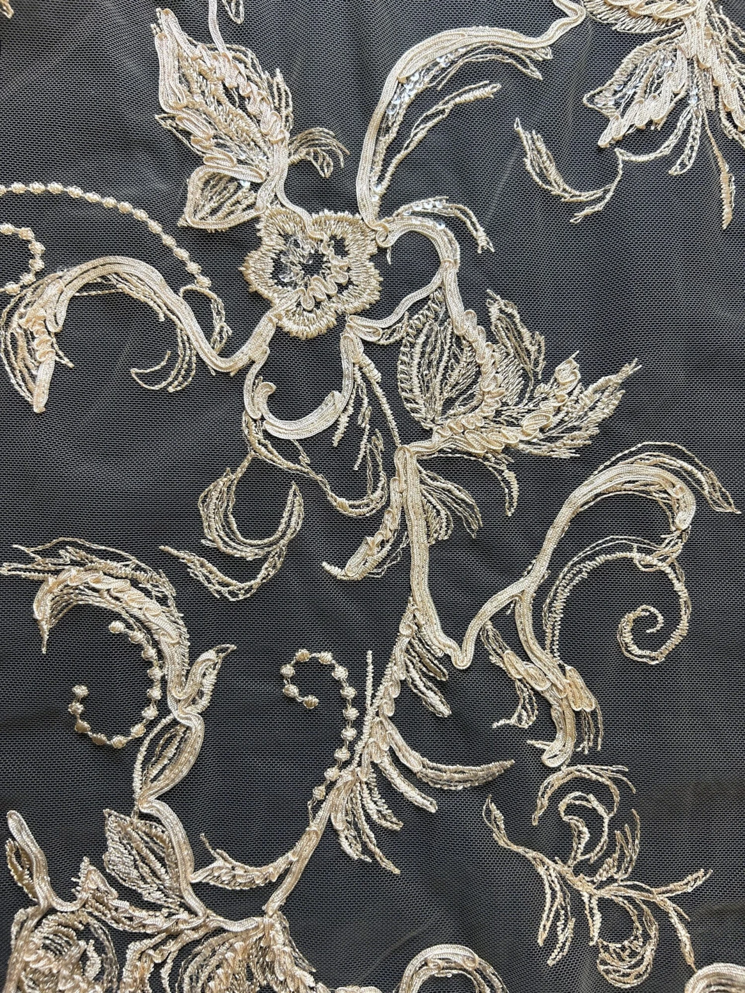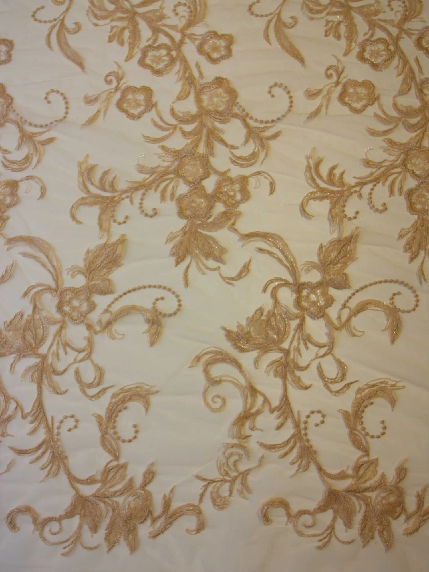 Zarine is a spectacular swirling champagne lace with floral accents. A delightful, lightweight drape with wonderful, quality embroidery and cording that highlights the swirls. The addition of a few translucent sequins adds a very subtle sparkle.