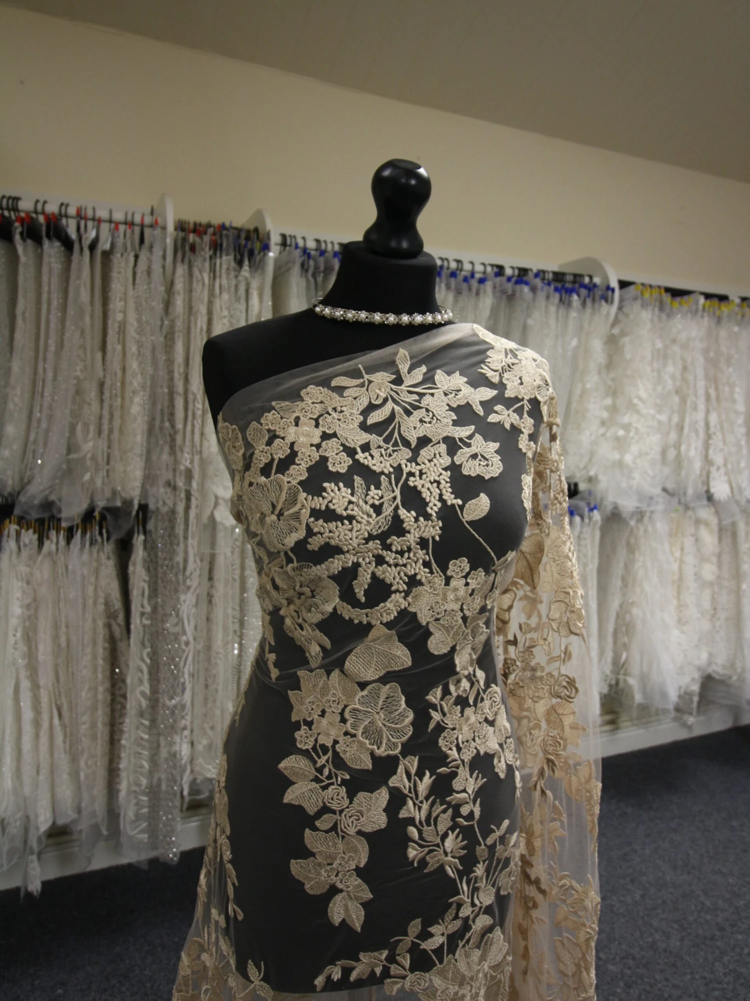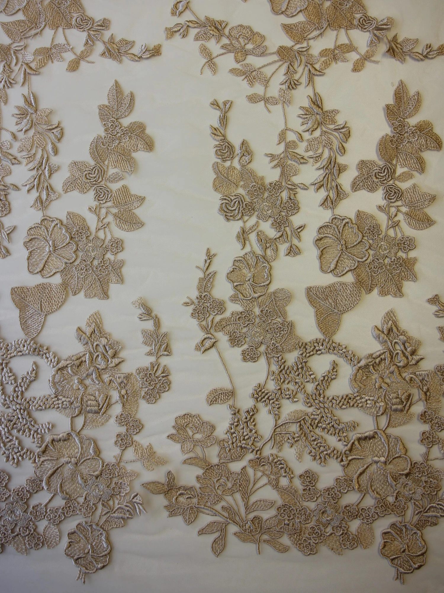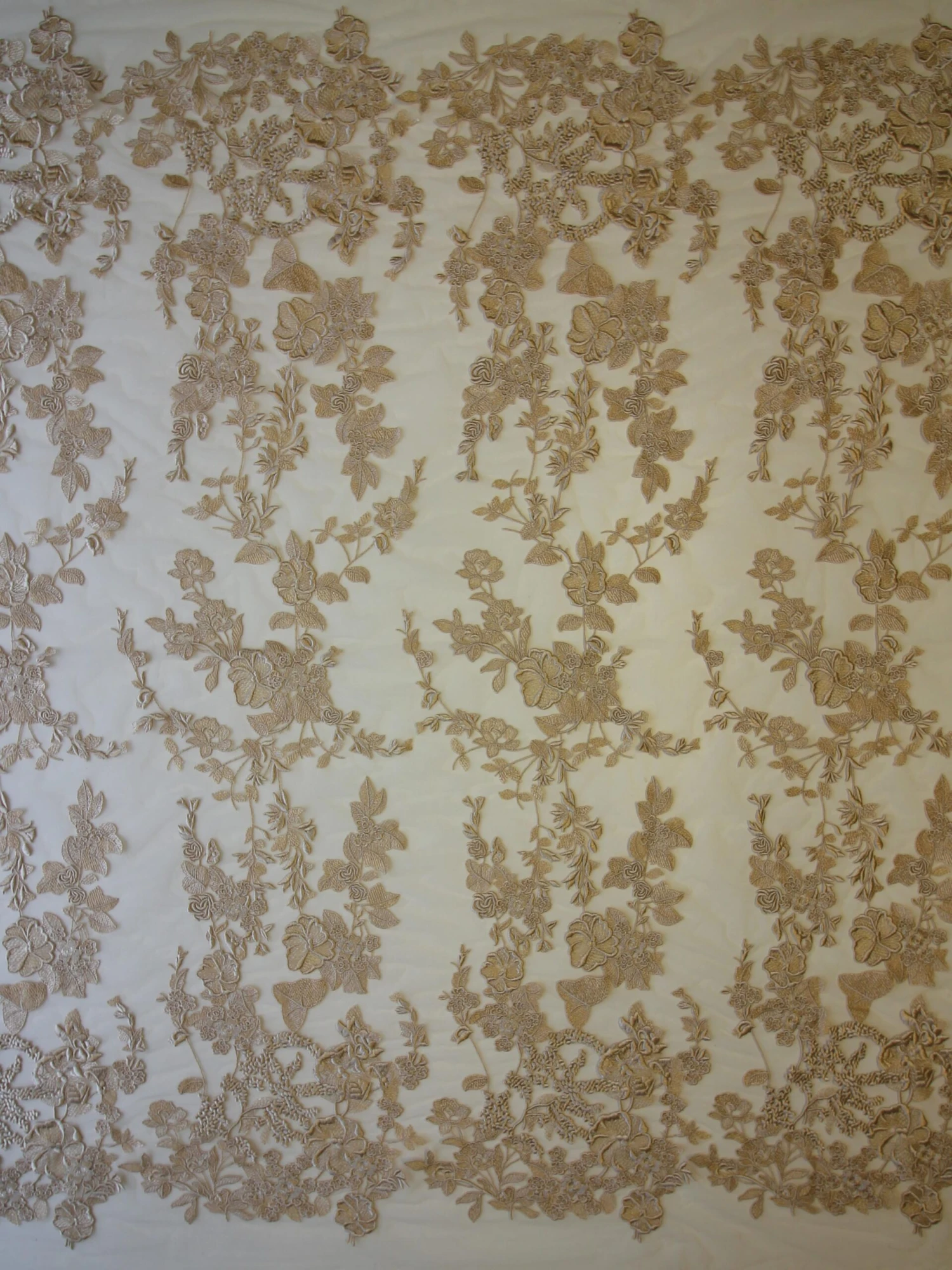 A classic champagne embroidery lace that is the same base as Meghan lace but without the 3D flowers, this design is also available in a range of other shades. Both sides of the pattern match one another. This measures 132cm (52″) and is a truly spectacular lace.