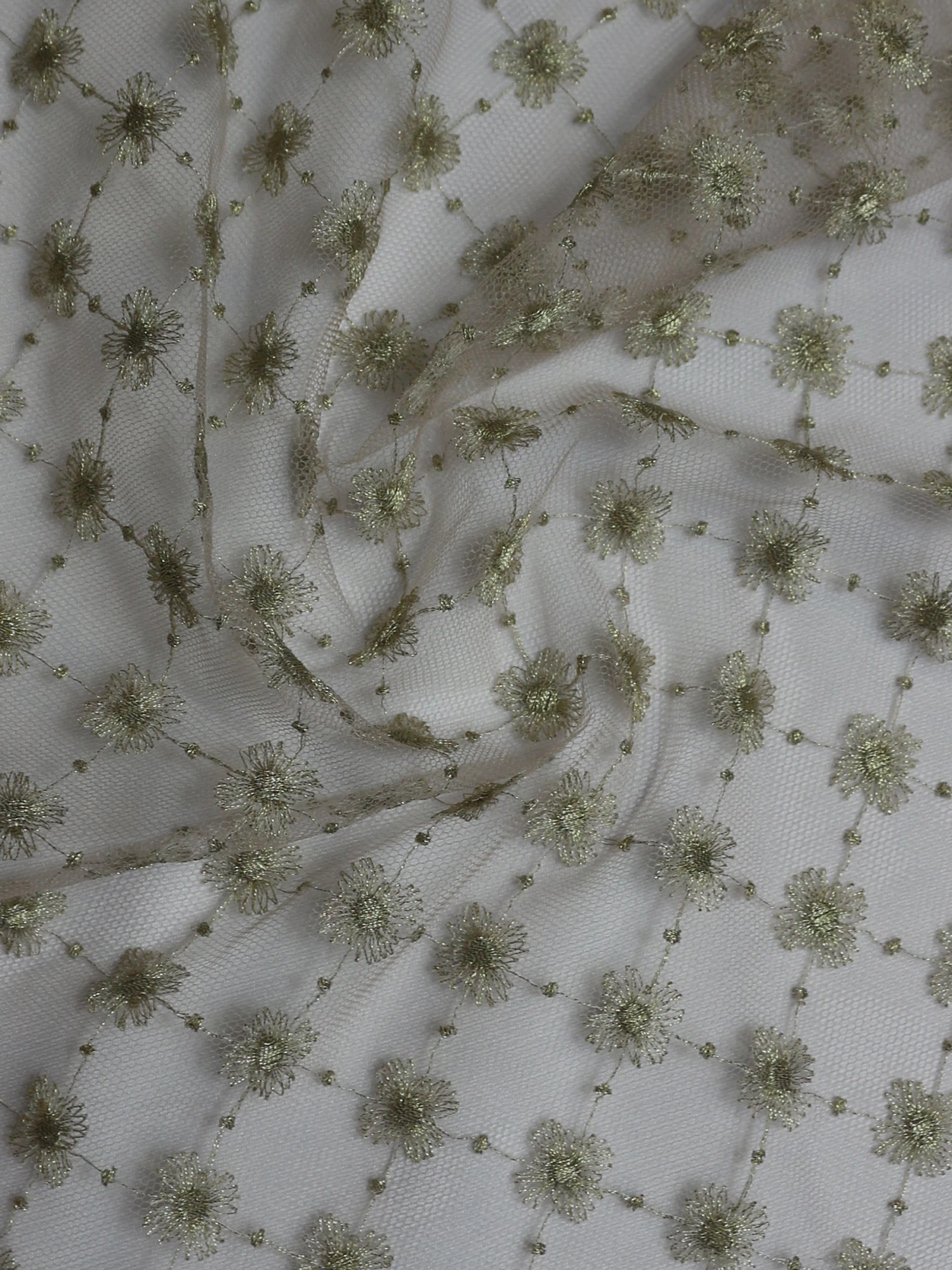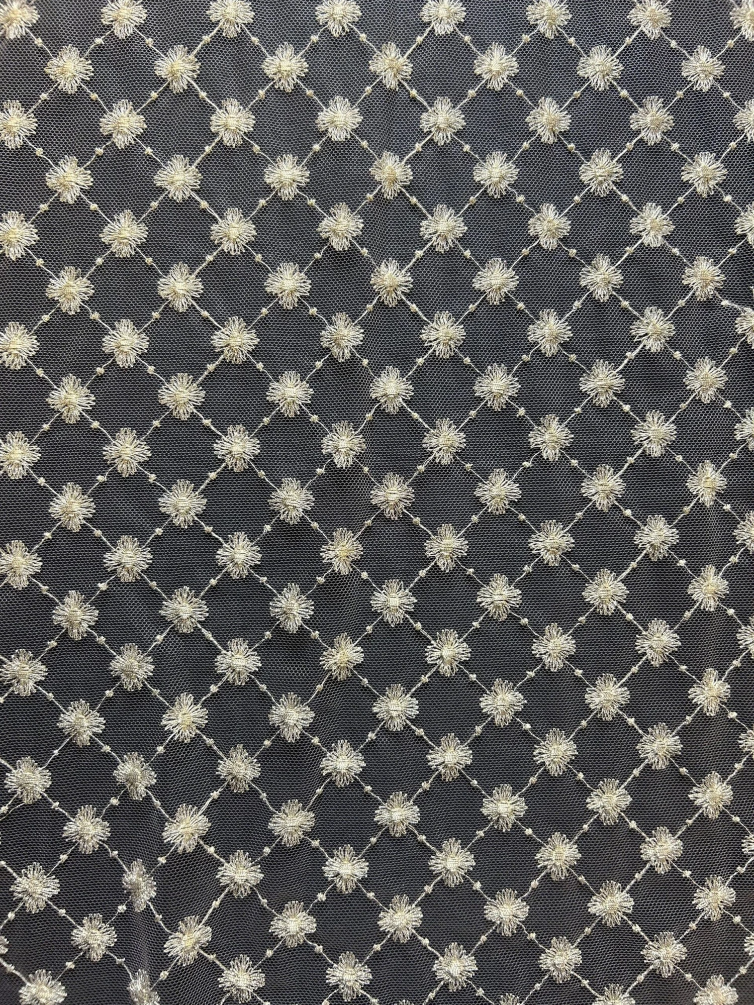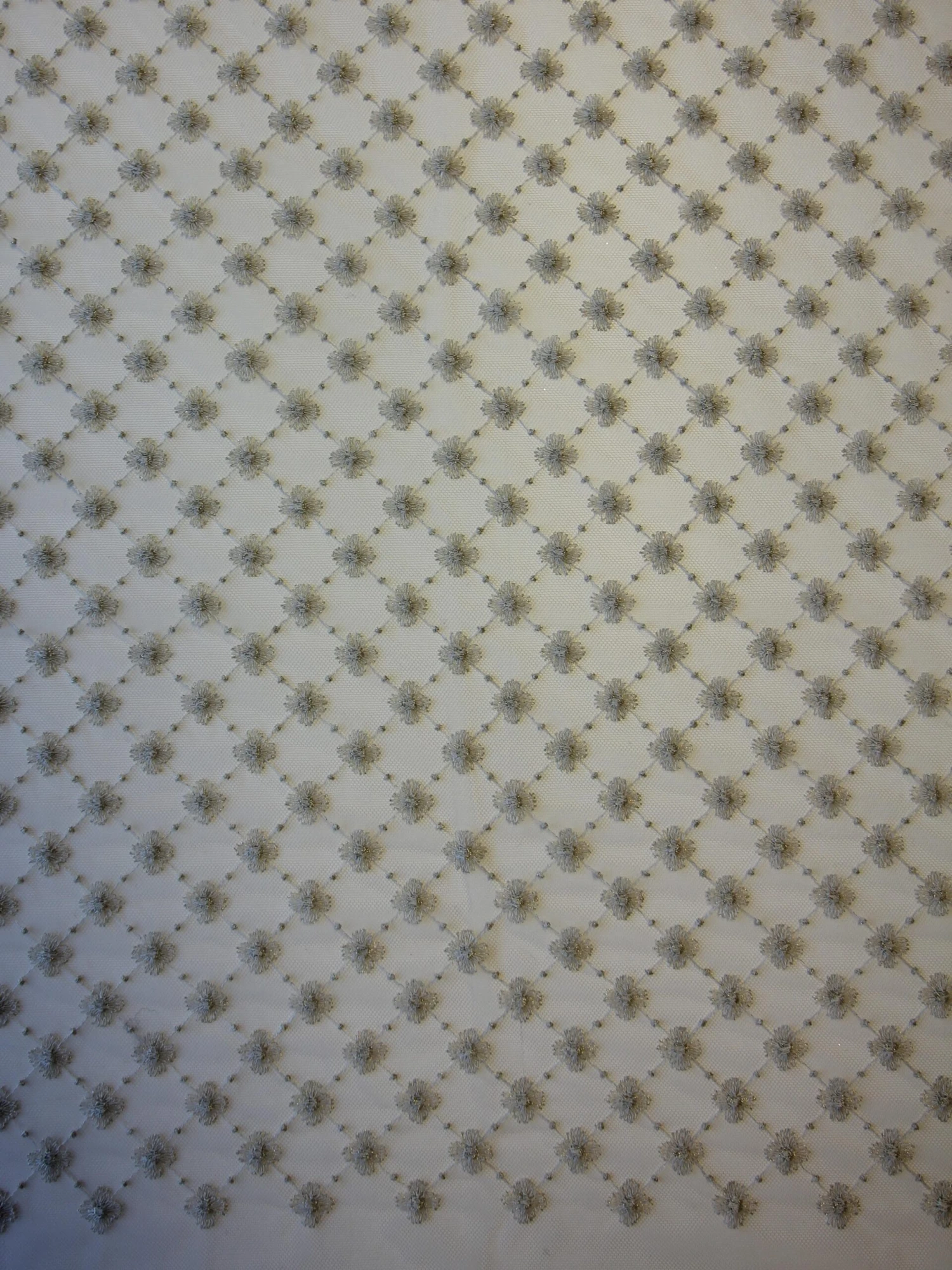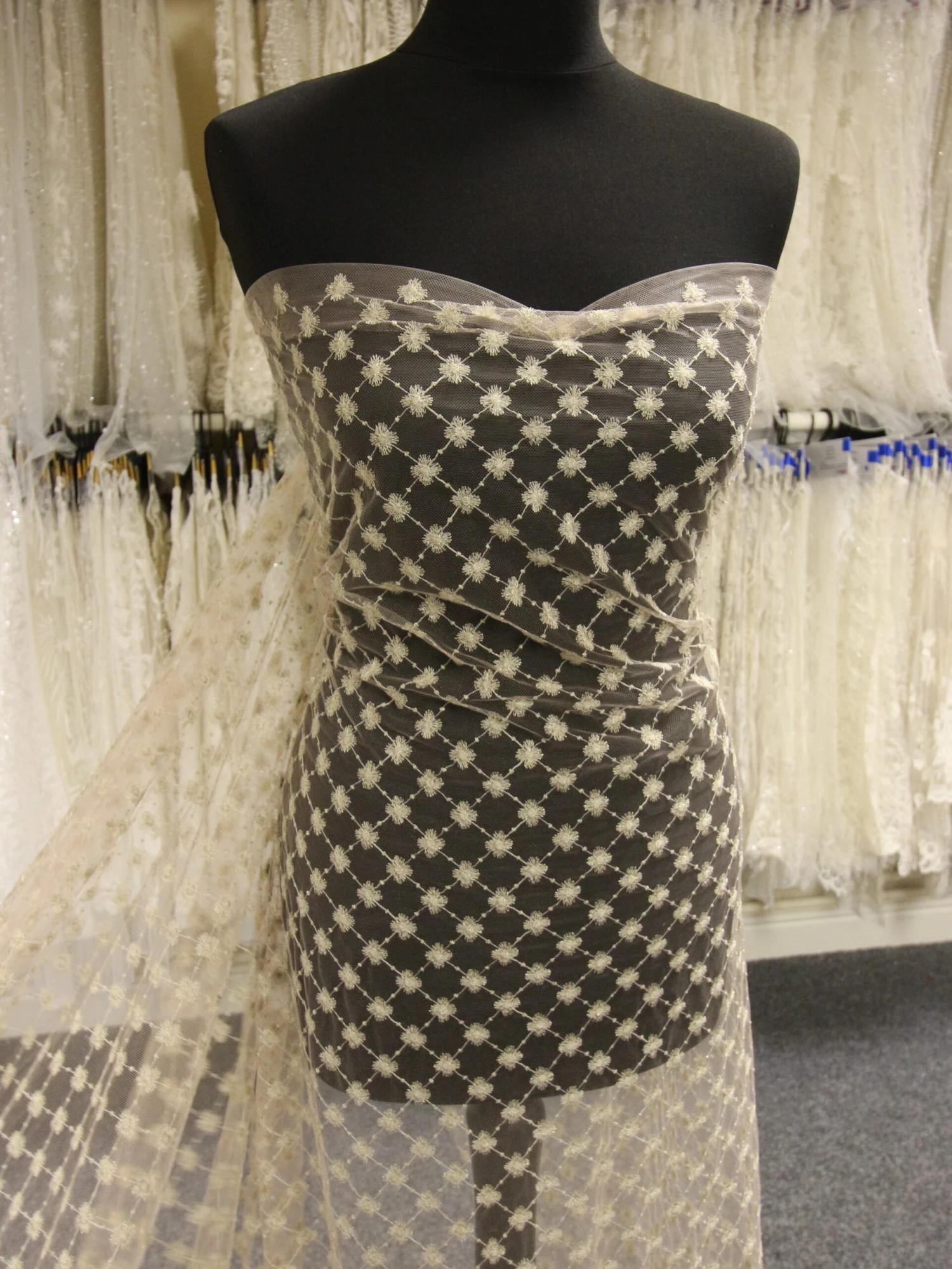 A very delicate embroidered French lace that is available to purchase in both ivory and champagne, that measures 140 cm (55″) wide and features 4 petaled flowers on a lattice work embroidery on a tulle base. Suitable for bride, mother of the bride or bridesmaids this is a very pretty and dainty lightweight lace with a lovely champagne hue.