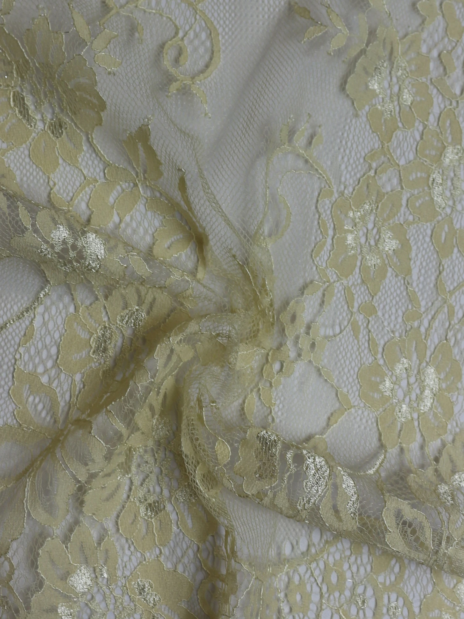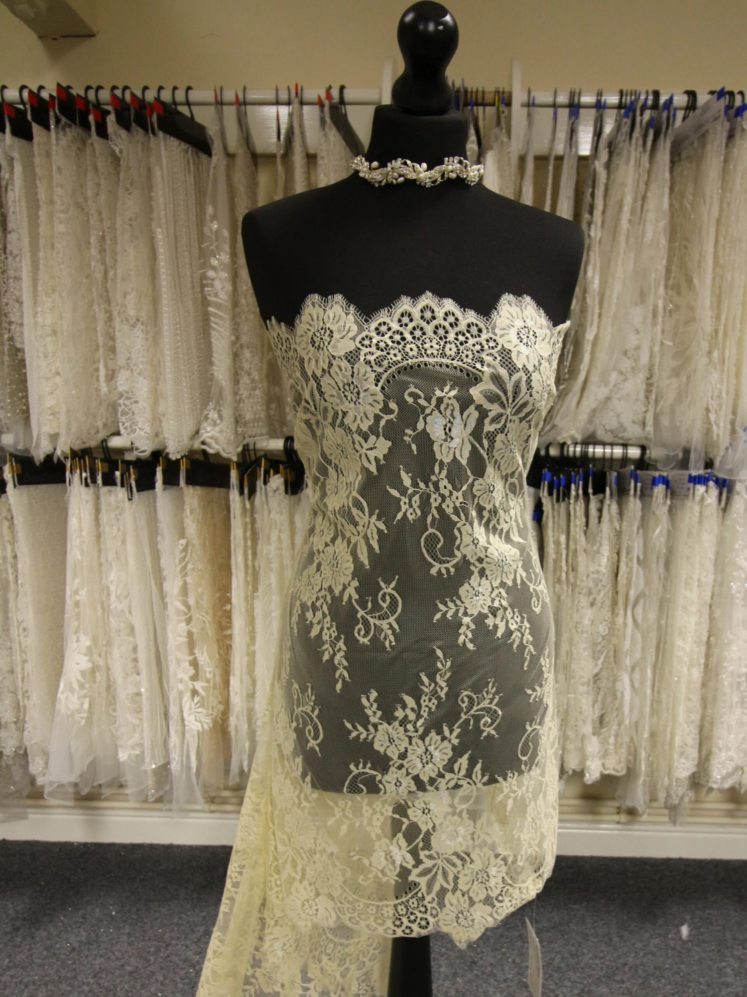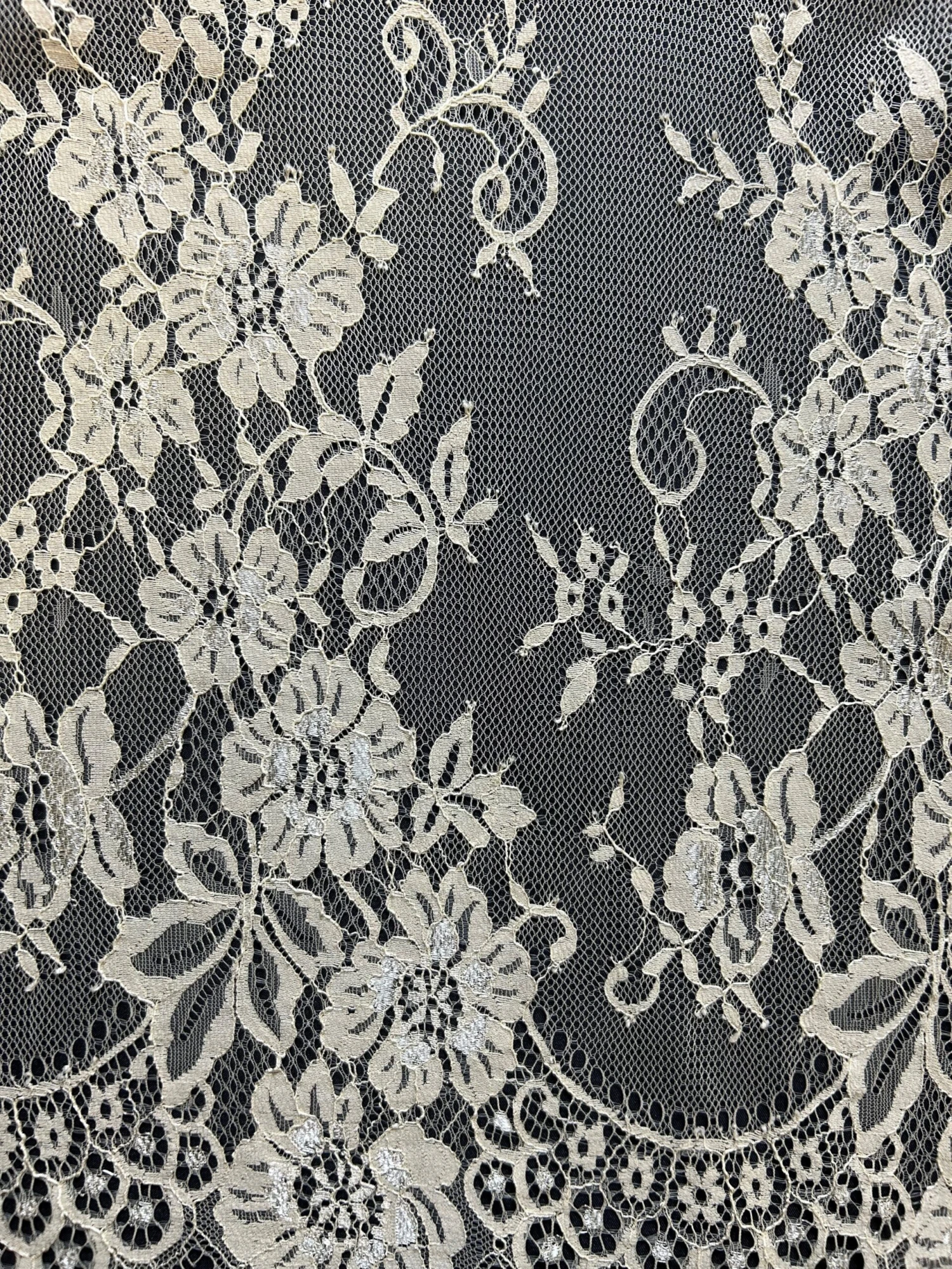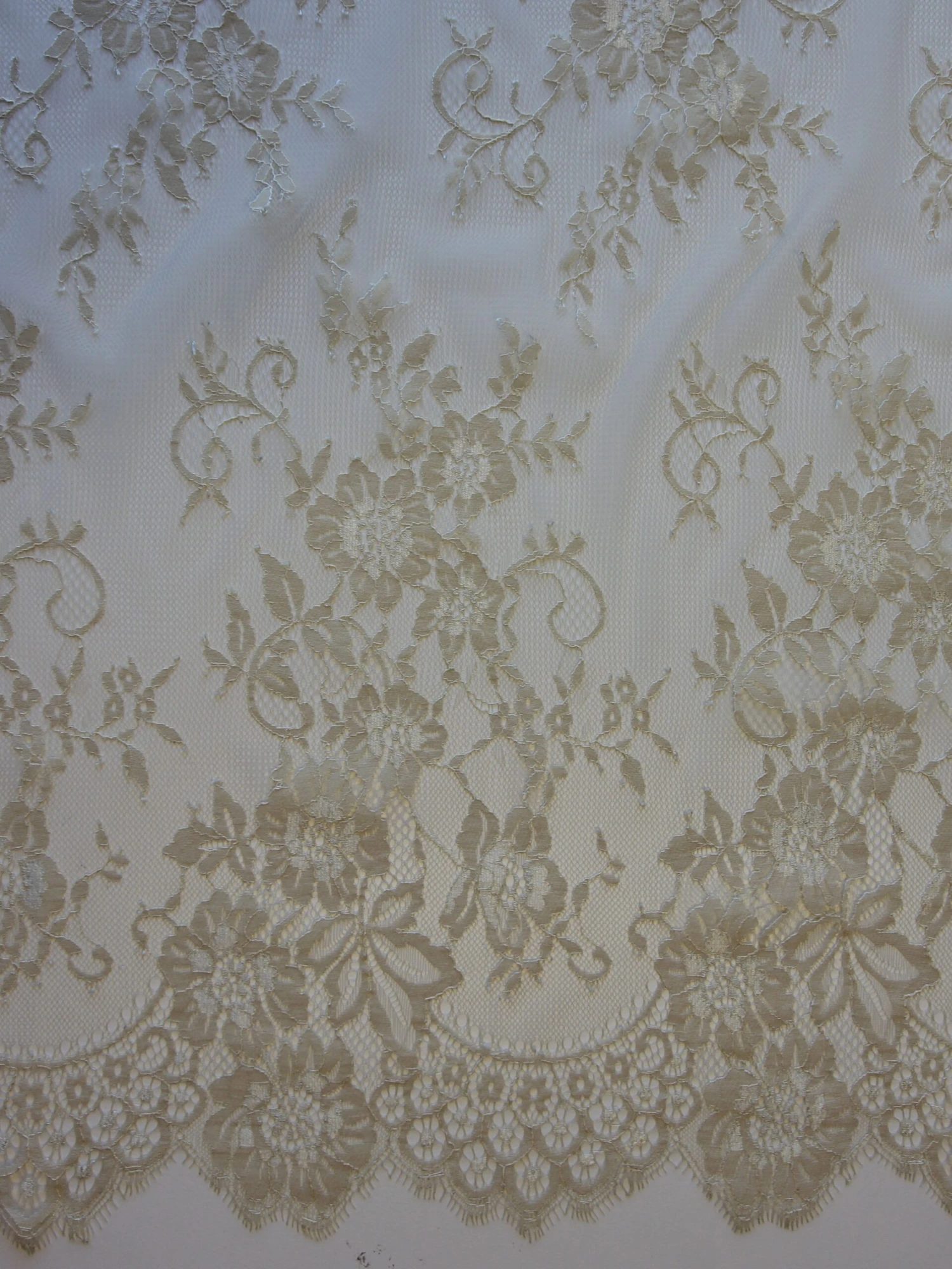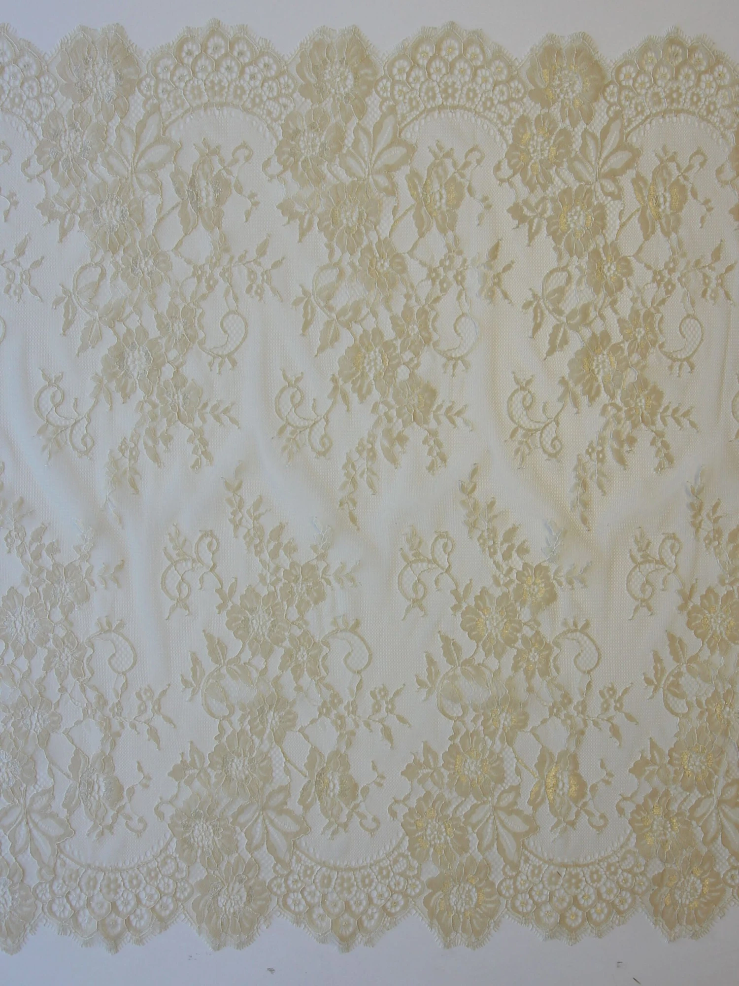 This lace is a rich champagne colour, measures 76 cm (30″) wide and has sides that are both fringed and symmetrically scalloped. The ground weaves are uncorded.