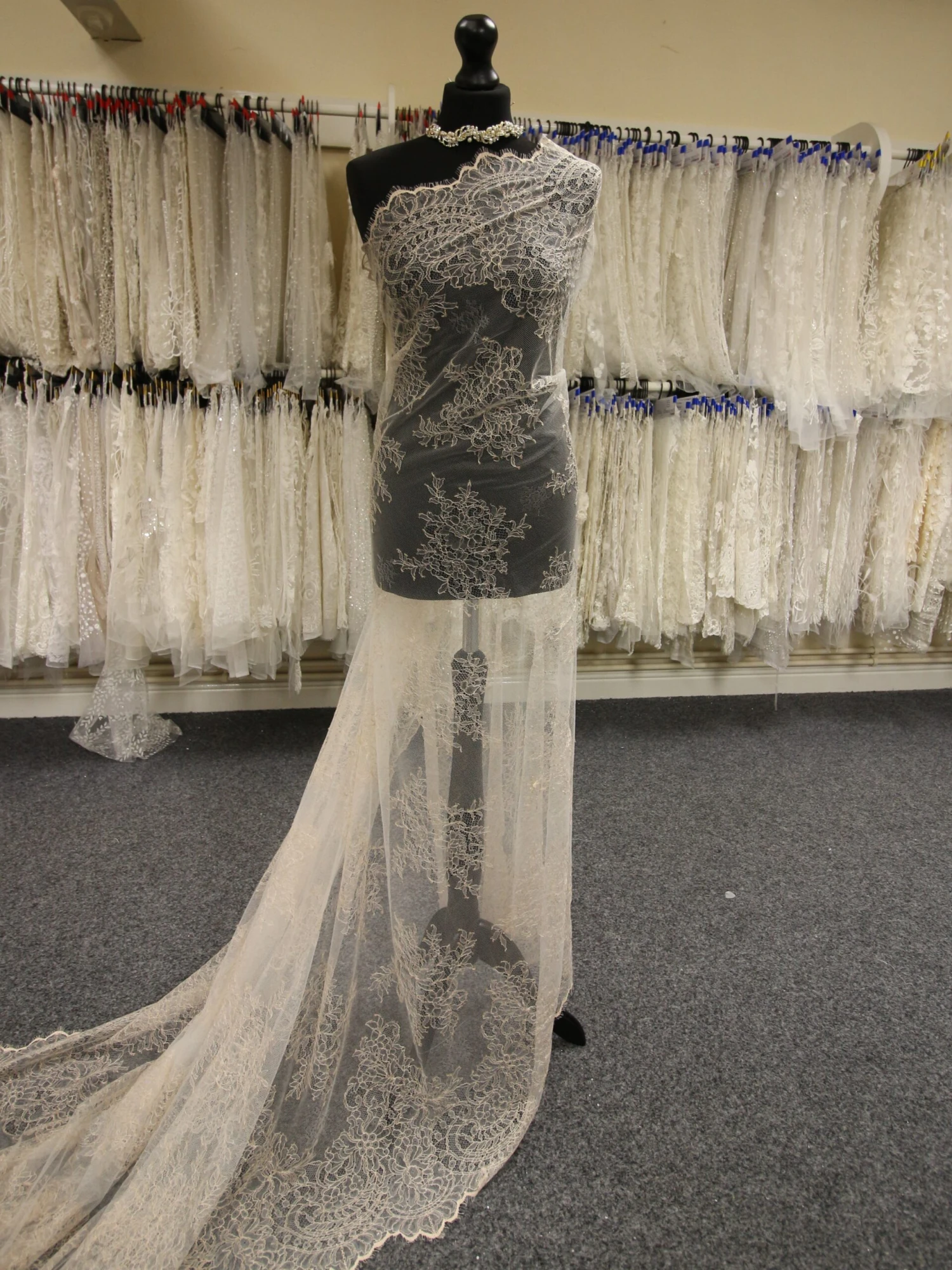 A Champagne coloured lightweight bridal lace with matching fringed and scalloped edges. Coralie measures 145 cm (56″) wide and will look beautiful over a satin dress fabric.