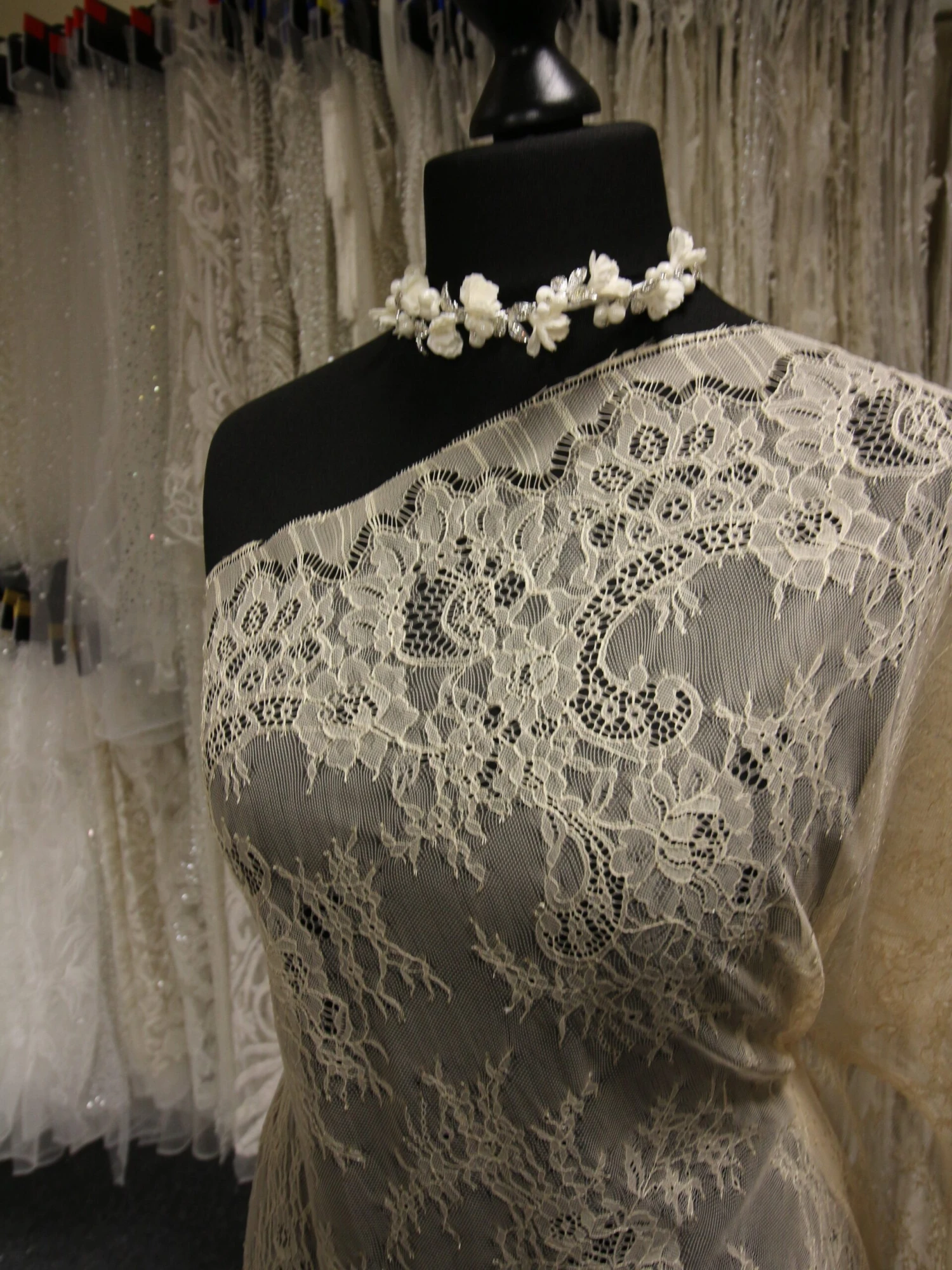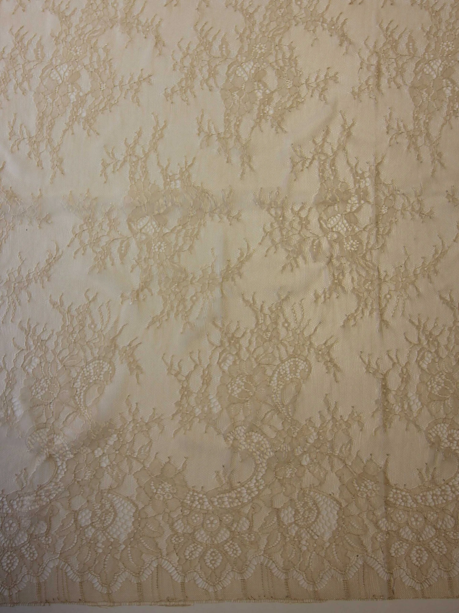 An extremely classic bridal lace in a pretty champagne colour that has dainty detail, which measures 142 cm (56″) wide.
