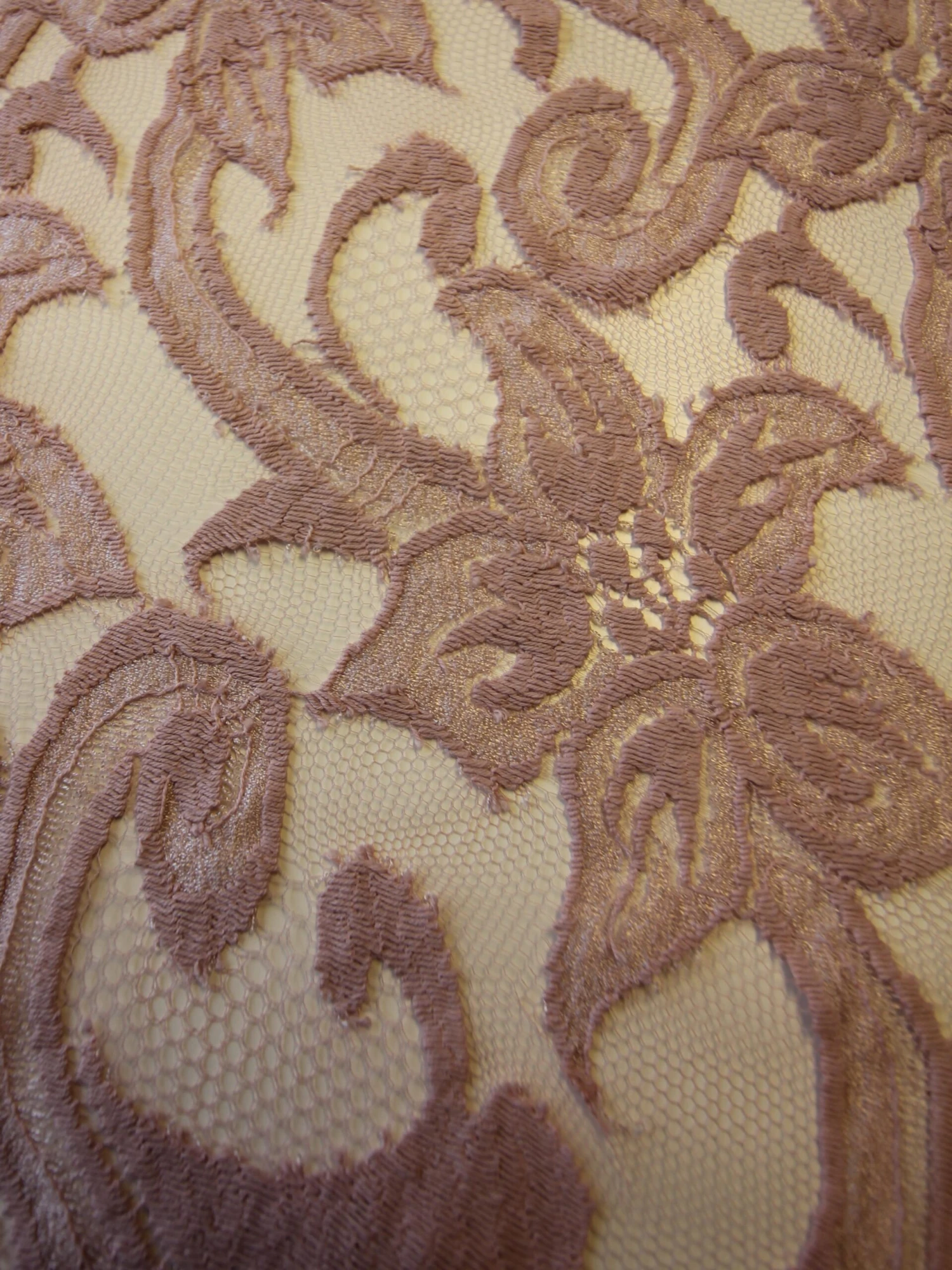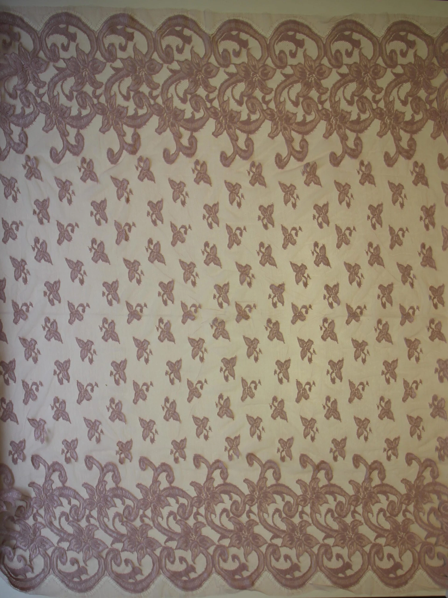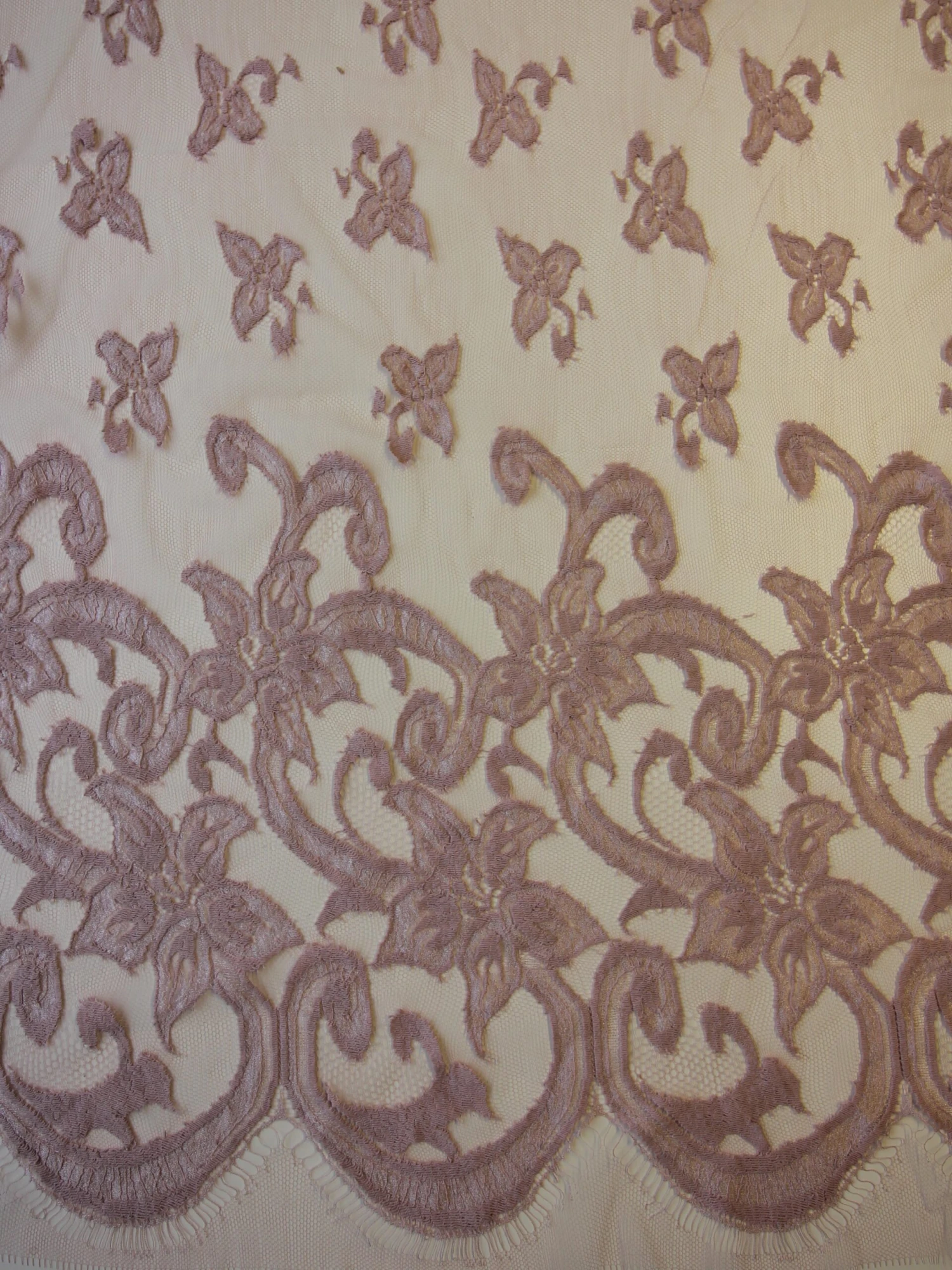 An eye catching, attractive dusky pink Chantilly lace that we also offer in ivory, this lovely lace measures 145 cm (57″) wide. Both borders are the same and an elegant and very contemporary floral motif runs through the body of the pattern. With an abstract feel, the flower is not instantly recognizable but has a particularly large repeat for a Chantilly lace. The pattern is framed by sweeping scalloped edges that give the lace a very dramatic finish, framed by the traditional eyelashes of a true Chantilly lace made in France.
