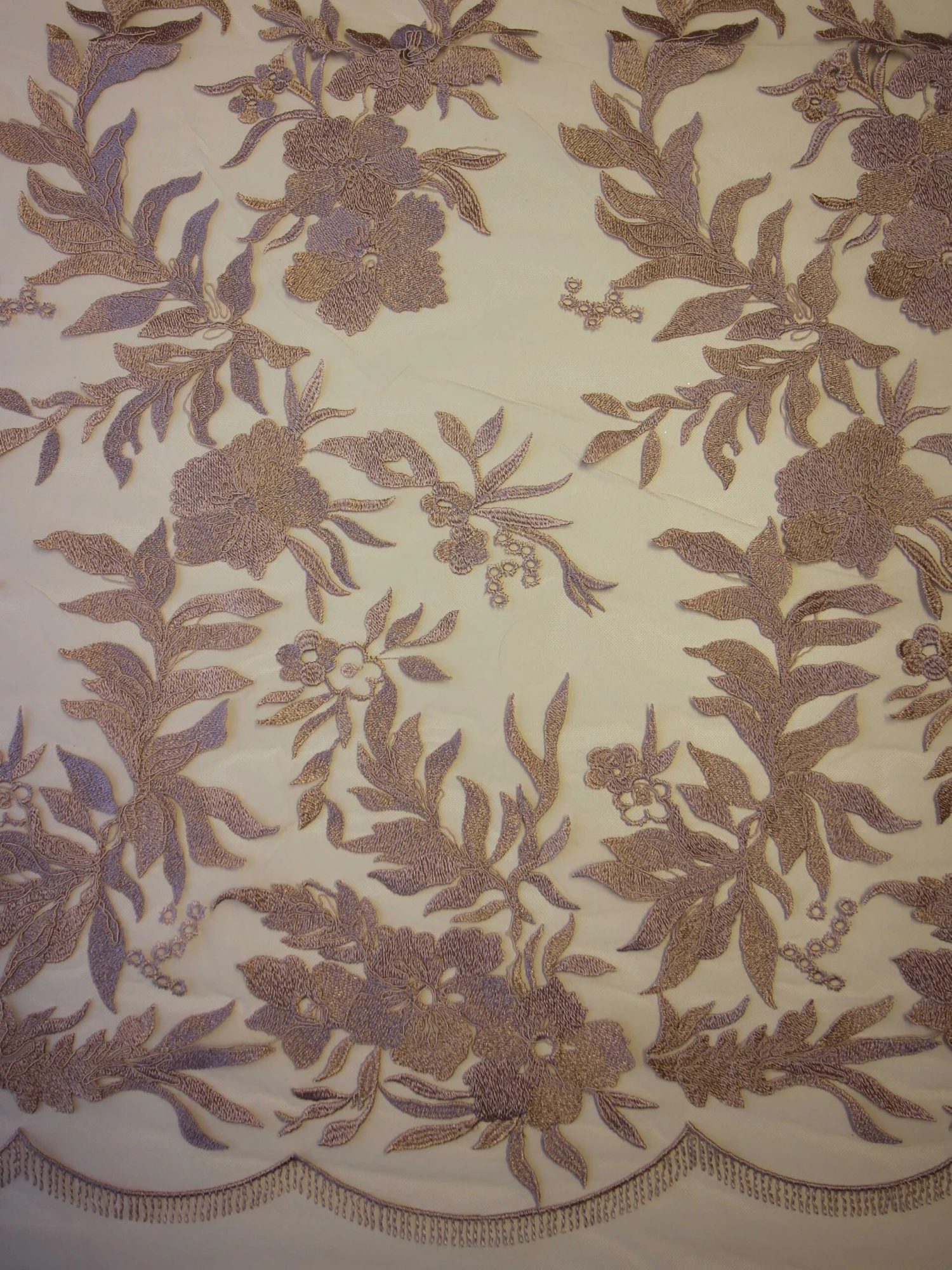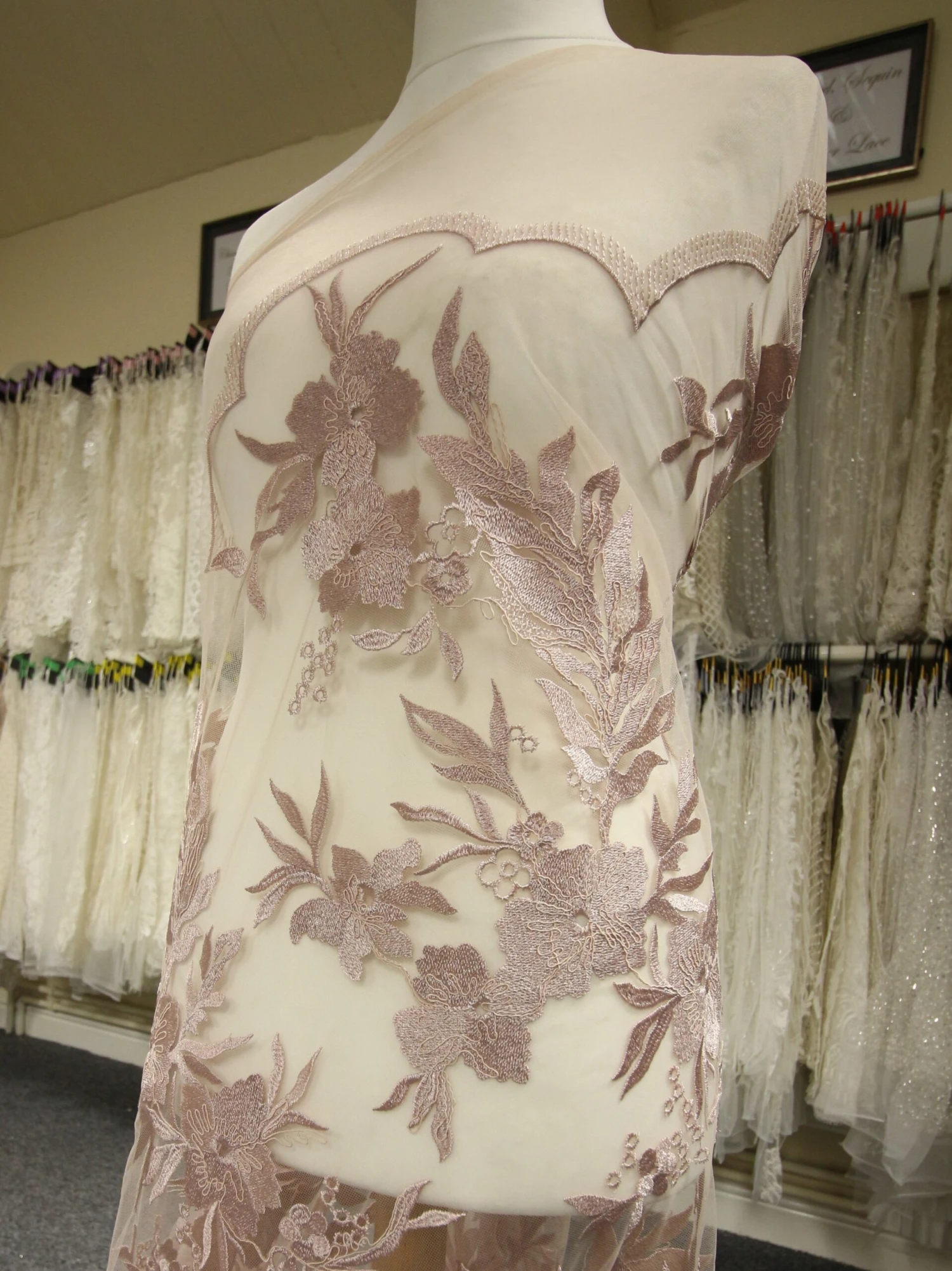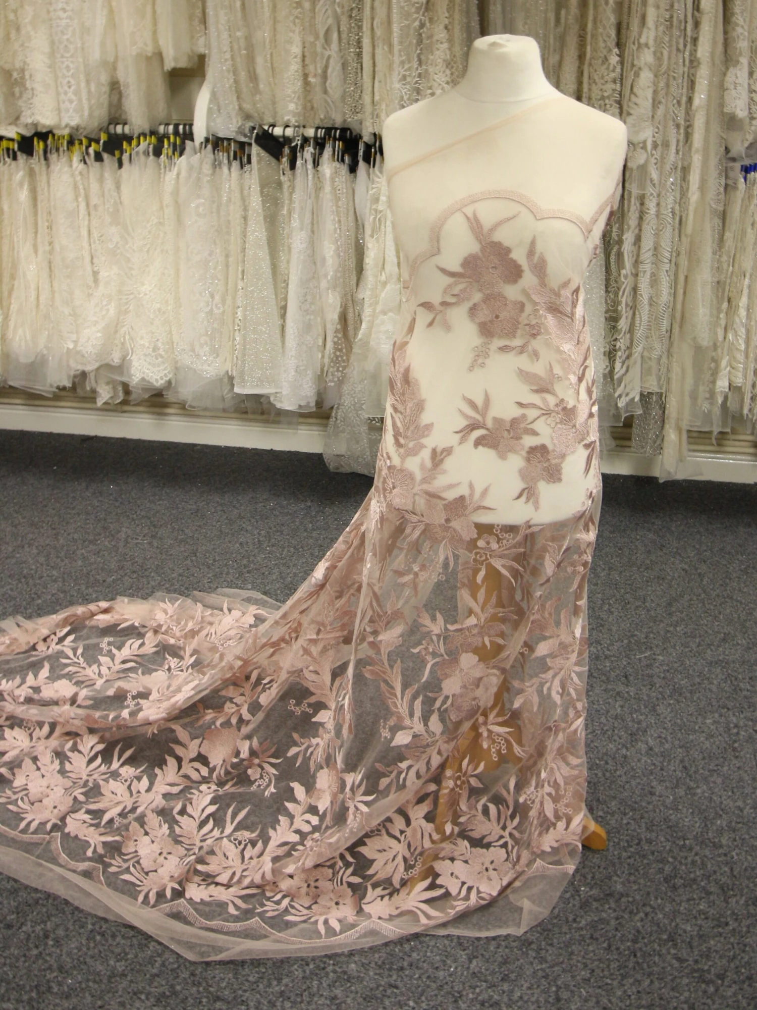 A rich and on trend, opulent dusky pink lace that measures 132 cm (52″) wide. The base is a tulle that has been embroidered to form large striking flowers and leaves, which have been decorated with cording.