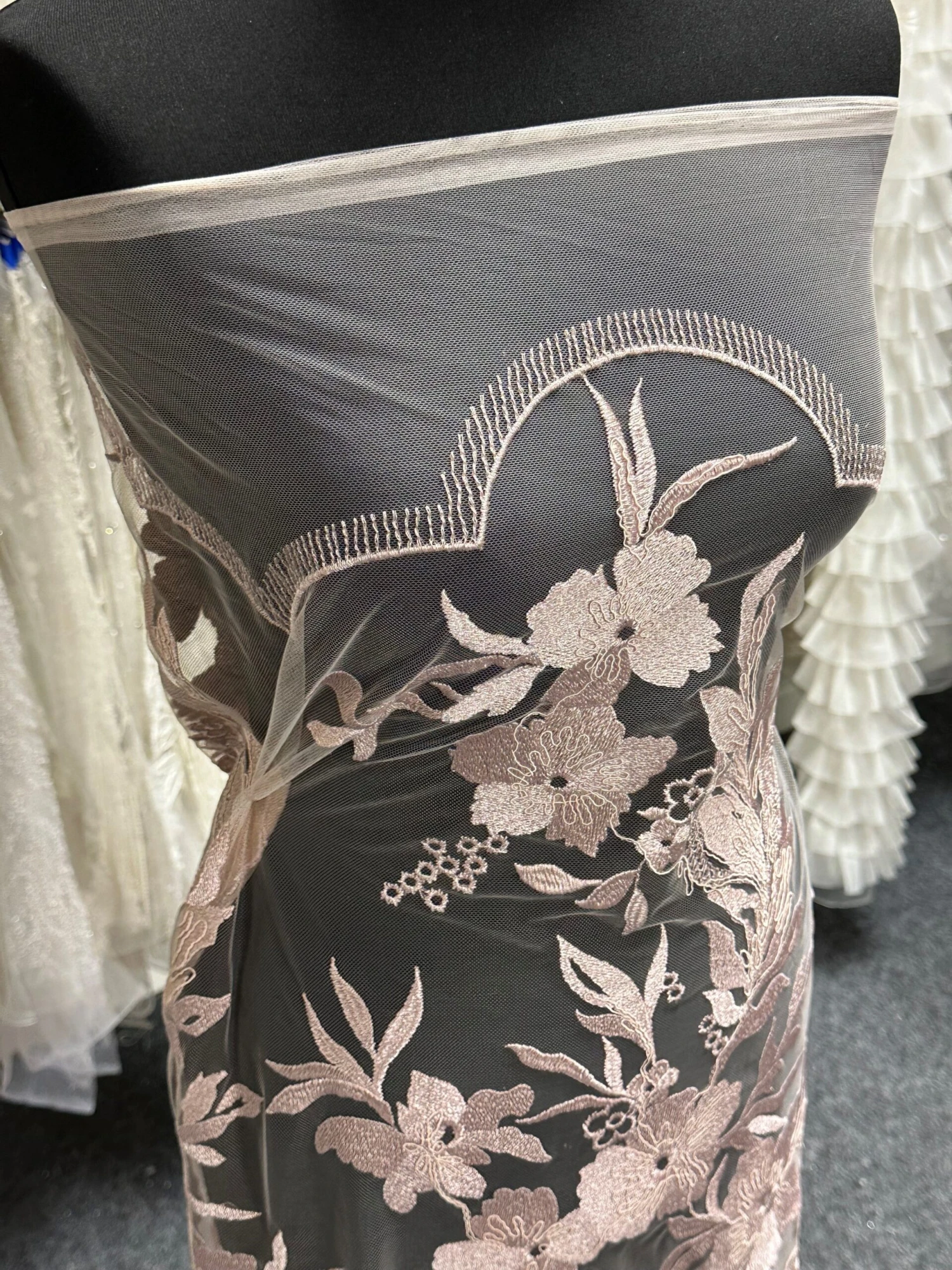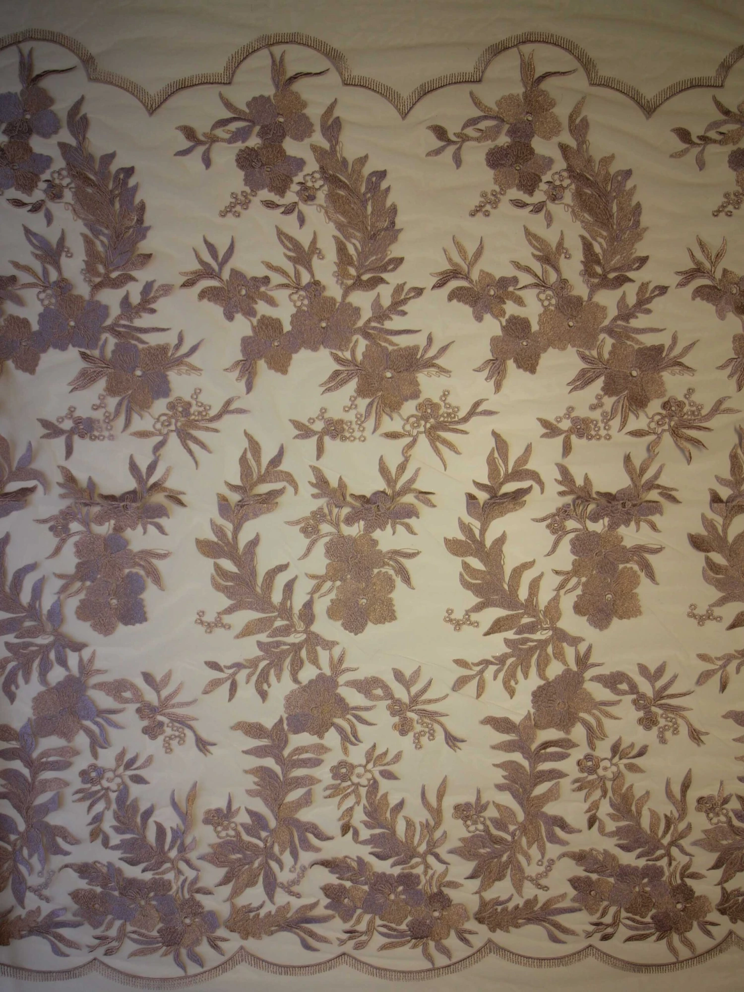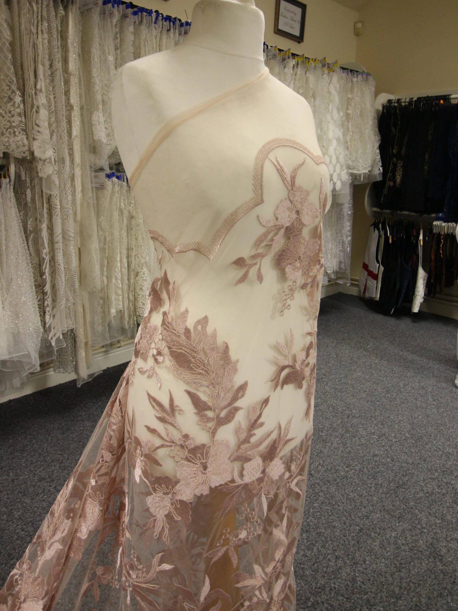 A rich and on trend, opulent dusky pink lace that measures 132 cm (52″) wide. The base is a tulle that has been embroidered to form large striking flowers and leaves, which have been decorated with cording.