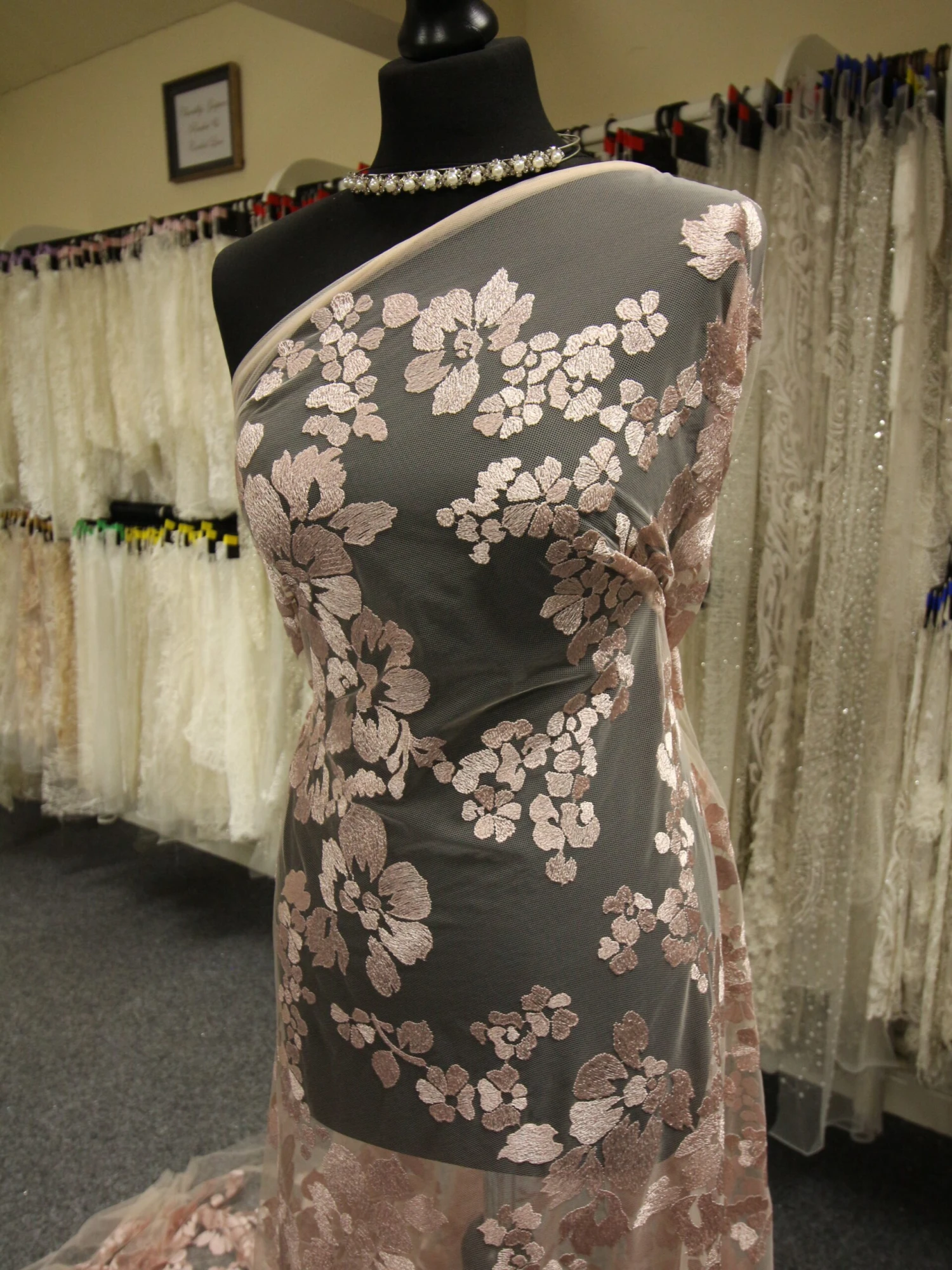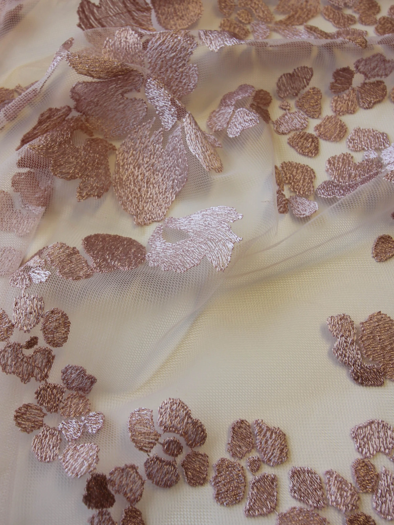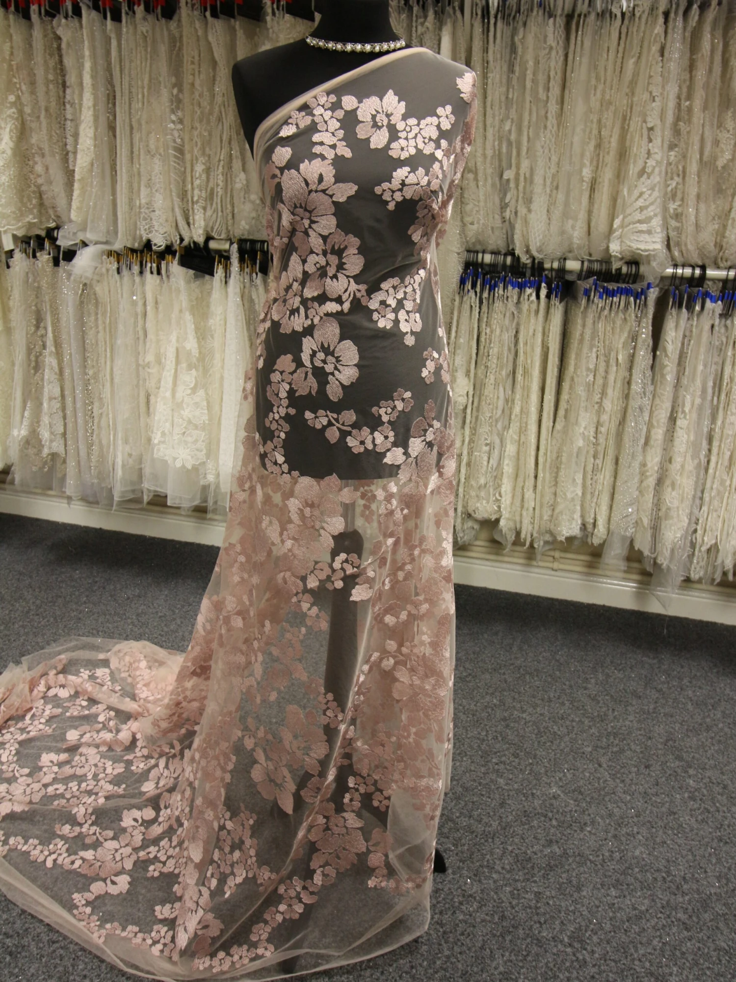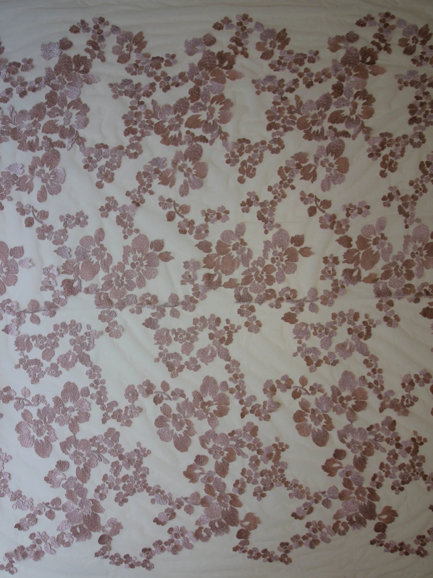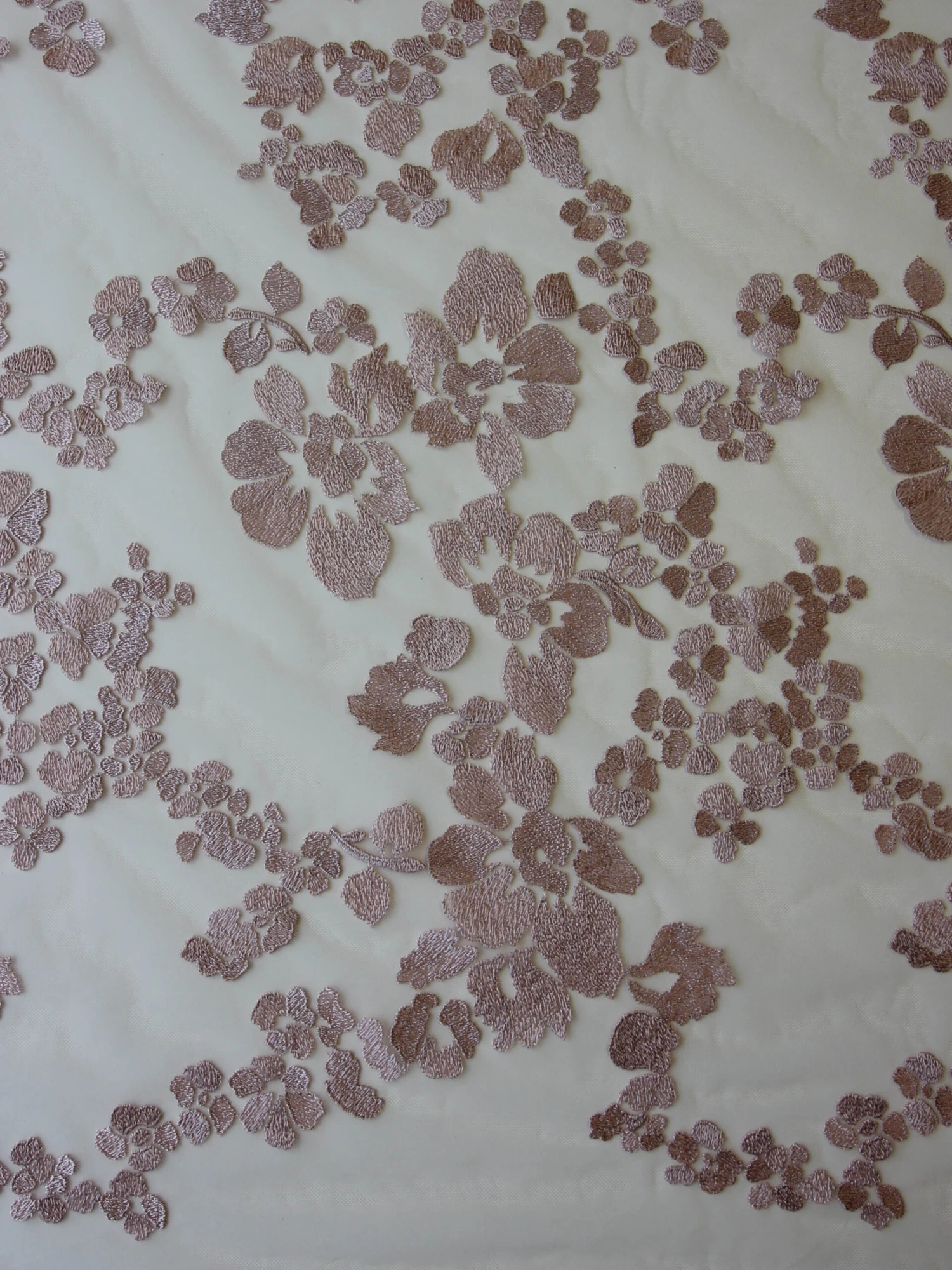 A tasteful and elegant pink lace with a contemporary floral design, which has embroidery threads running in different directions to make a 2 tone effect as it catches the light.