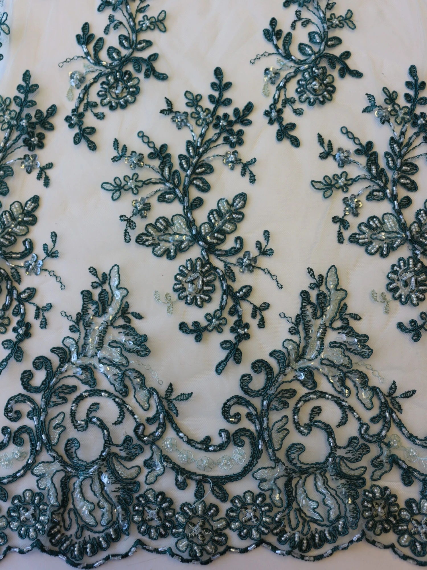 A tasteful Emerald Green Lace, which has been beaded and corded on a fine tulle ground and which measures 132 cm (52″) wide .
