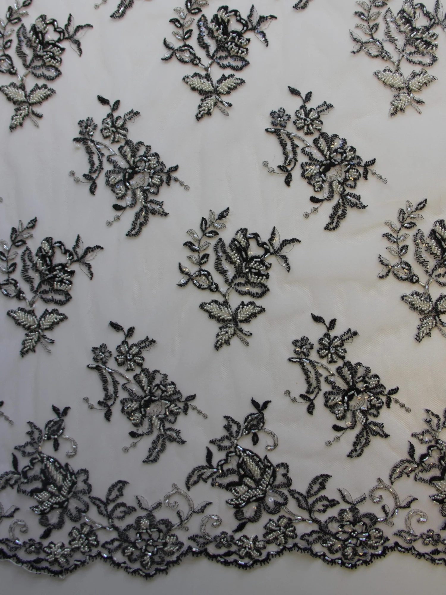 Chloe is a youthful and vibrant lace with lovely beaded detail on a embroidered tulle base. We offer it in a range of colors and here you can see it in Denim Blue. This design has matching borders and incorporates 2 single flower motifs which are quite distinct. Both motifs are overlaid with sequins and beads and are outlined with a fine filigree metal thread, making a stunning combination.