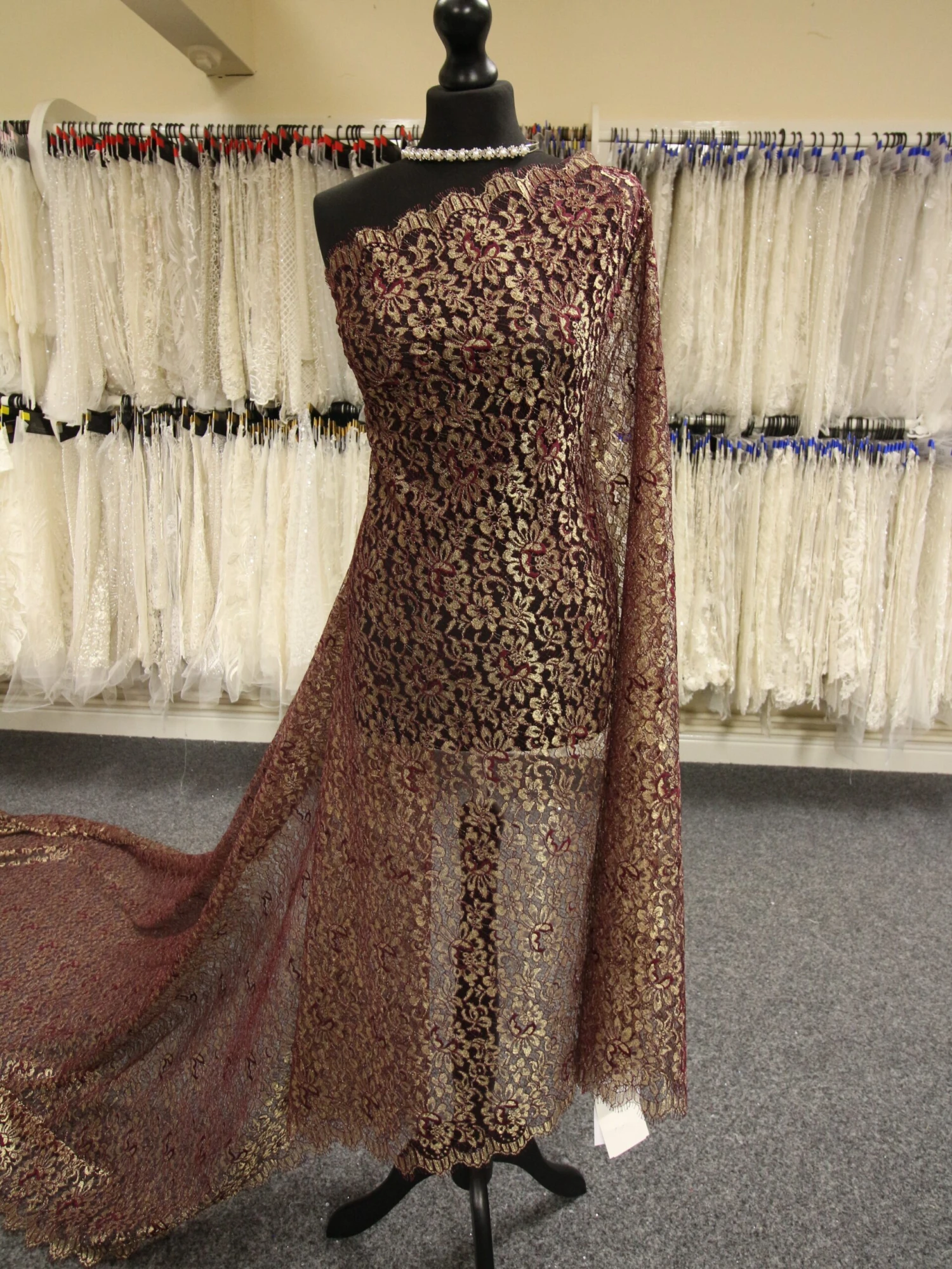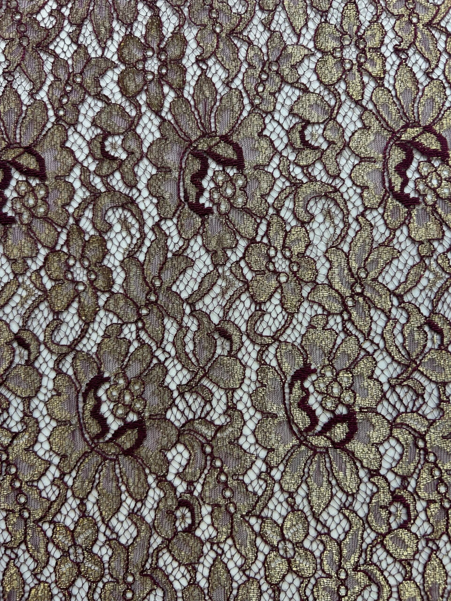 An extremely attractive Magenta and Gold Leavers lace with matching fringed and scalloped borders.