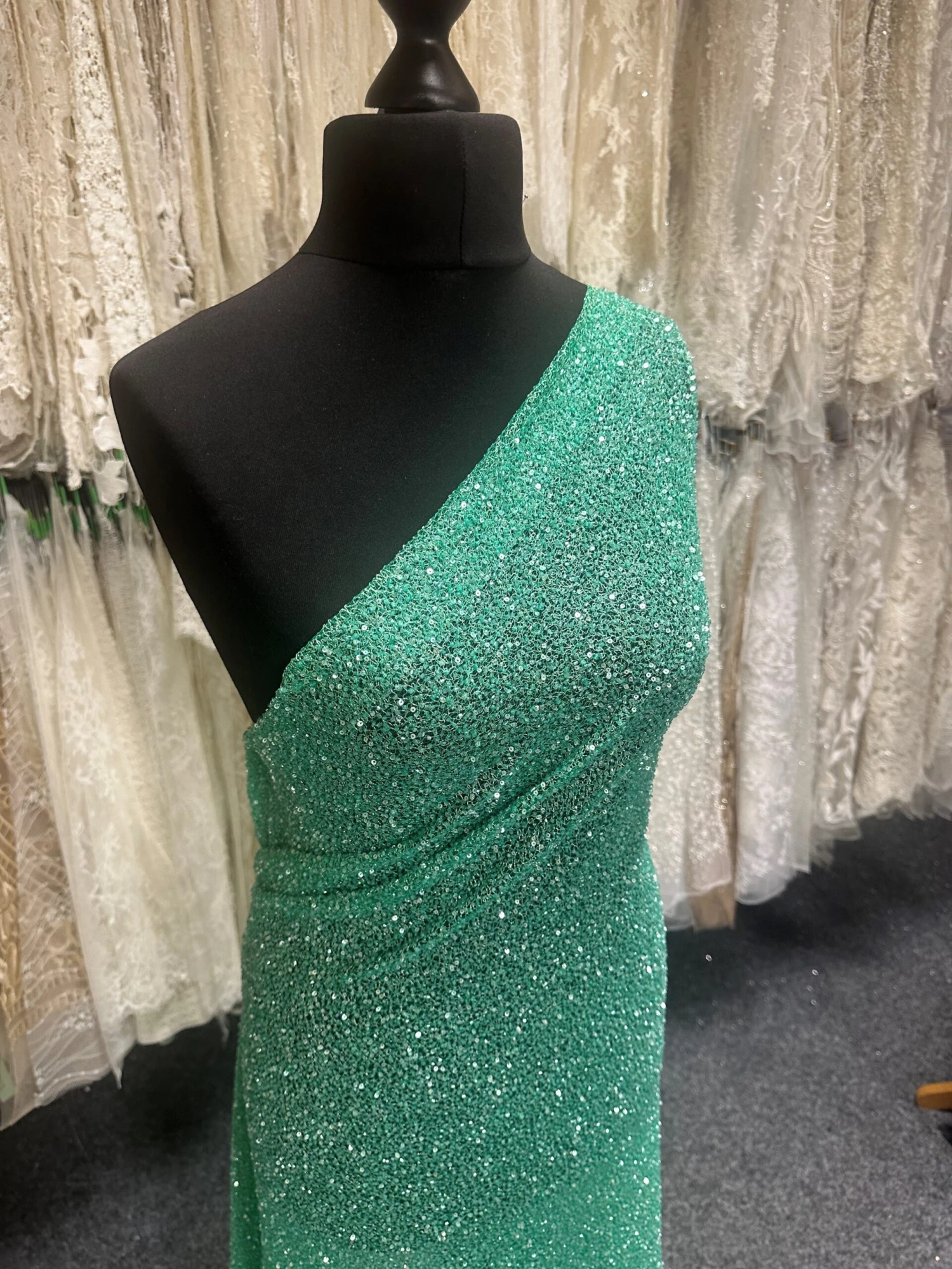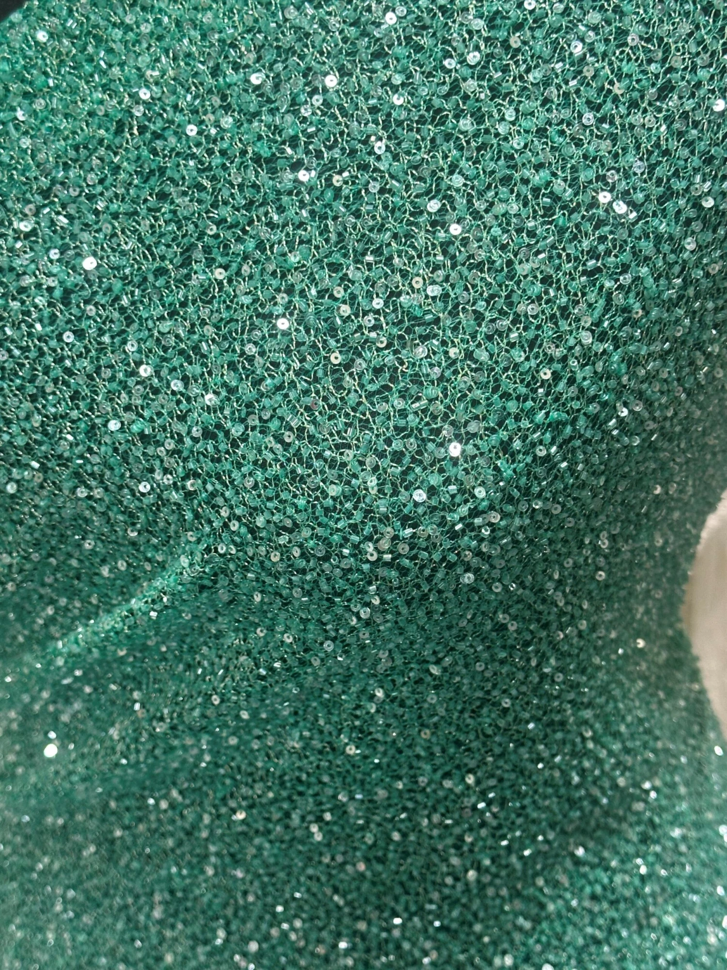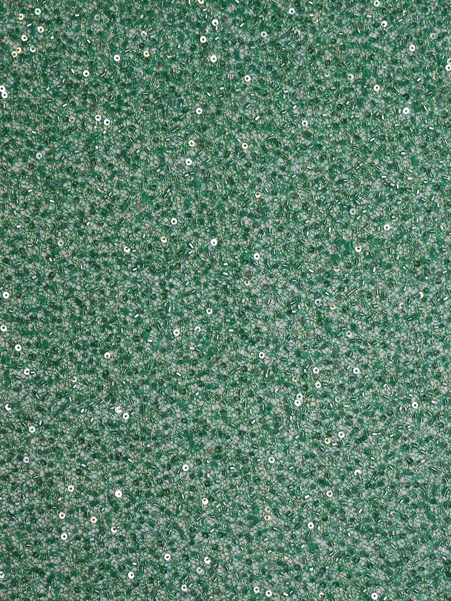 A green hand embroidered lace that has been formed by sequins and beads on a delicate mesh type base fabric. This has a silver thread running throughout and is extremely eye catching.