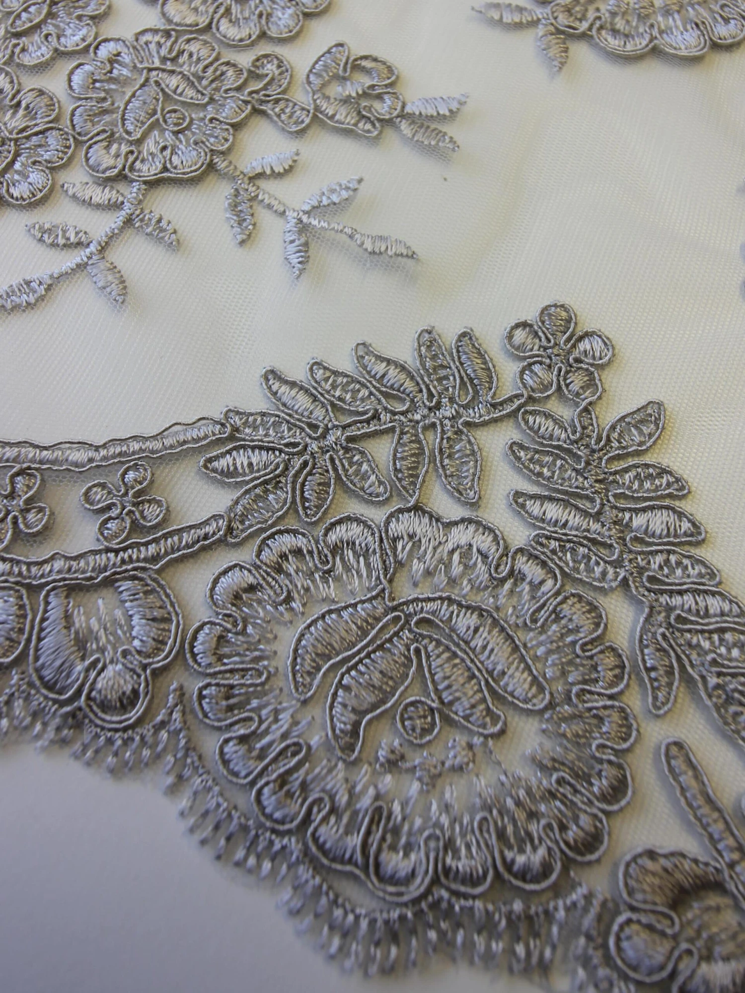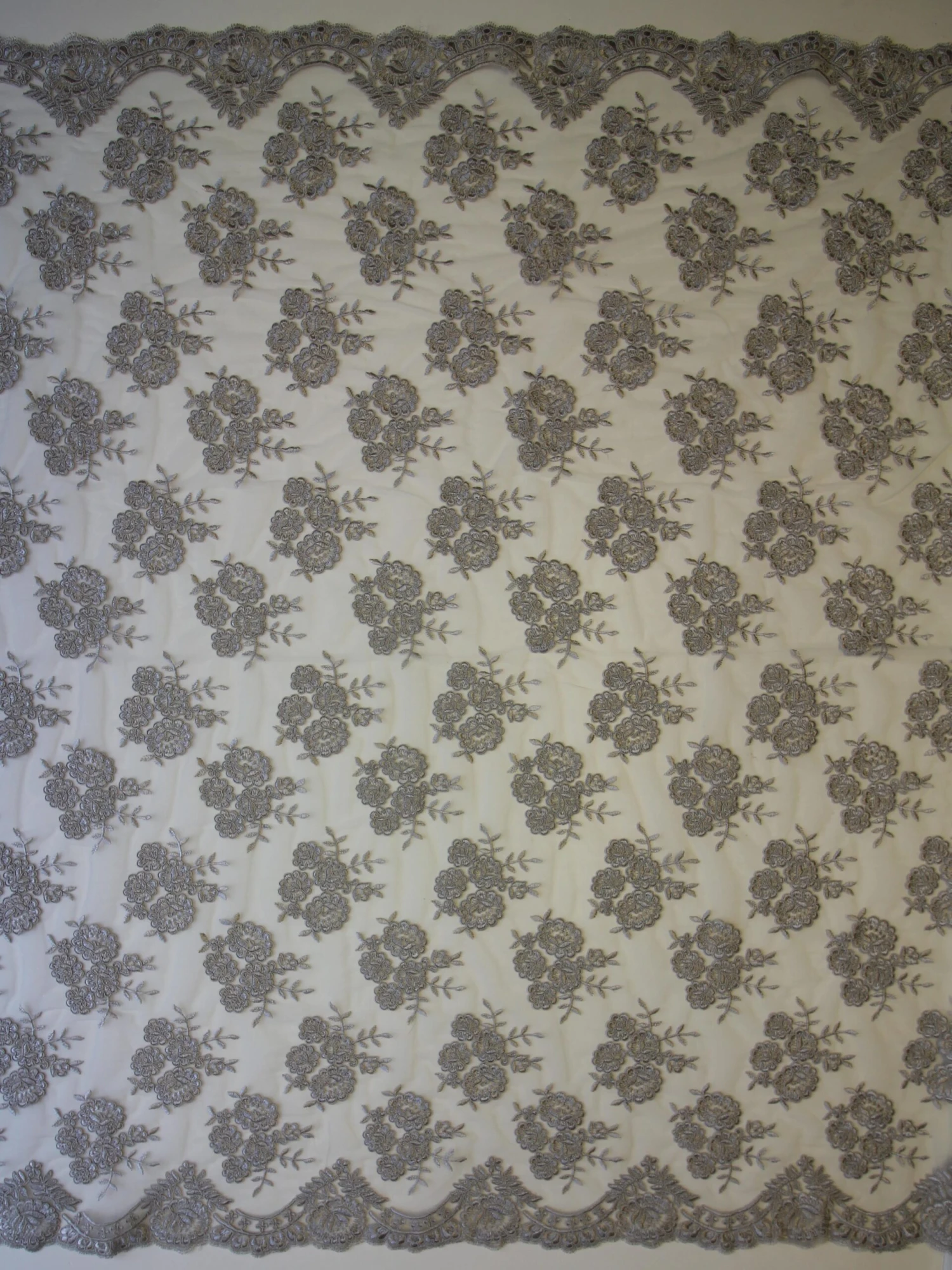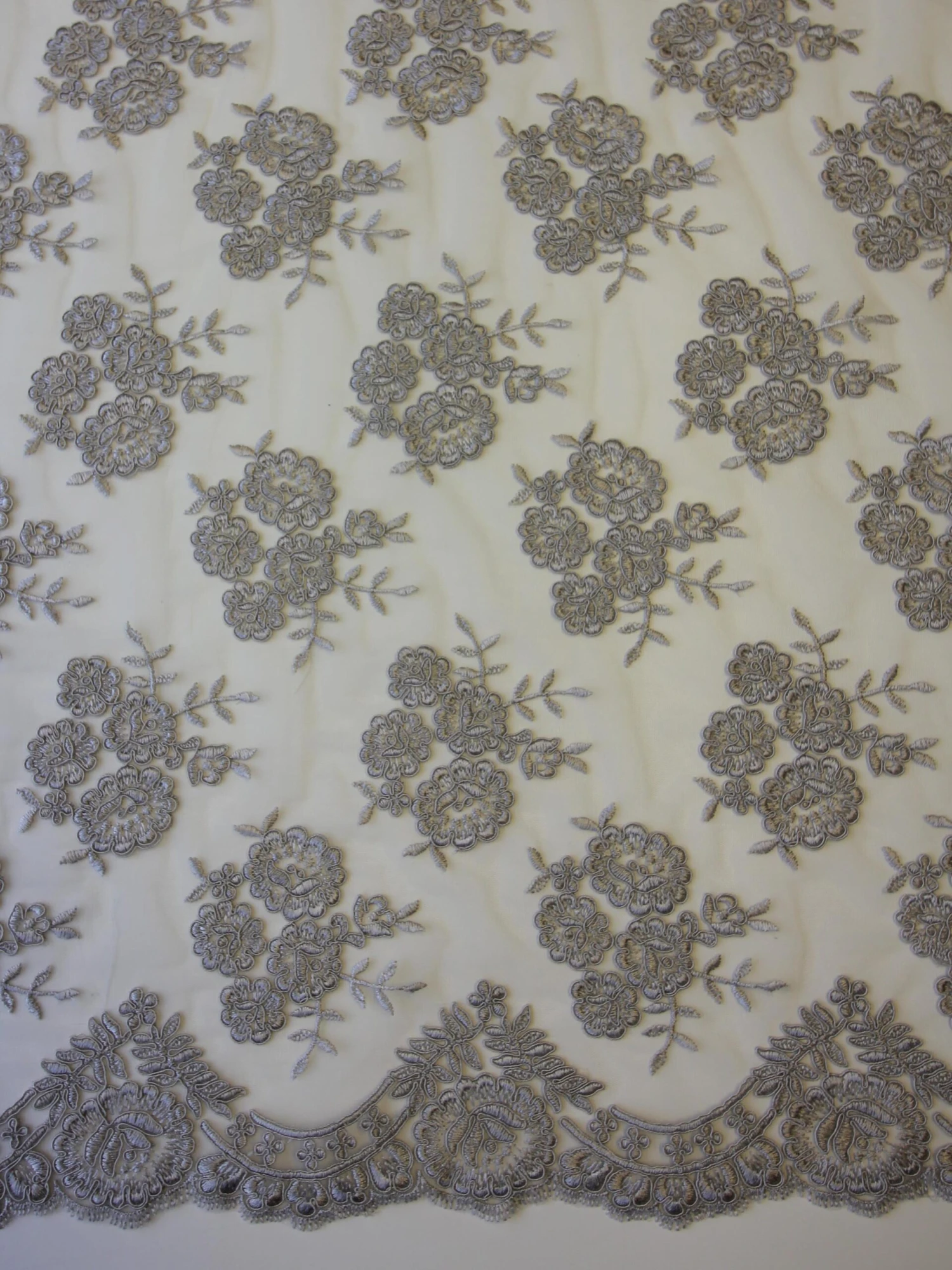 A glamorous grey corded lace with floral bouquets running though its body, this has matching scalloped edges and measures 132 cm (52″) wide.