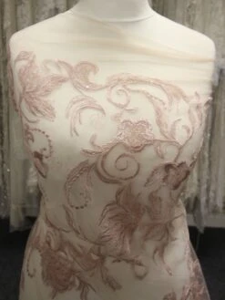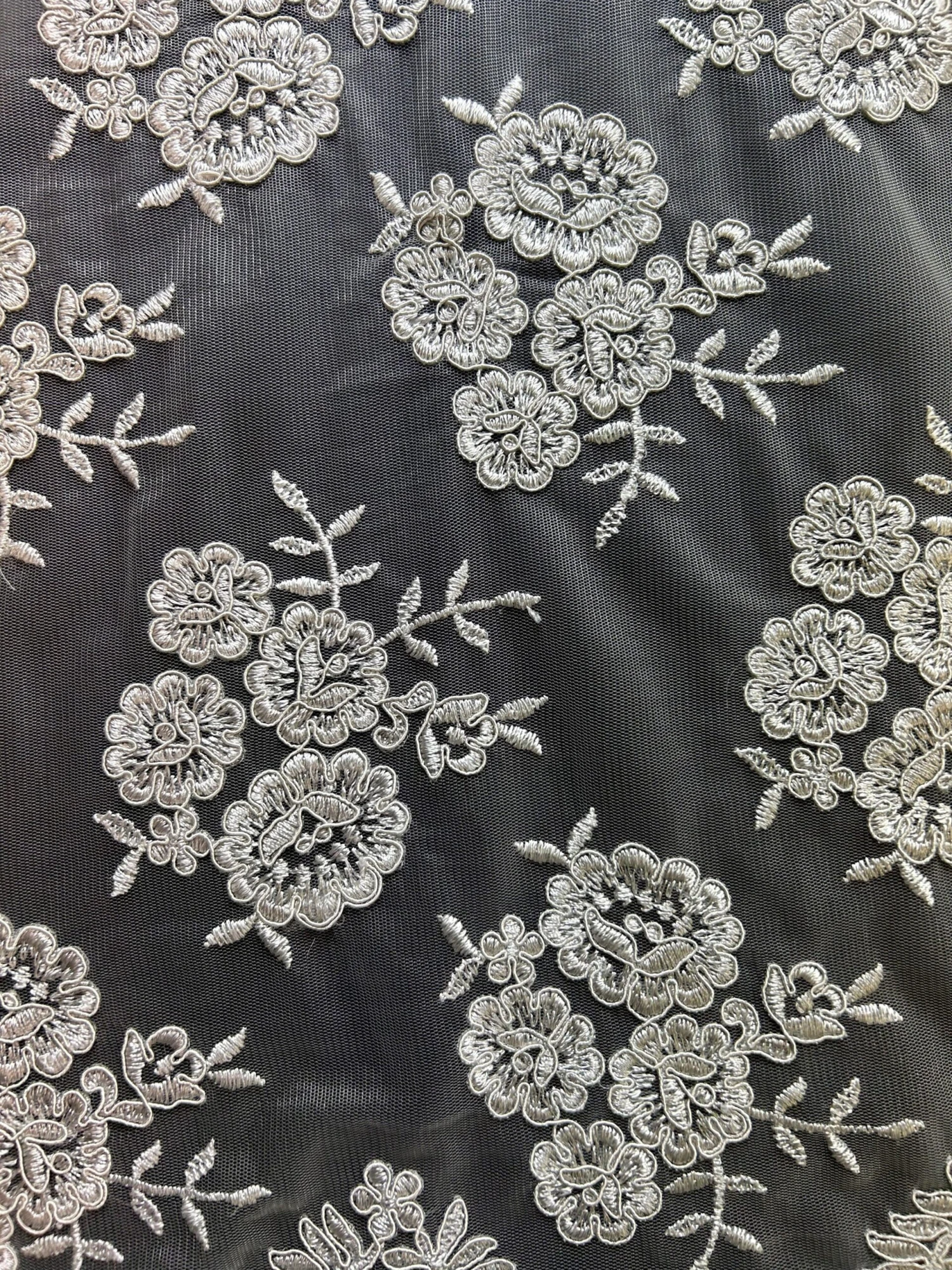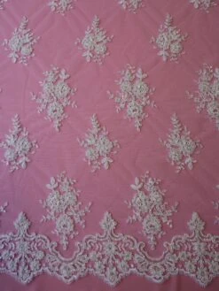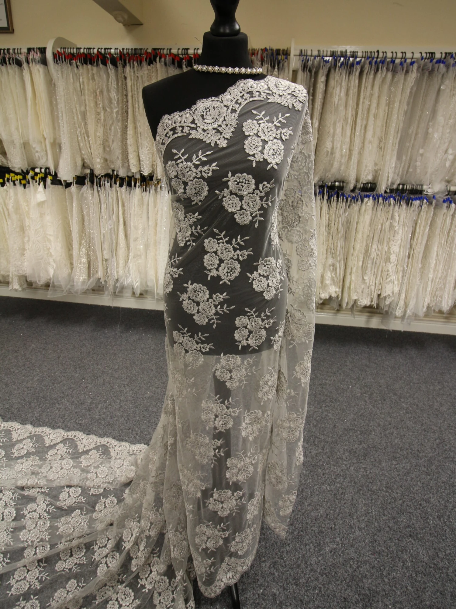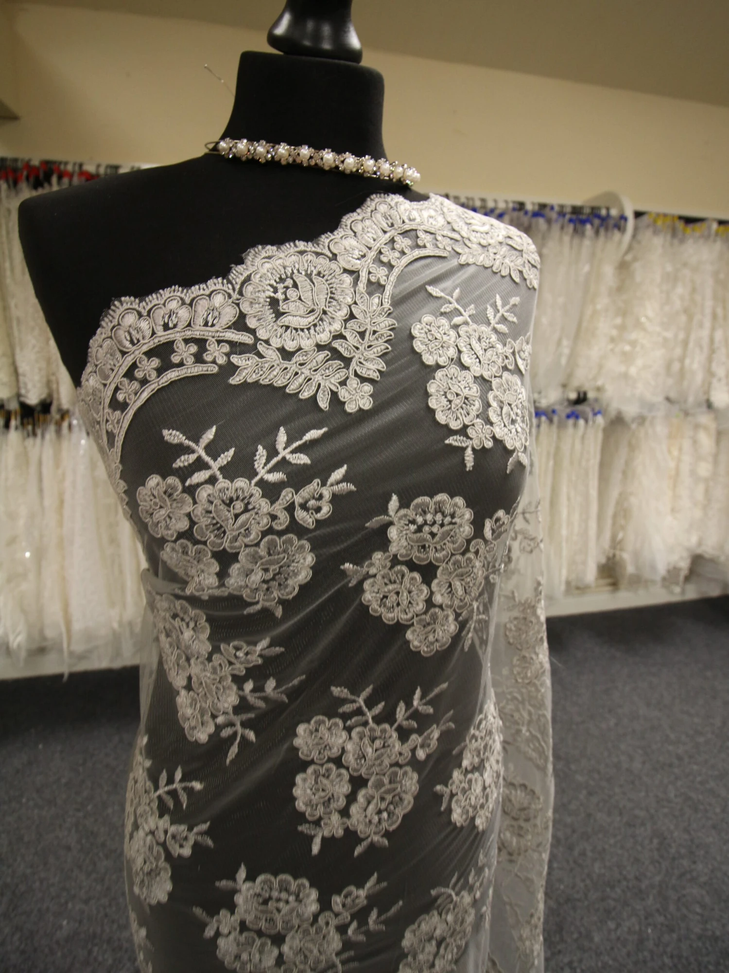 A glamorous grey corded lace with floral bouquets running though its body, this has matching scalloped edges and measures 132 cm (52″) wide.