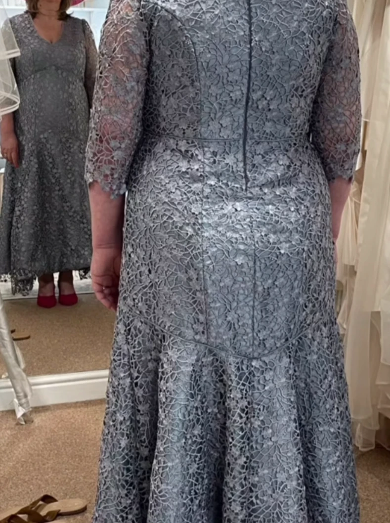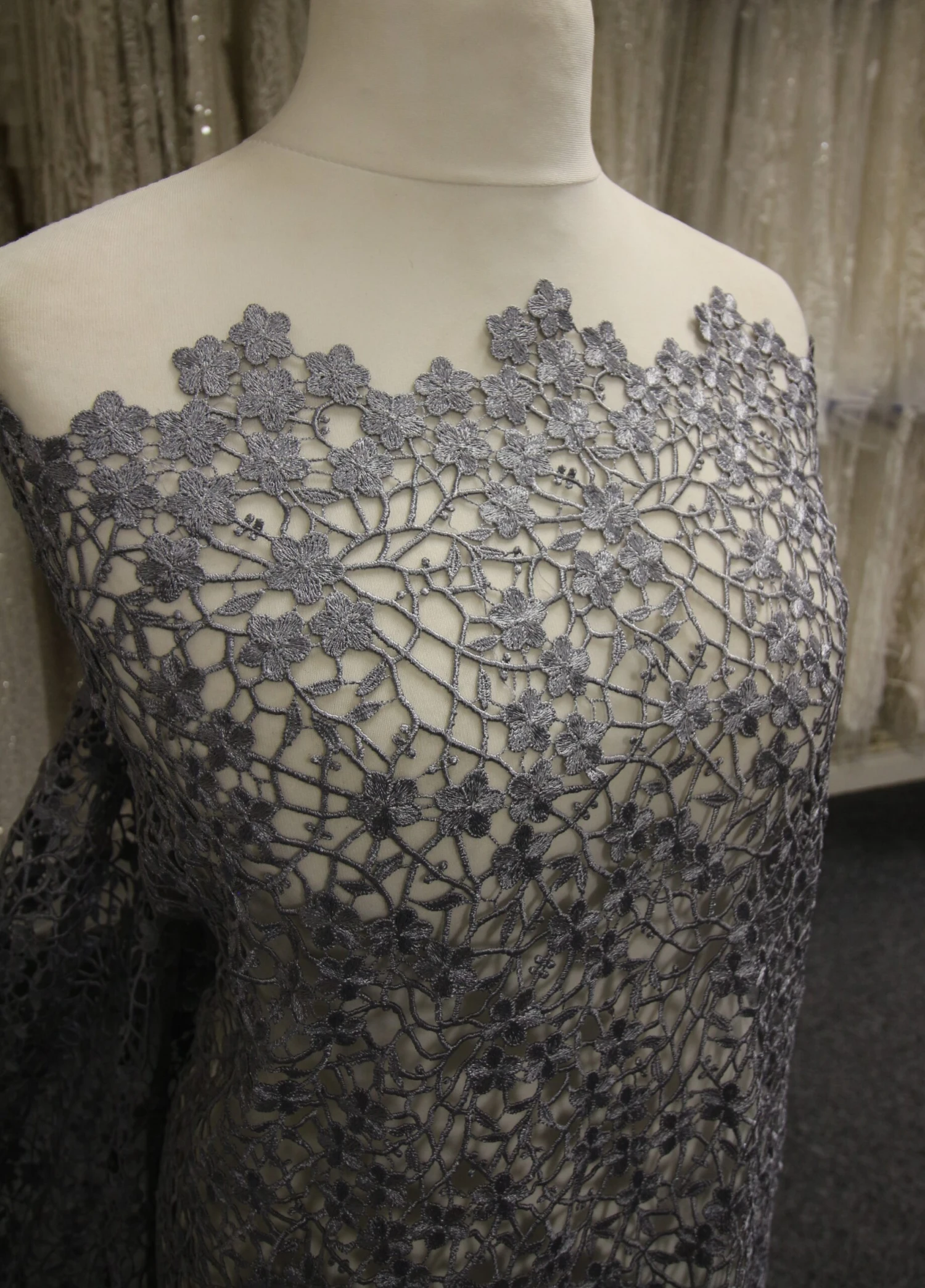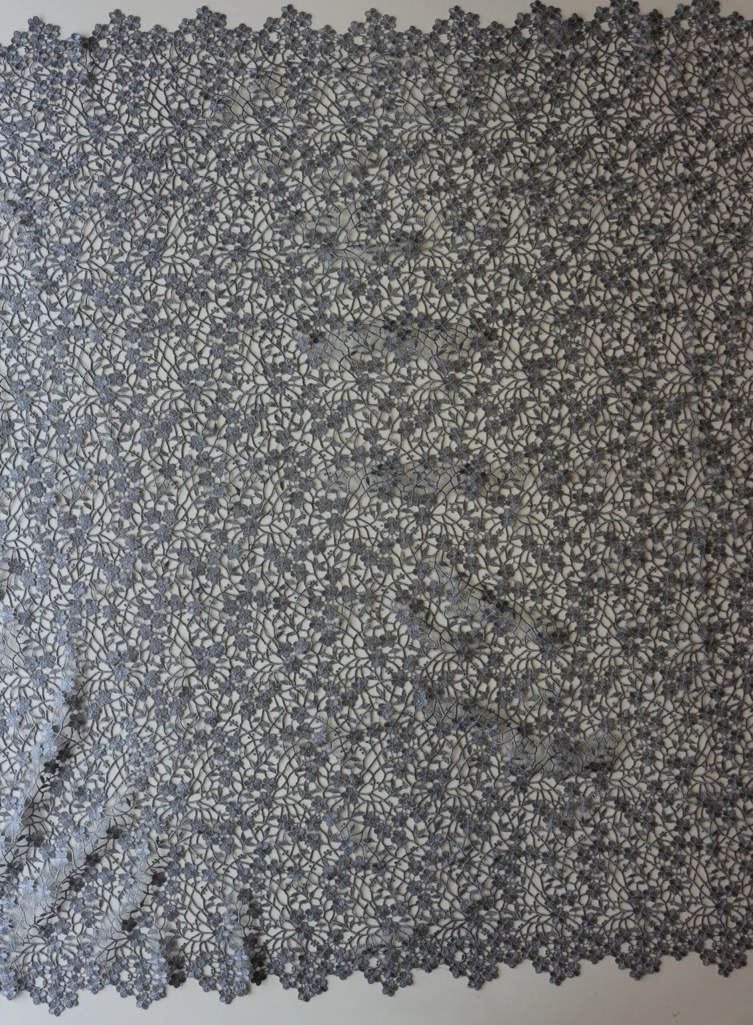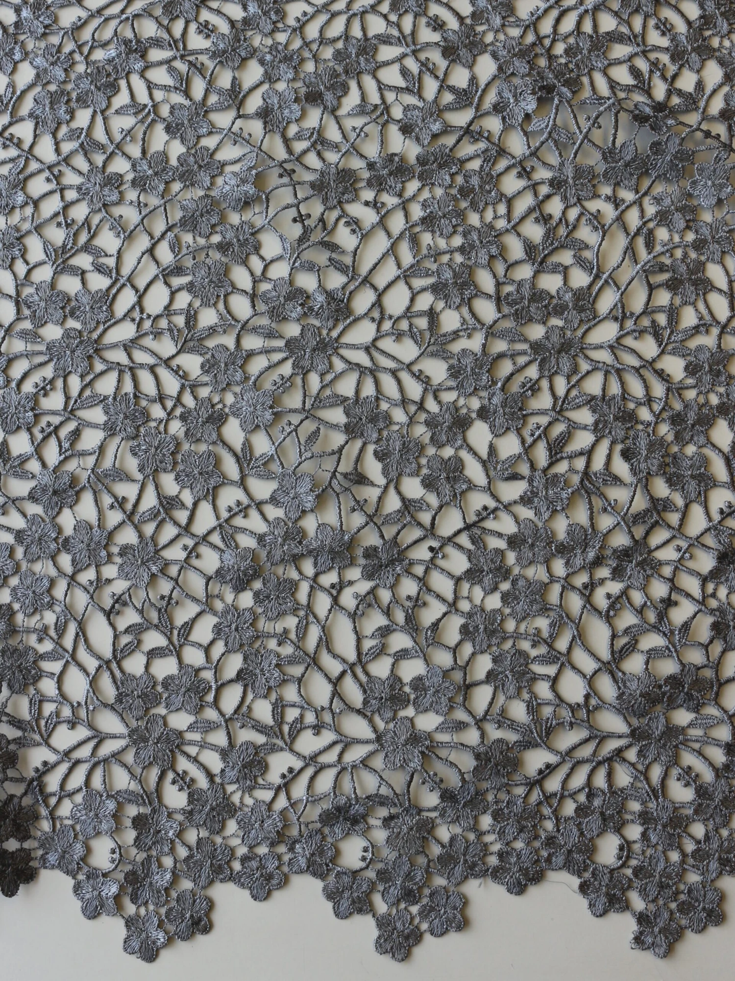 A delightful grey coloured guipure lace that measures 130 cm (51″) wide. The pattern is a relatively dense floral display with matching edges.