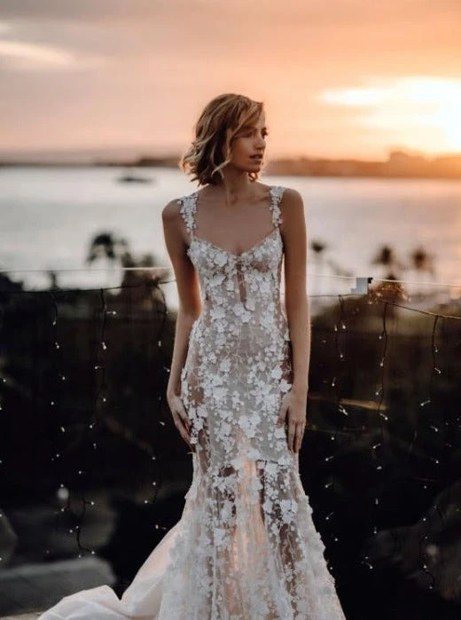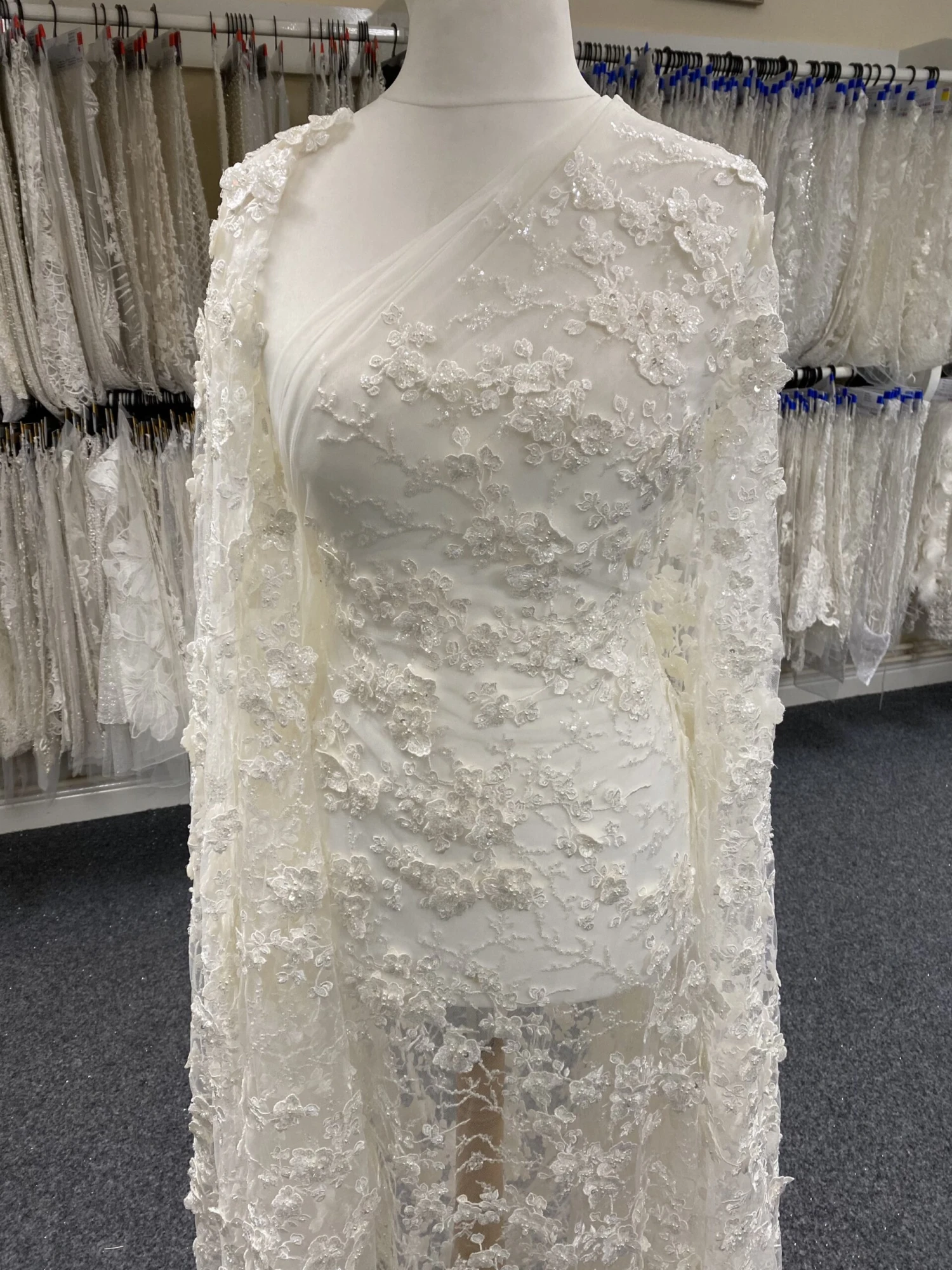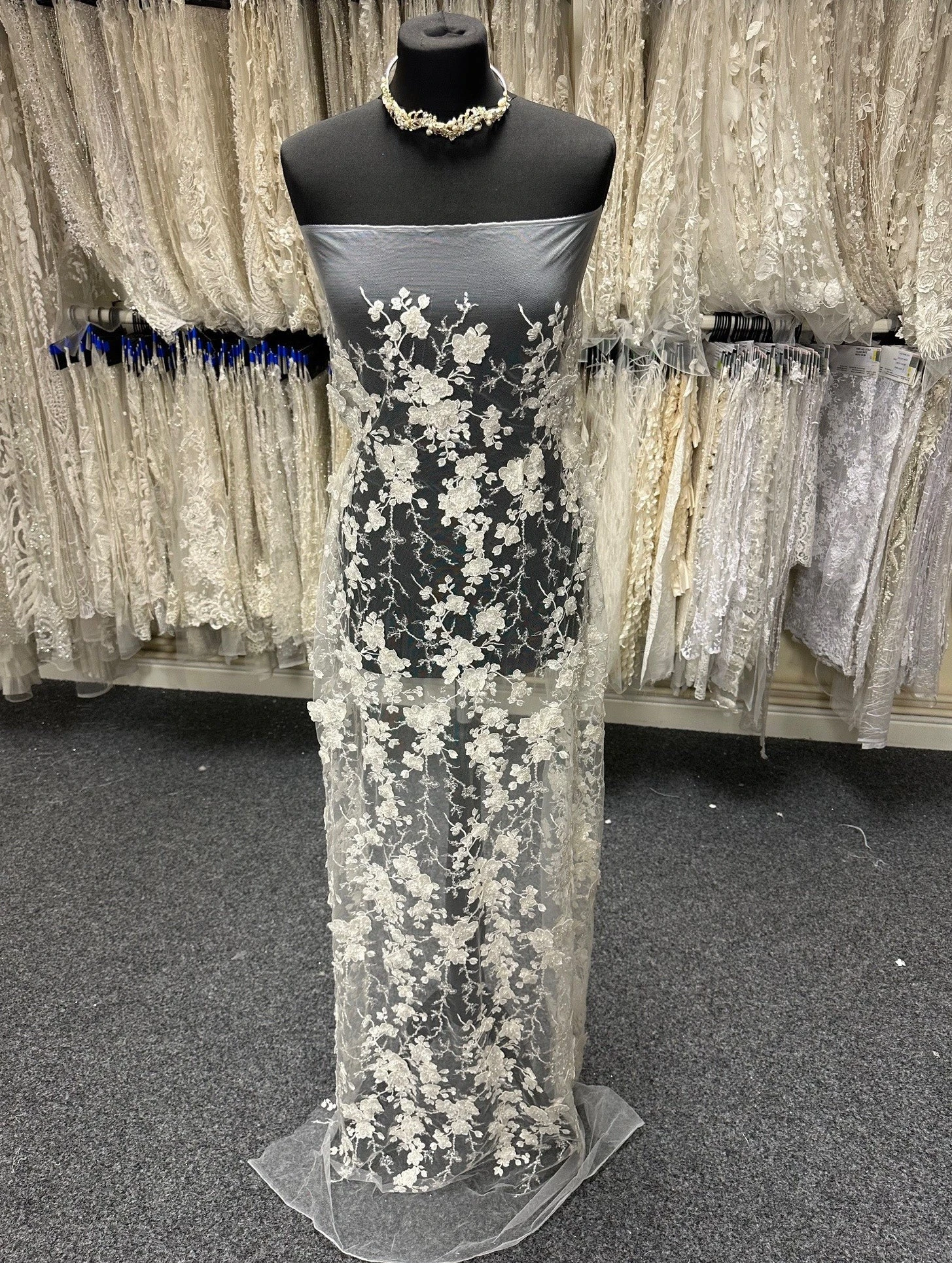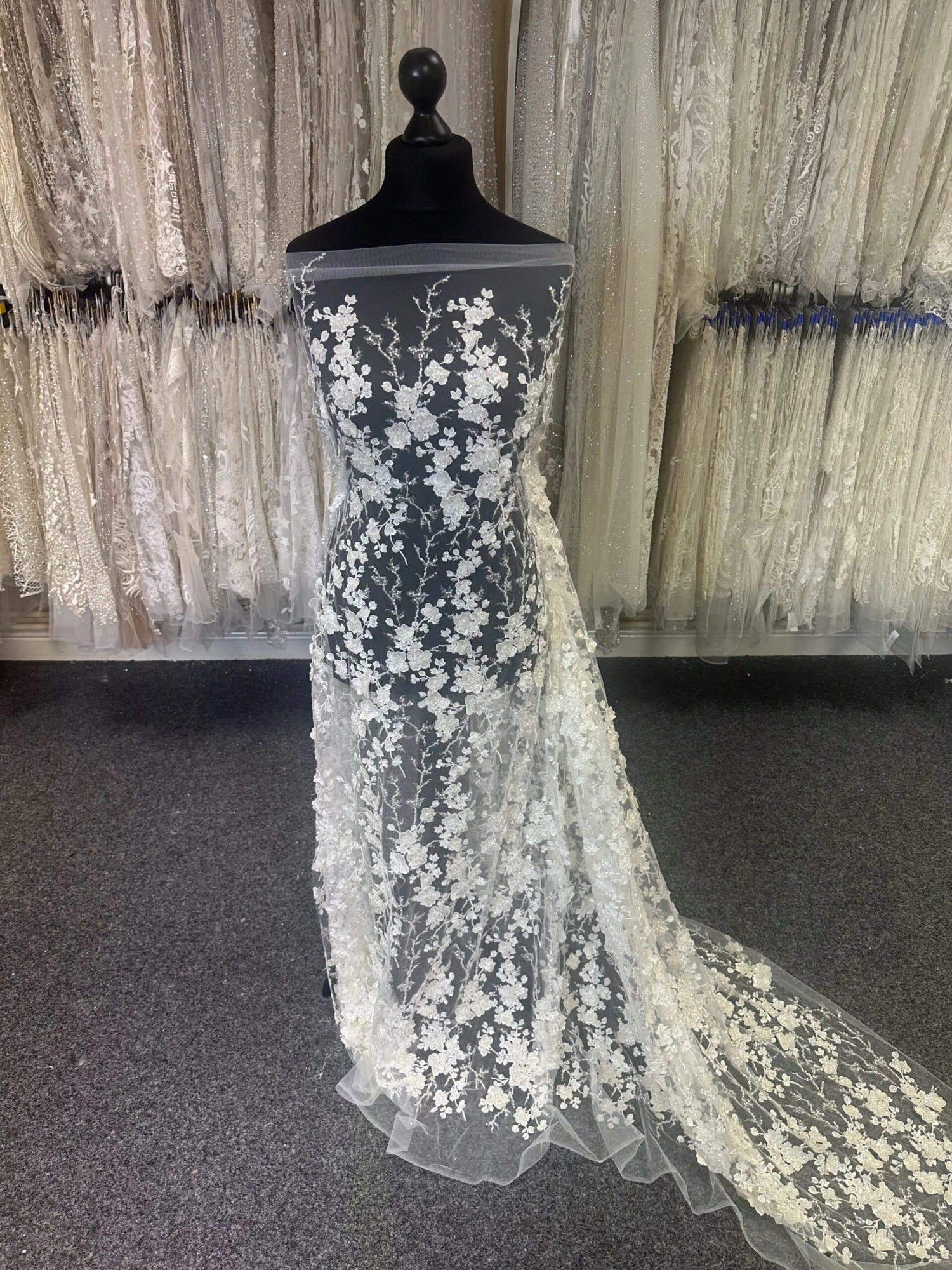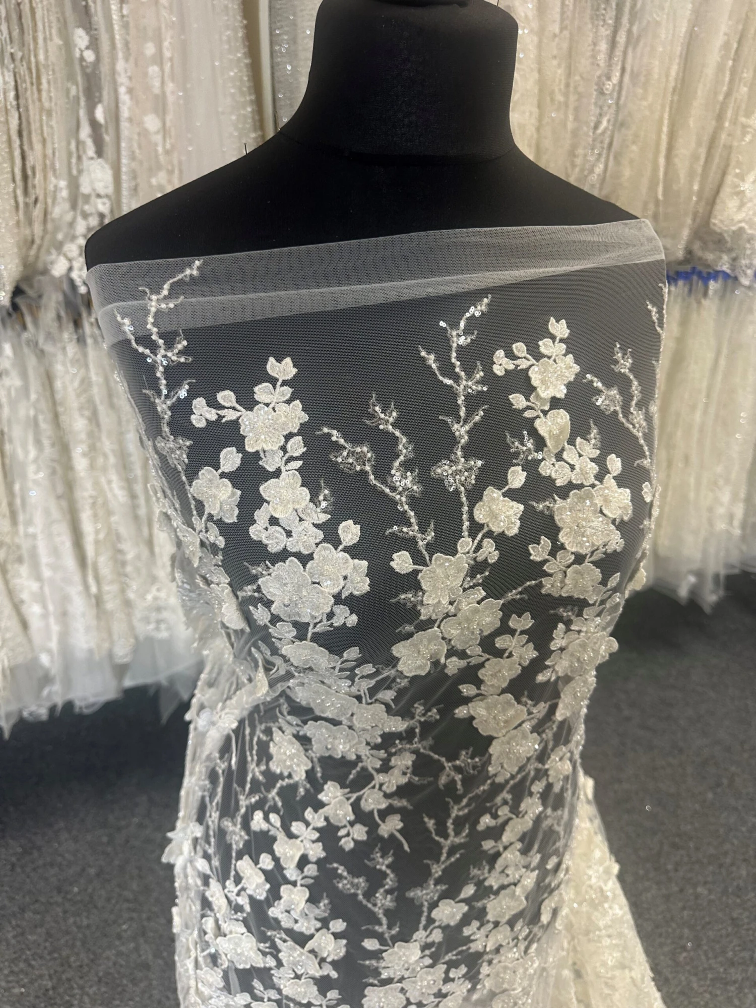 A highly glamorous ivory bridal lace with 3D flowers and exquisite beading, this measures 132 cm (52″) wide. Intricate three dimensional flowers cover the whole width of the tulle base and give this product a decadent charm. The flowers and the stems are embellished with tiny sequins making this a shimmering design.