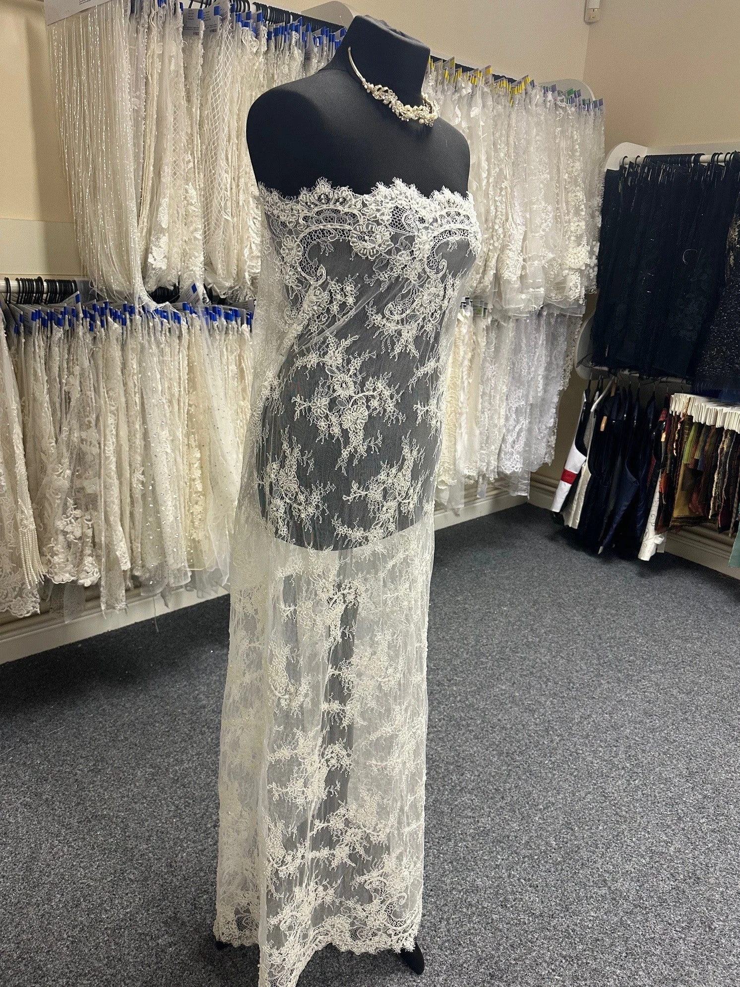 Carmel is an ivory bridal lace that measures approx 140 cm (55″) wide.