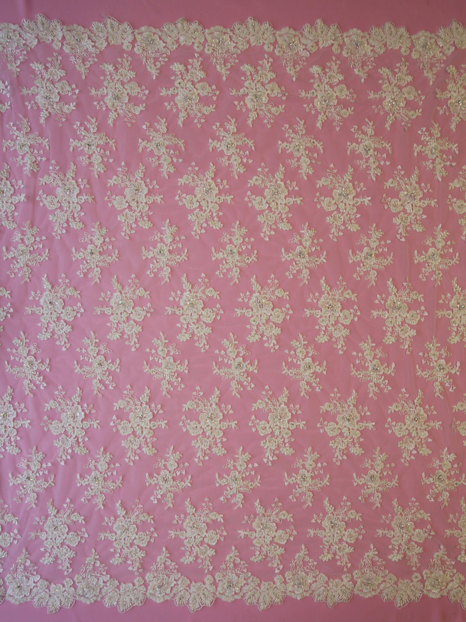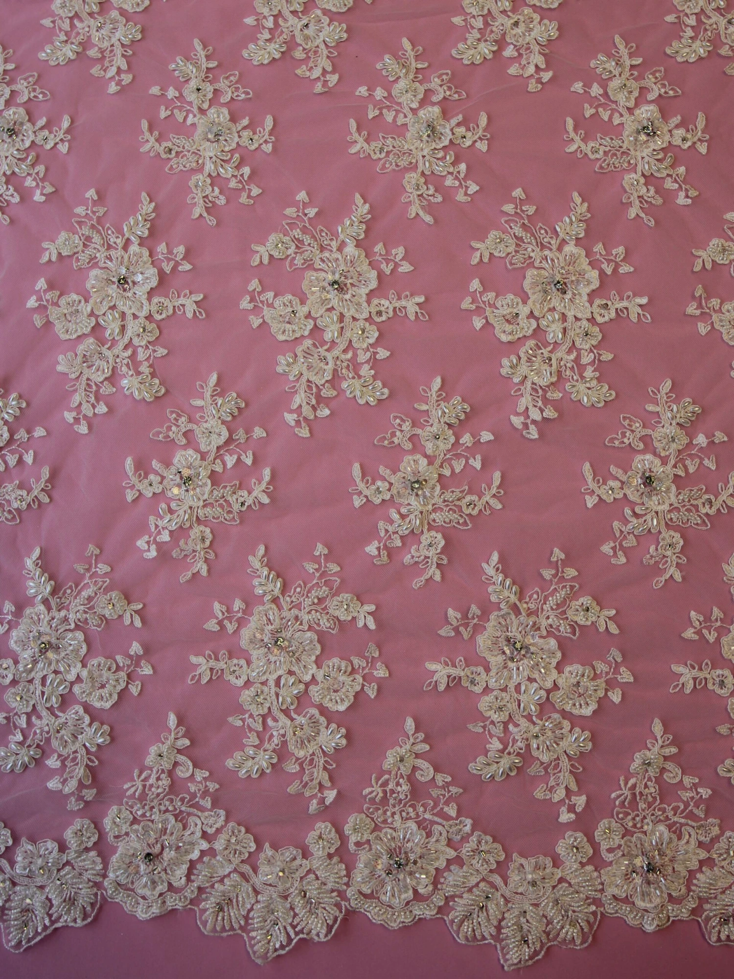 Chelsea is a splendid ivory lace that measures 132cm (52″) wide, that is heavily embellished with diamantes, beads and cording on top of embroidery thread. The floral motifs are pretty flowers with leaf and petal detail which have been corded to highlight the design. The diamantes in the centre of the flowers are quite large and there is additional beading on the leaves and petals. The deep border of this design is particularly breathtaking. We also offer co-ordinating motifs and trim to match.