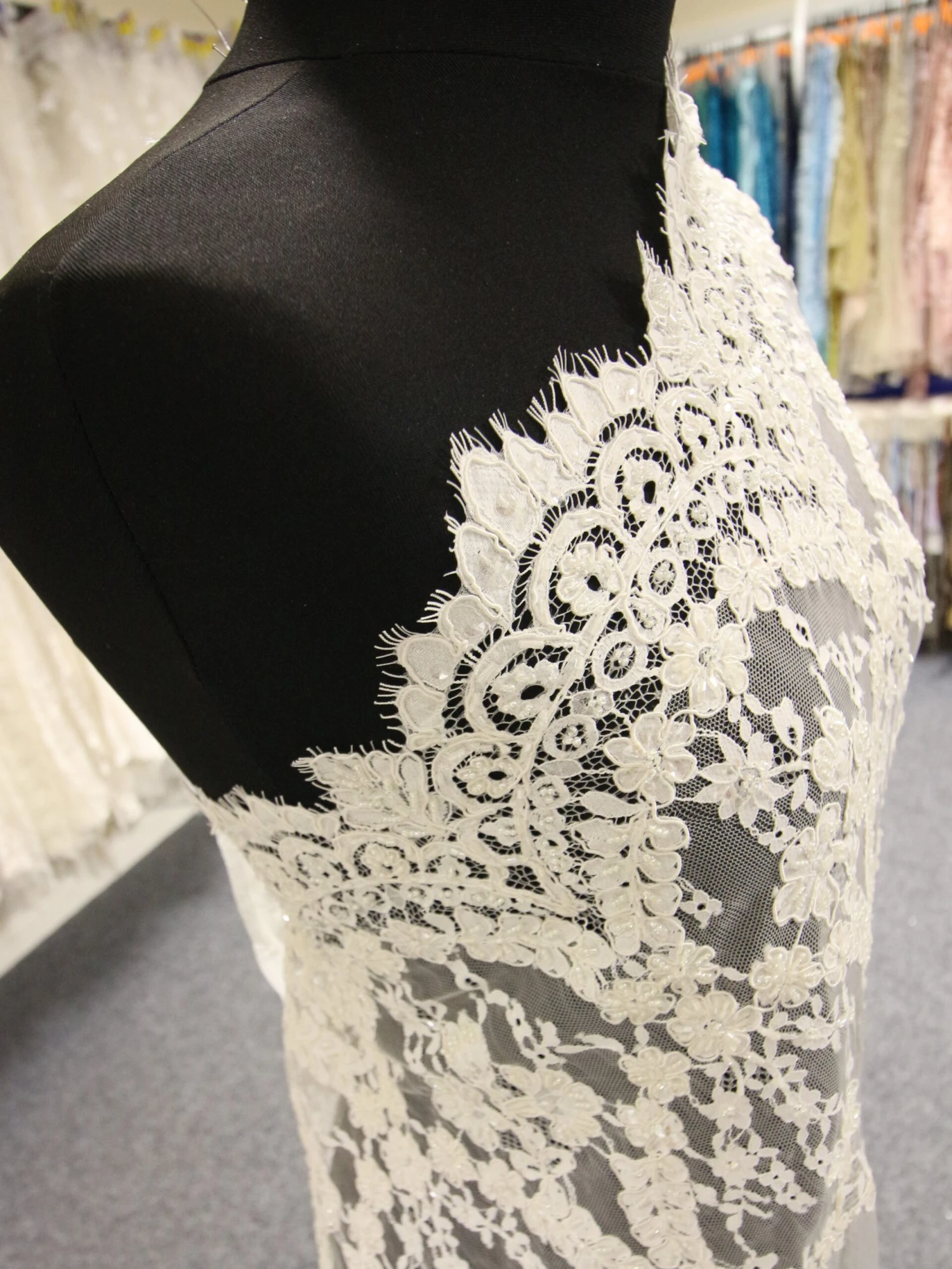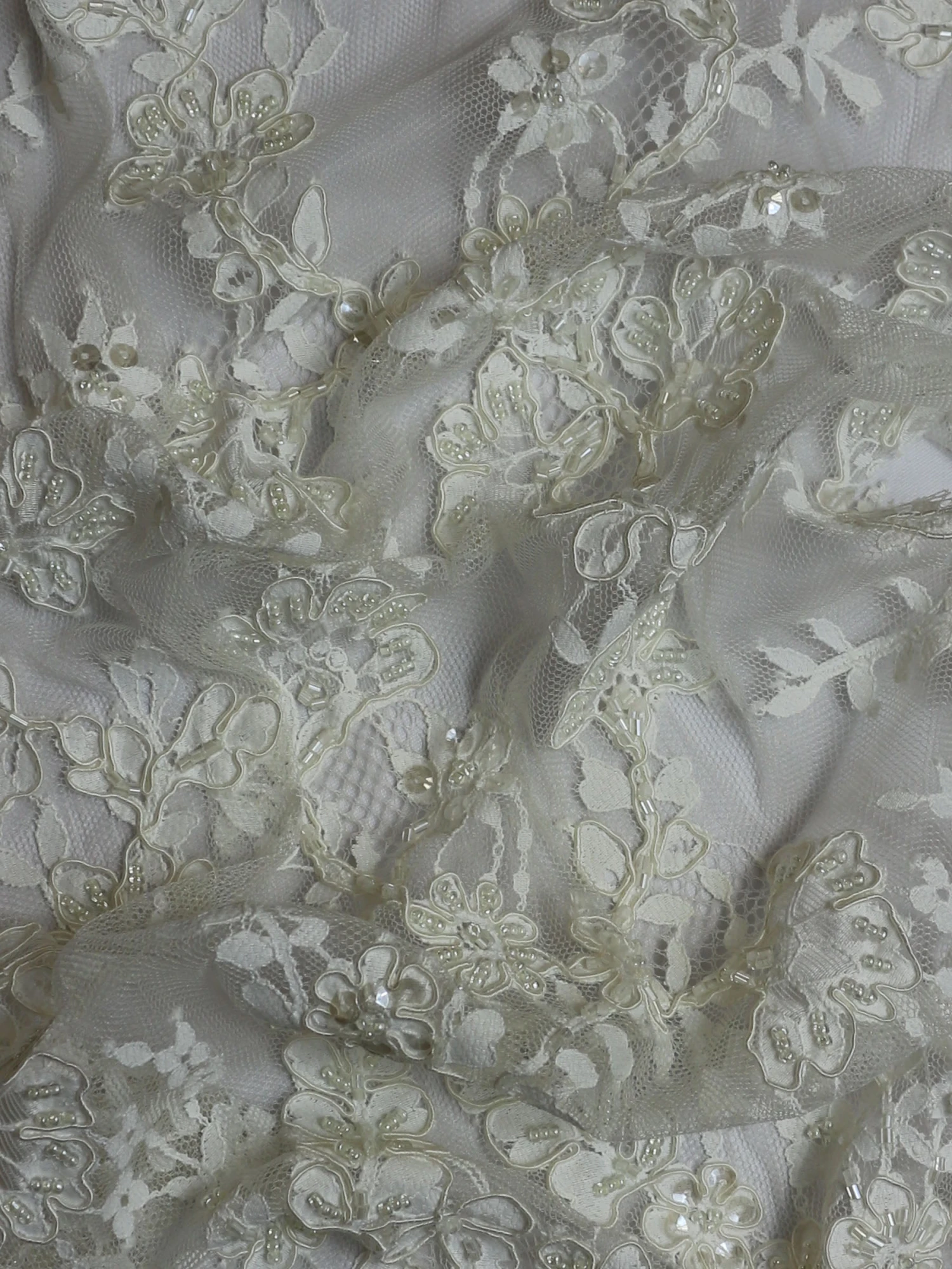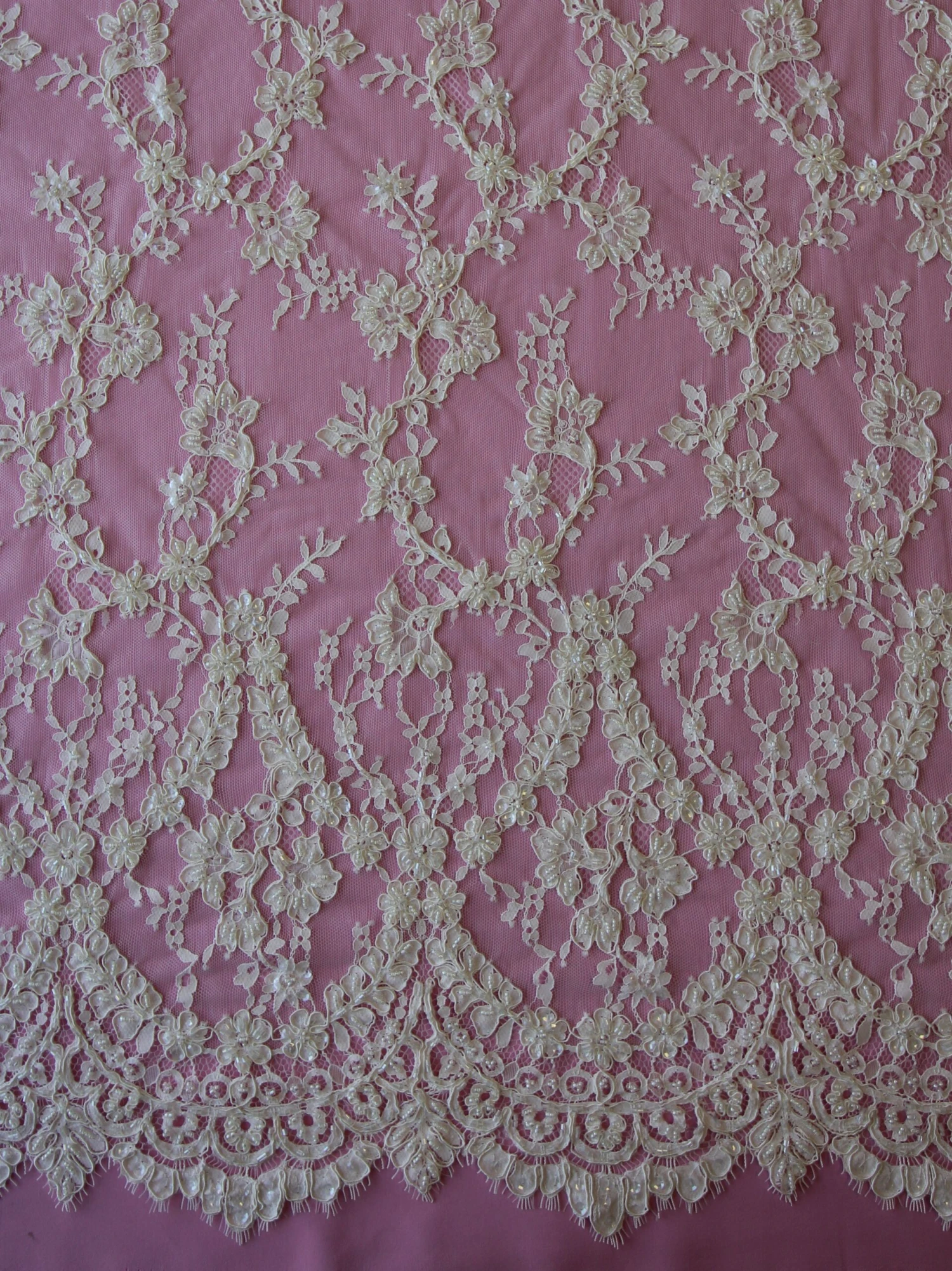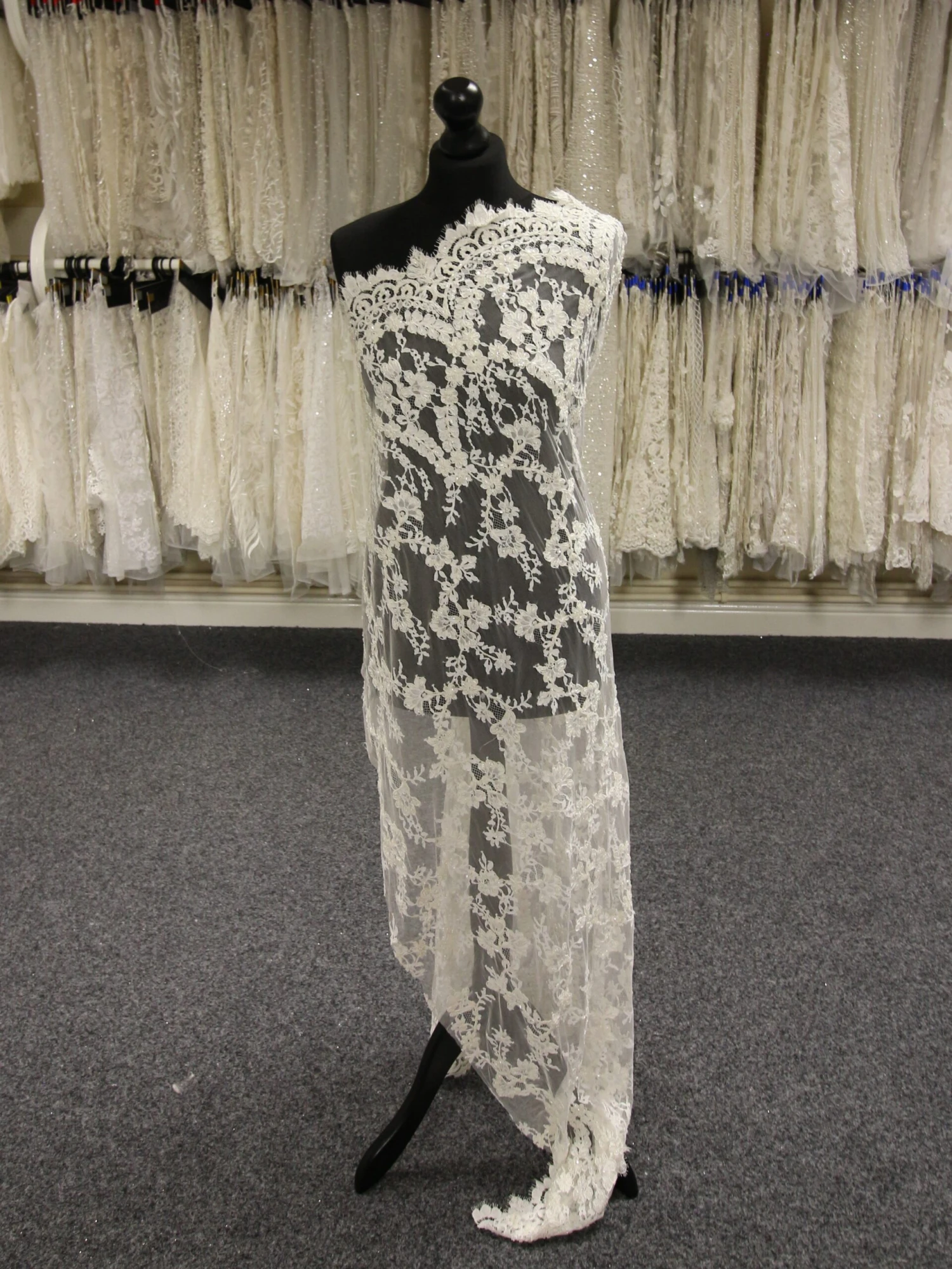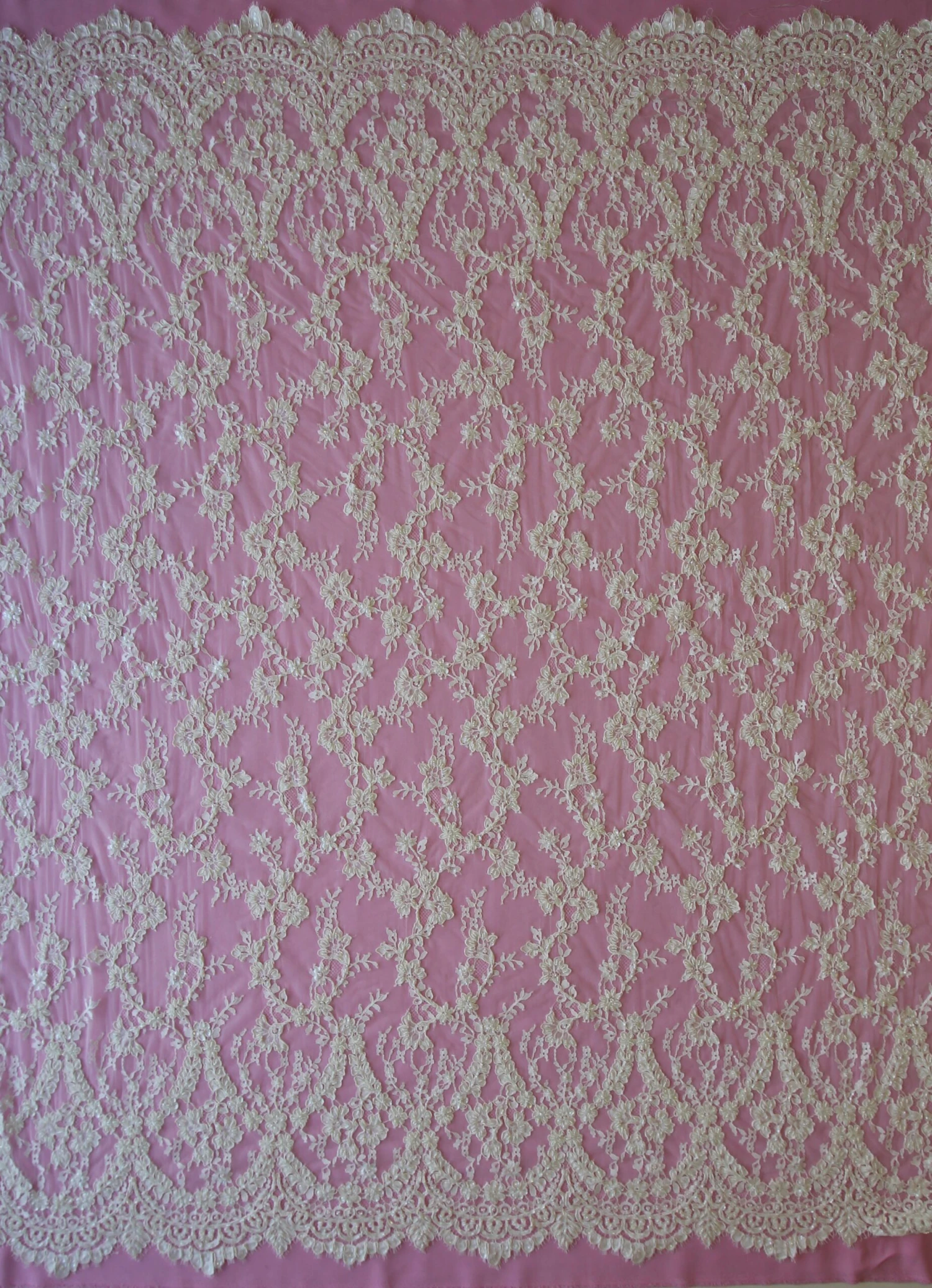 Constance lace measures 132 cm (52″) wide and cries decadence and sophistication but it also has a vintage feel about the design. It has matching scalloped and fringed edges. The background is heavily embroidered to form the petals and leaves an opaque ivory hue. Our designer has then chosen a fine ivory cording to adorn the edge of the leaves and petals and has also used a variety of different beads and sequins to give some real glamour.