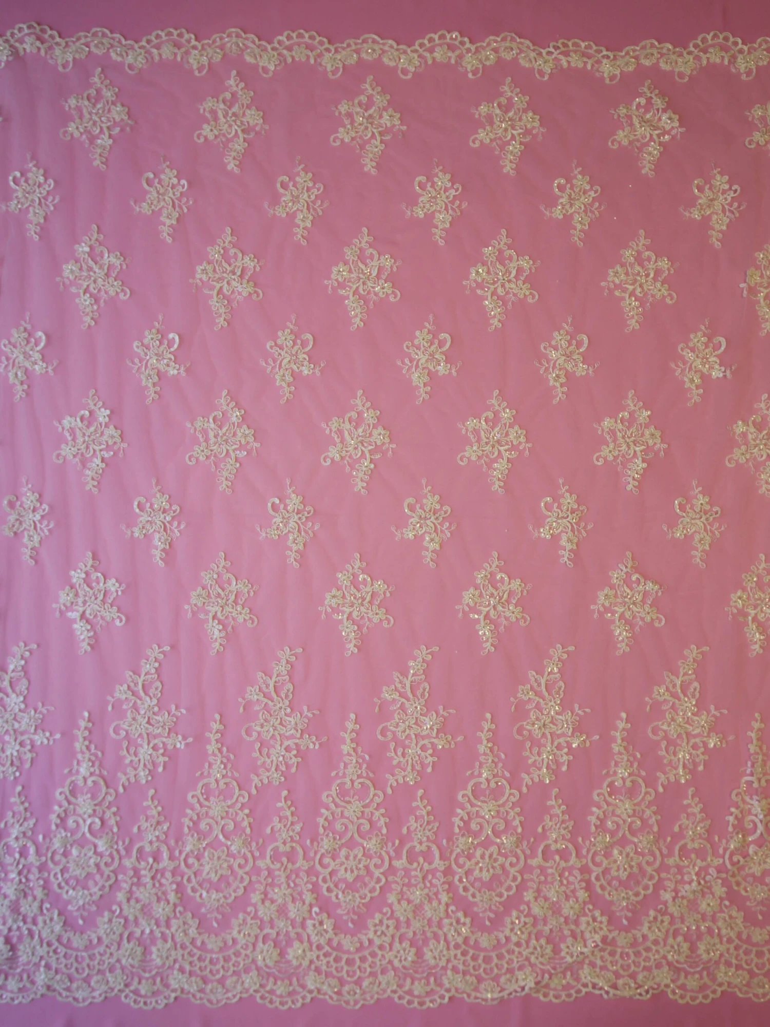 The floral motifs are finely corded with sequins, beads and diamantes. Both borders have a scalloped edge, but are not symmetrical. The narrowest border has a depth of 6 cm (2.5″) and the other ‘main’ border has an astonishing depth of 30 cm (12″).