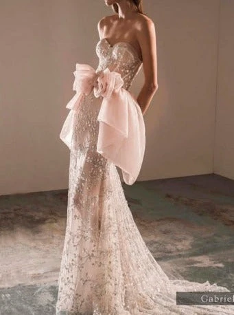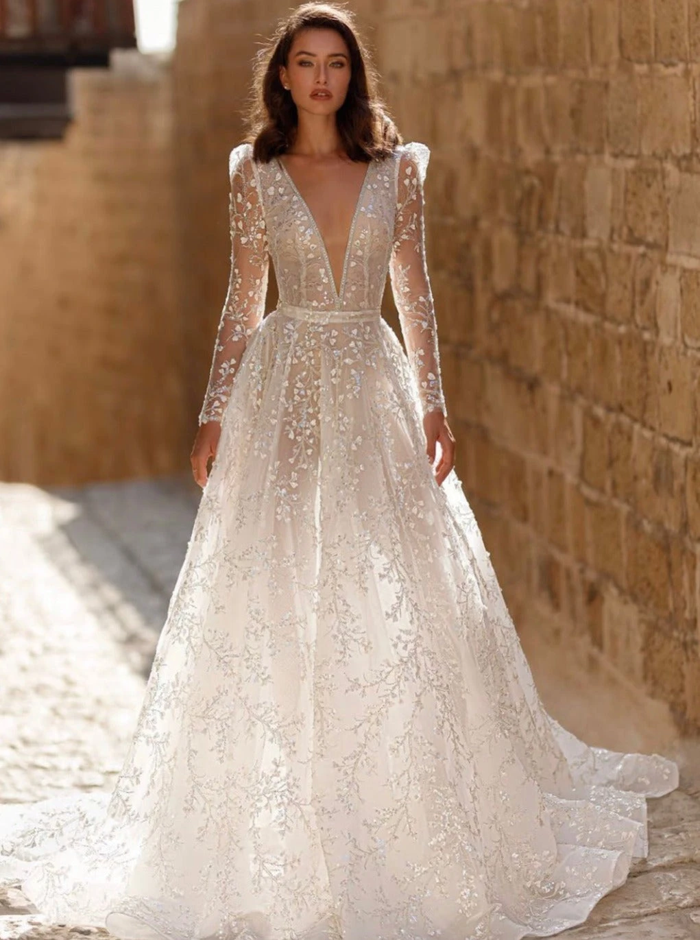 An ivory tulle that has been spectacularly embellished with 3D petals, beads and sequins to form a dramatic and contemporary design.