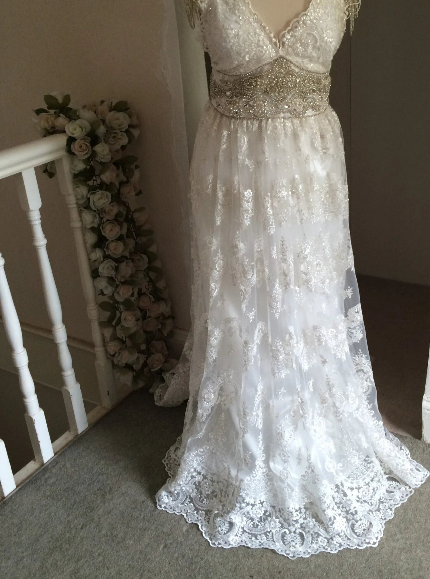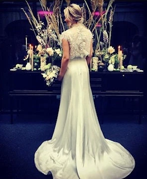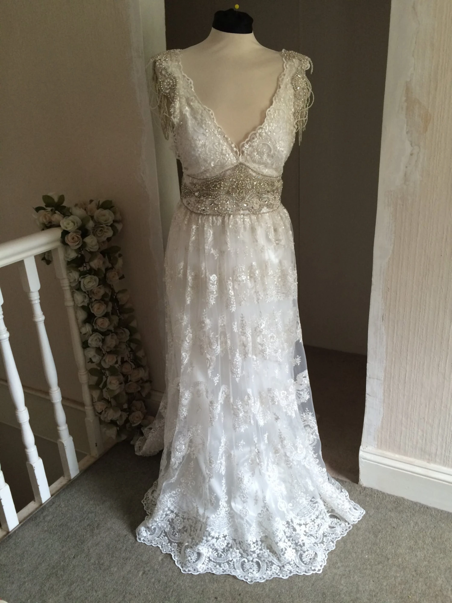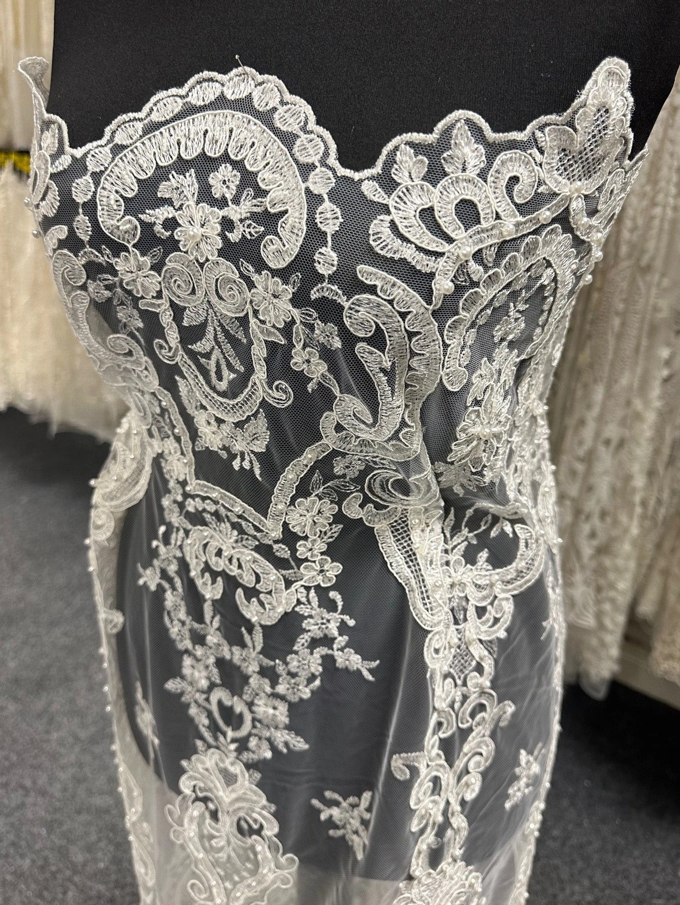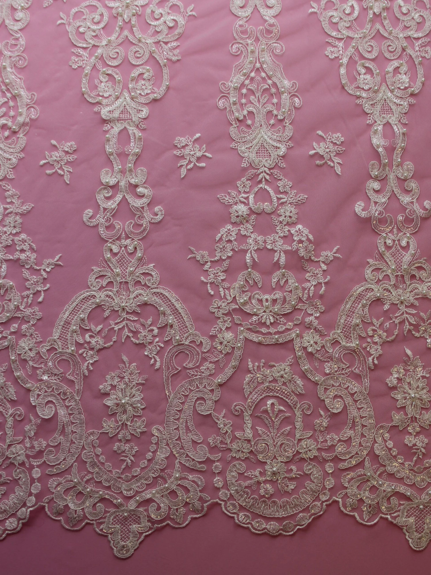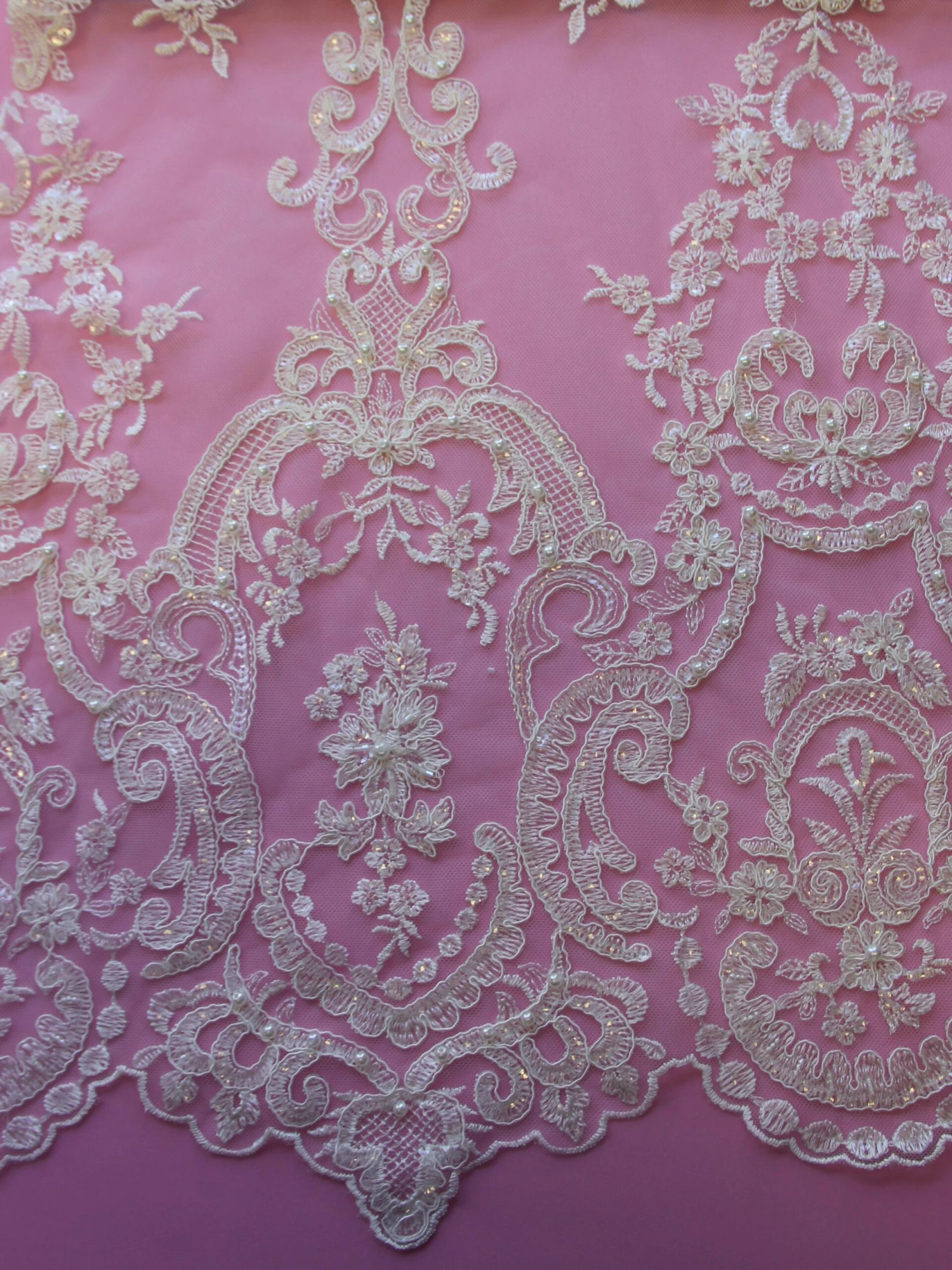 A spectacular, elegant bridal lace that measures 132 cm (52″) wide. Our designer has embellished a soft ivory tulle with ivory embroidery to form a vintage looking pattern. The embroidery has been further embellished with pearls, beads and subtle colourless sequins, that just give the lace a little shimmer.