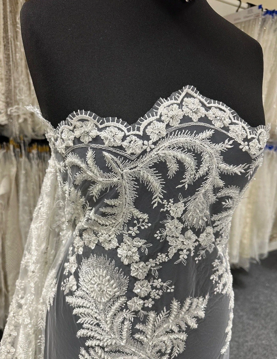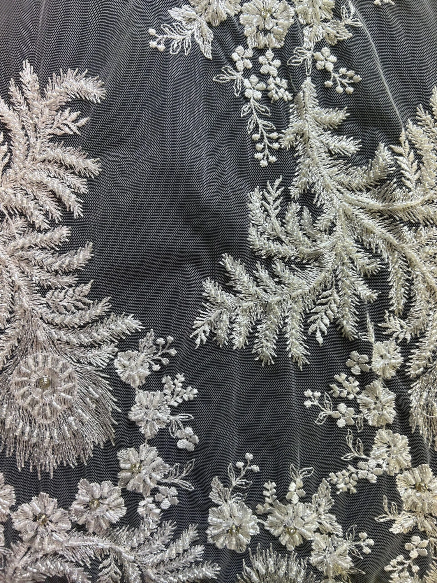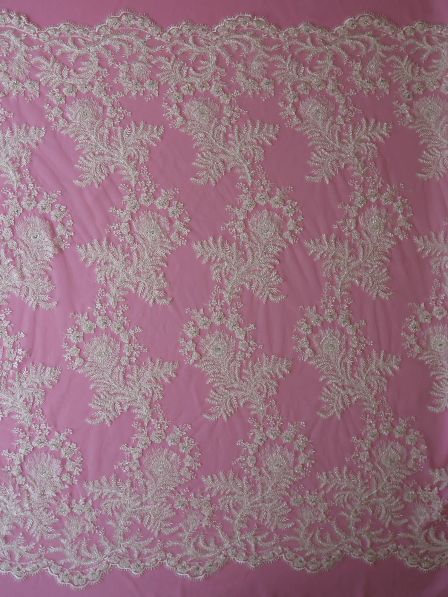 Both edges are scalloped and match one another. Our designer has elegantly embroidered an ivory tulle and then embellished it with different shapes of beads, sequins and diamantes.The borders stretch into the lace approx 30 cm (12″). The motifs flow beautifully through the body of the lace and interlink so it’s hard to know where one starts and the next finishes. From the top of one motif to the top of the next one is approx 30cm (12″)